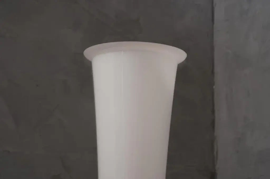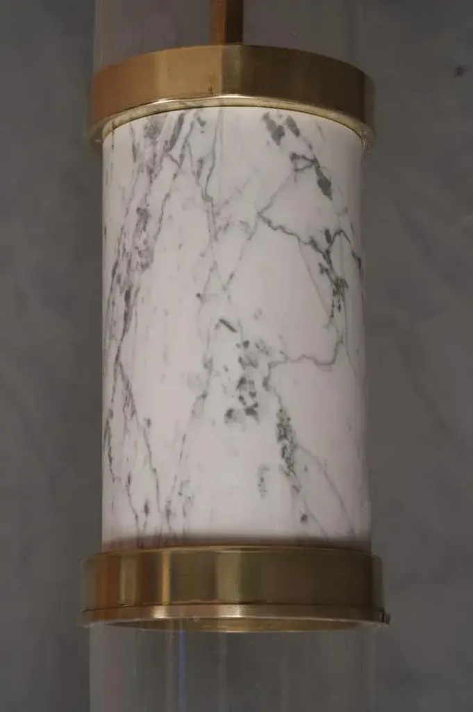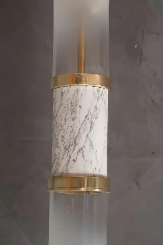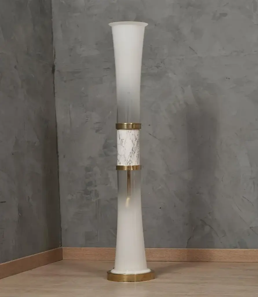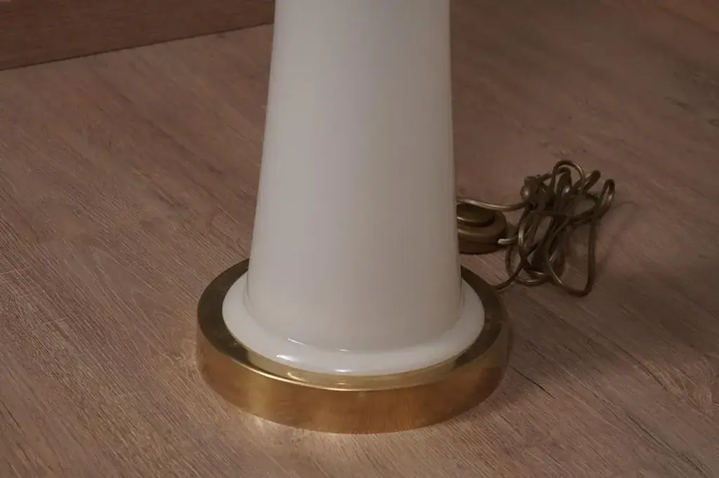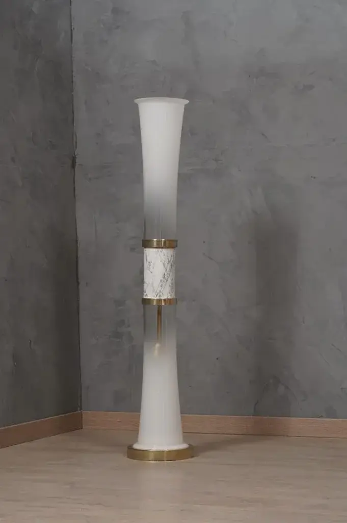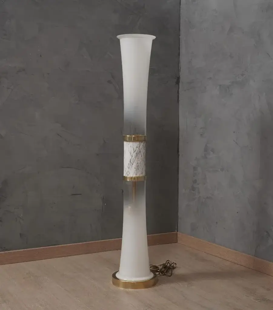 Very original floor lamp in Murano glass, Carrara marble and brass. Use of unusual materials for a one-of-a-kind floor lamp. The brass stands out above all this white marble and glass. The floor lamp is made up of a series of overlapping pieces. Starting from the bottom, a shaded white Murano glass cone is positioned above the brass base. Above this is a Carrara marble cylinder dug inside to make it lighter; still above this is another Murano glass cone upside down with respect to the other. The three pieces are interspersed with polished brass finishes. The bulbs are inside both the low and the high glass cone. Note the nuance that the glass has, which goes from transparent to white. European Plug (up to 250V).The wiring of this item may be original and might need replacement, if not specified otherwise.