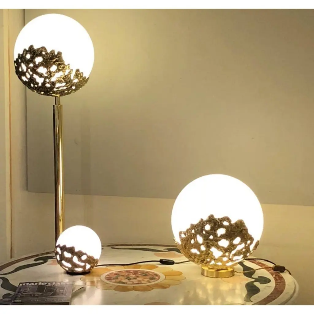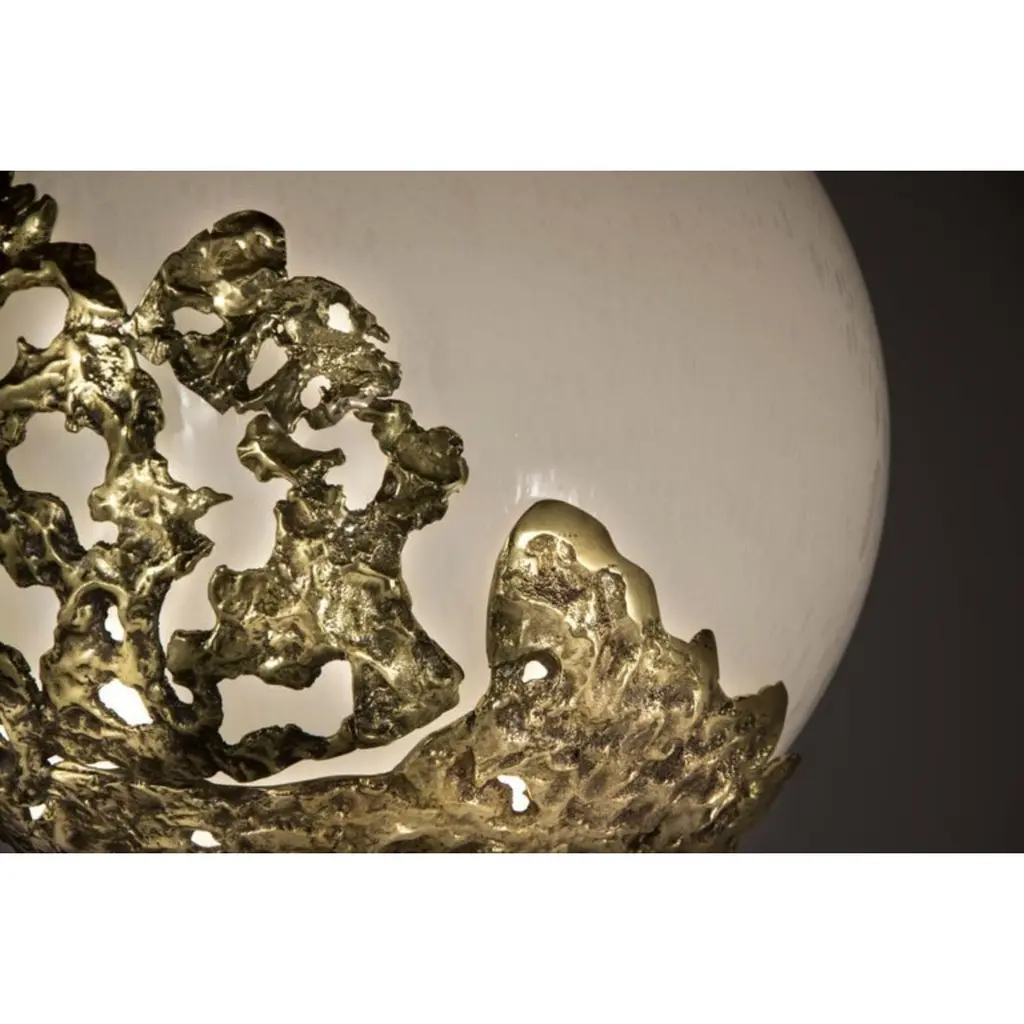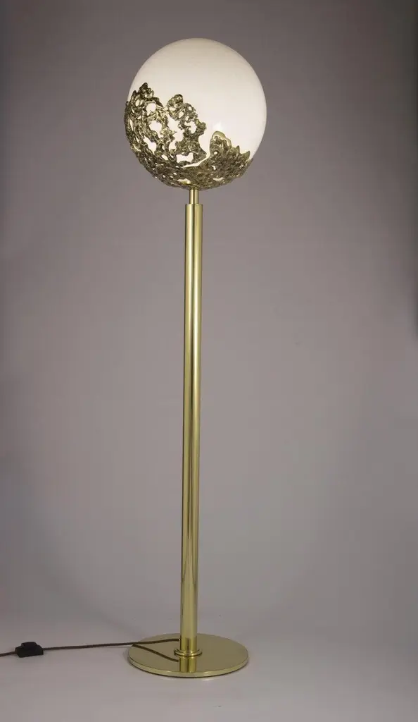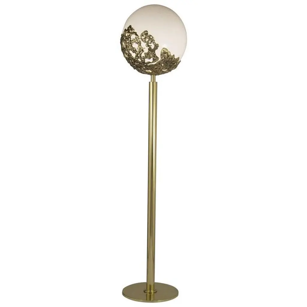 Murano glass "Lucilla" floor lamp - Angelo BrottoDimensions: 175 height x 43 diameter cmMaterials: brass, Murano glassDesigned by Angelo Brotto in 1976. Floor lamp polished brass strcuture. Spherical diffuser in Murano milk glass and artistic brass casting.