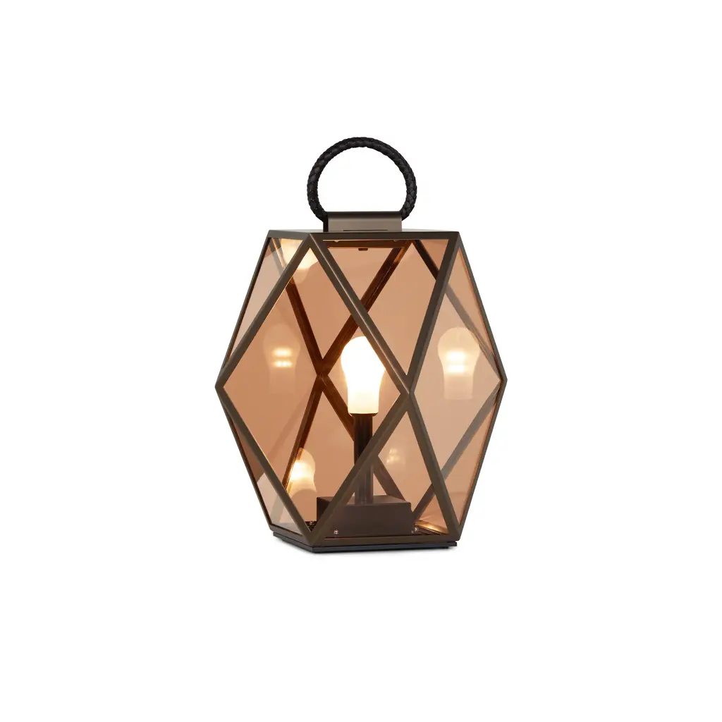Muse Lantern Outdoor can be battery operated or wired. In the wired version, the light source is placed inside a glass cylinder which is suitably sealed to ensure IP65 protection. The new battery model maintains the characteristics of the lantern but with a more sophisticated touch: the light source has a new look that makes it much more contemporary and captivating. The simulation of the light bulb creates an alternation of lines, giving it a more modern appearance, while also guaranteeing better performance. Both versions are now available in small and medium sizes. The bronze finish of the Muse Lantern has been treated to withstand outdoor spaces and atmospheric conditions, with a handle in woven leather. The plastic diffuser in the Outdoor version remains in a transparent amber finish. Features