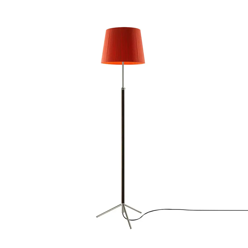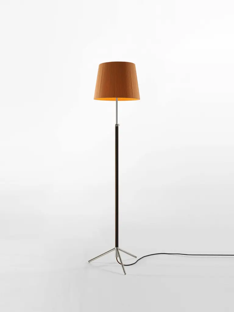Mustard and chrome Pie de Salón G3 floor lamp by Jaume Sans.Dimensions: D 40 x H 120-160 cm.Materials: Metal, leather, ribbon.Available in chrome-plated or polished brass structure.Available in other shade colors and sizes.This slender synthesis of traditional lamps is a sparkle of timeless elegance created in a context of the avant-garde. The combination of materials with its symmetrical, leather-wrapped centre shaft, its choice of three shade materials and eight colour options make it a paradigm of industrial craftsmanship.Height adjustable lampshade.Dimmer included.Santa & Cole is a small, independent and global editor of design products, with its roots in Belloch (Barcelona, Spain). We have been editing since 1985, when the company was first founded. By editing we mean preparing a work for the public domain, we mean adapting an item for everyone’s use. What a book editor does with stories, we do with objects.More than eighty creators have contributed to a rich catalogue of furniture and lighting products originating in very different contexts, by renowned designers such as Antoni Arola, Miguel Milá, André Ricard and llmari Tapiovaara.Acute and attentive to quality and detail, Santa & Cole outsources all of its industrial production to an extensive network of suppliers, mainly in Spain, but also in other countries such as Japan, where the washi paper for our Tekiò lamp is made.Our mission is to build, safeguard and disseminate knowledge through design objects. Objects whose quality is recognisable at the touch of a hand, and that enrich people’s lives, whether at home or in shared environments. Our philosophy is more modern than futurist and we are more intrigued by silence than by stridency.Our focus is not the present market, but the future one; not Barcelona, but the world; not fashion, but history.All our lamps can be wired according to each country. If sold to the USA it will be wired for the USA for instance.