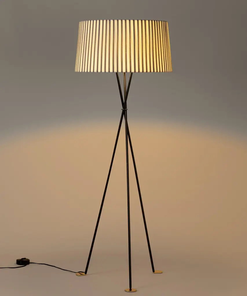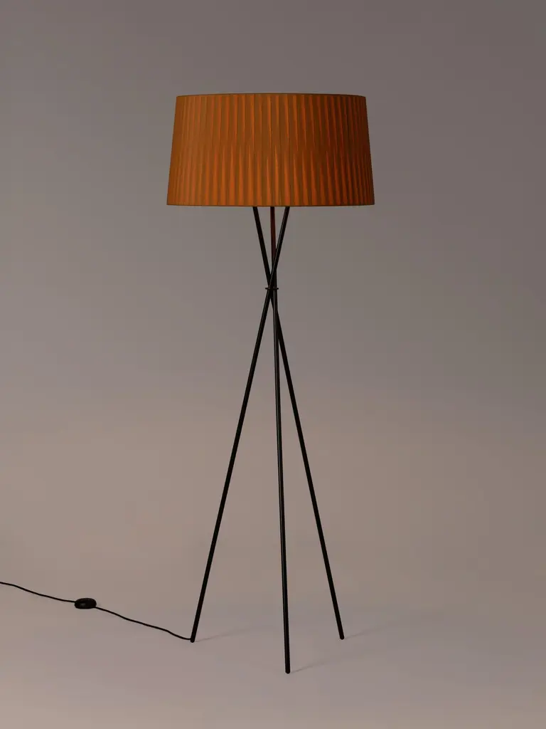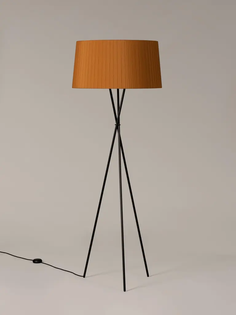 Mustard Trípode G5 floor lamp by Santa & ColeDimensions: d 62 x h 168 cmMaterials: Metal, ribbon.Available in other colors.Trípode humanises neutral spaces with its colourful and functional sobriety. The shade is hand ribboned and its base could not be more stable. Switched on, it provides a characteristic, warm light, rich in nuances. Switched off, it is a small volumetric sculpture that invites immediate use.Dimmer included.Santa & Cole is a small, independent and global editor of design products, with its roots in Belloch (Barcelona, Spain). We have been editing since 1985, when the company was first founded. By editing we mean preparing a work for the public domain, we mean adapting an item for everyone’s use. What a book editor does with stories, we do with objects.More than eighty creators have contributed to a rich catalogue of furniture and lighting products originating in very different contexts, by renowned designers such as Antoni Arola, Miguel Milá, André Ricard and llmari Tapiovaara.Acute and attentive to quality and detail, Santa & Cole outsources all of its Industrial Production to an extensive network of suppliers, mainly in Spain, but also in other countries such as Japan, where the washi paper for our Tekiò lamp is made.Our Mission is to build, safeguard and disseminate knowledge through design objects. Objects whose quality is recognisable at the touch of a hand, and that enrich people’s lives, whether at home or in shared environments. Our philosophy is more modern than Futurist and we are more intrigued by silence than by stridency.Our focus is not the present market, but the future one; not Barcelona, but the world; not fashion, but history.All our lamps can be wired according to each country. If sold to the USA it will be wired for the USA for instance.