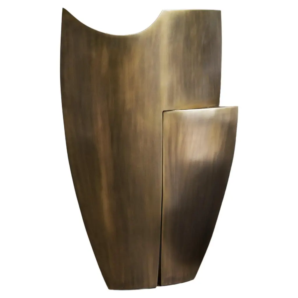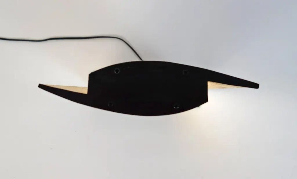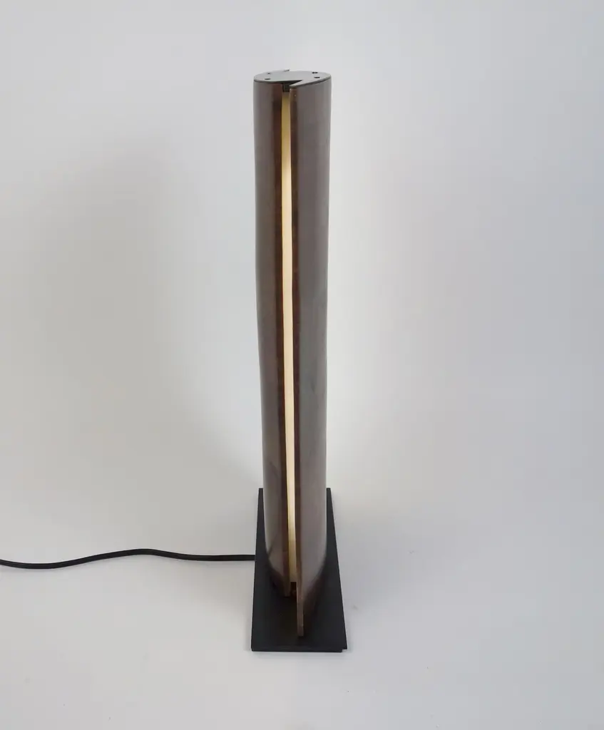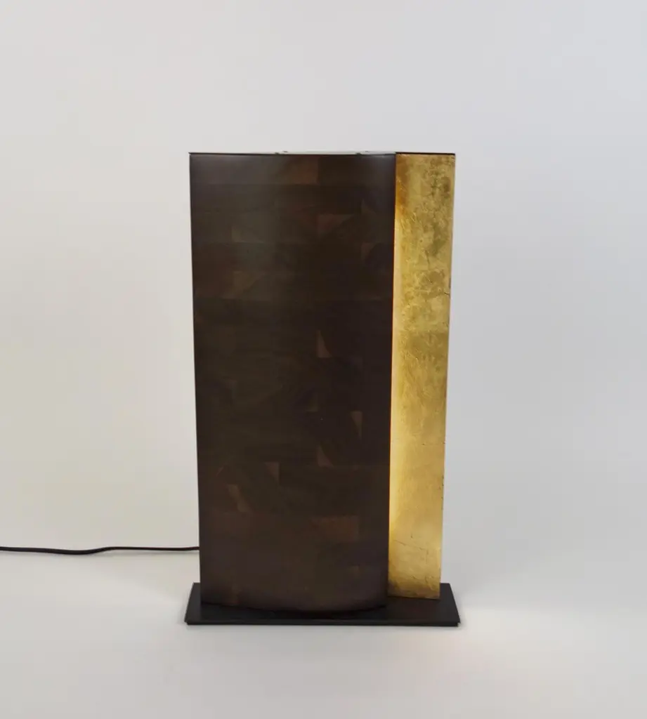 N2 Panel Lamp by Aaron ScottDimensions: D 11.5 x W 34.5 x H 57.5 cmMaterials: Walnut, blackened steel, acrylic, LED lamps, gold leaf.Also available in other woods: bleached walnut. All our lamps can be wired according to each country. If sold to the USA it will be wired for the USA for instance.Brooklyn-based designer Aaron Scott was raised in the mountains and forests of Southwest Oregon. He studied philosophy at the University of Colorado,Boulder, followed by fine art at the San Francisco Art Institute. Since moving toNYC in the late 90s Scott has worked in a variety of mediums – film, sculpture,writing and furniture design. Drawing inspiration from nature, science andmathematics, Scott’s work explores relationships of space, light and movement.Using a meticulous, labor-intensive process that relies on the hand and the eye, improvisation and experimentation, Scott has developed a body of sculptural furniture characterized by complex geometries, rotational symmetry and unconventional engineering. Since the early 2000s Scott’s furniture has been built using the stacked-laminate method – a technique that relies on the careful laying-out of alternating grain patterns on parallel pieces of wood, overlapped in successive layers. The process is both additive and subtractive. In the first stage the rough form is built by stacking glued-up layers, each corresponding to a given point on the x, y or z axes. These layers, laminated together in a stair-like or topographical form, are then sculpted with handheld power tools to obtain the final, smooth surface. With each new piece Scott attempts to push the boundaries of the medium of wood and his own imagination, posing and re-posing the question to himself: Which parts of the form are essential and which can be removed?