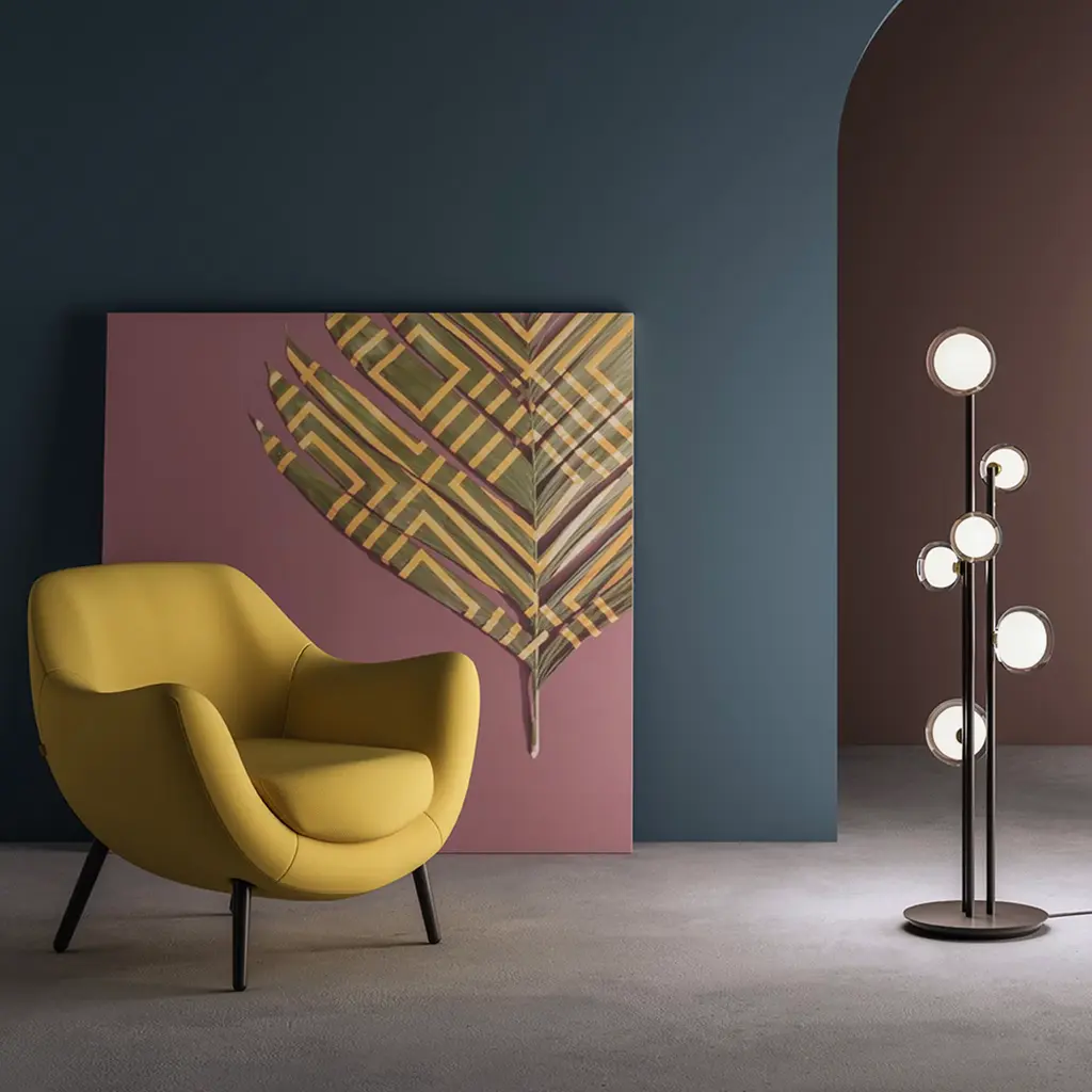 A collection inspired by the 50s the features an elegant and sophisticated lamp representing the detail to enrich any location. A double-sided spherical bright object in borosilicate glass makes these lamps available in different compositions and a structure made by metal coated with epoxy powder enriched with brushed brass or black chrome details. Richness and sobriety all in one single element. The metal structure features a matte black finish, with black chrome details that accompany the smoked glass spheres. The LED light comes from six 10W bulb.