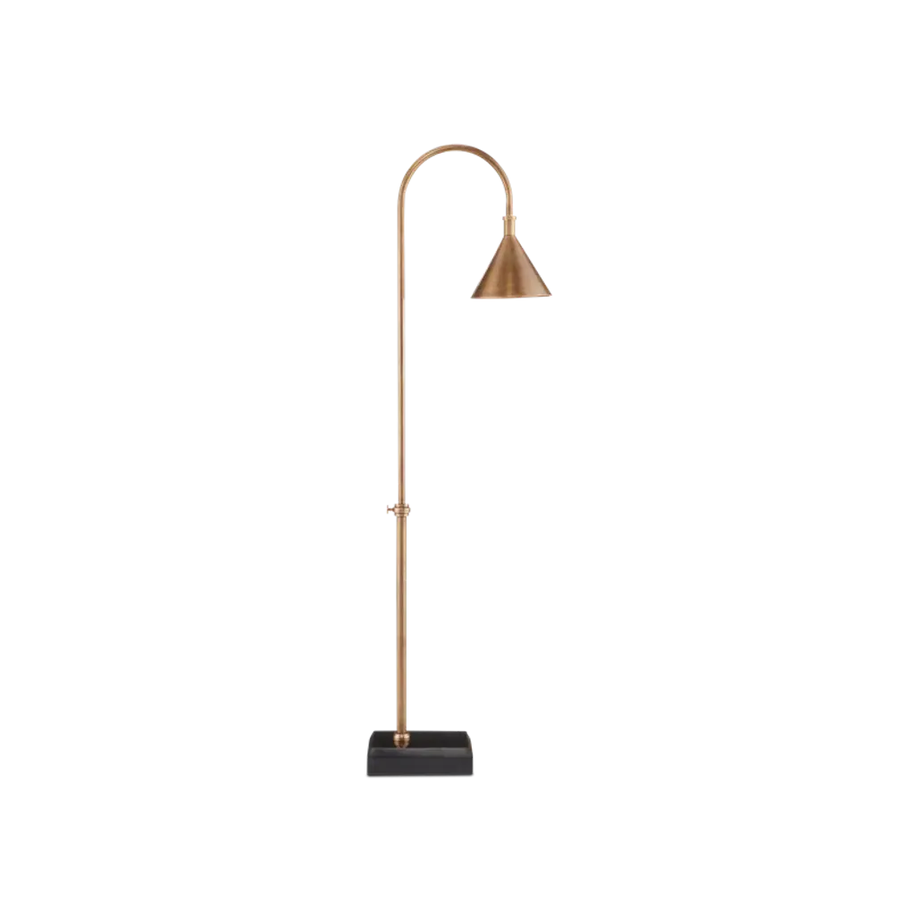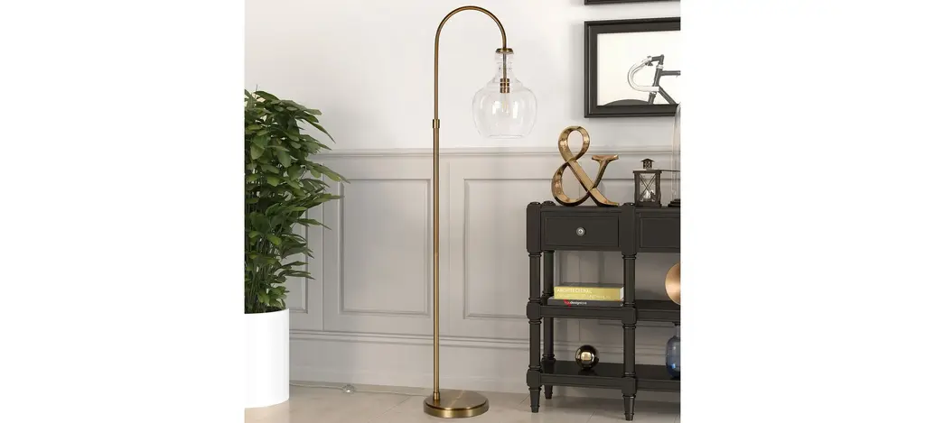 This Nadire brushed brass lamp is an update on mid-century modern design, with an appealing blend of curves and angles. The base is a brushed brass metal. It is paired with a glass dome shade.