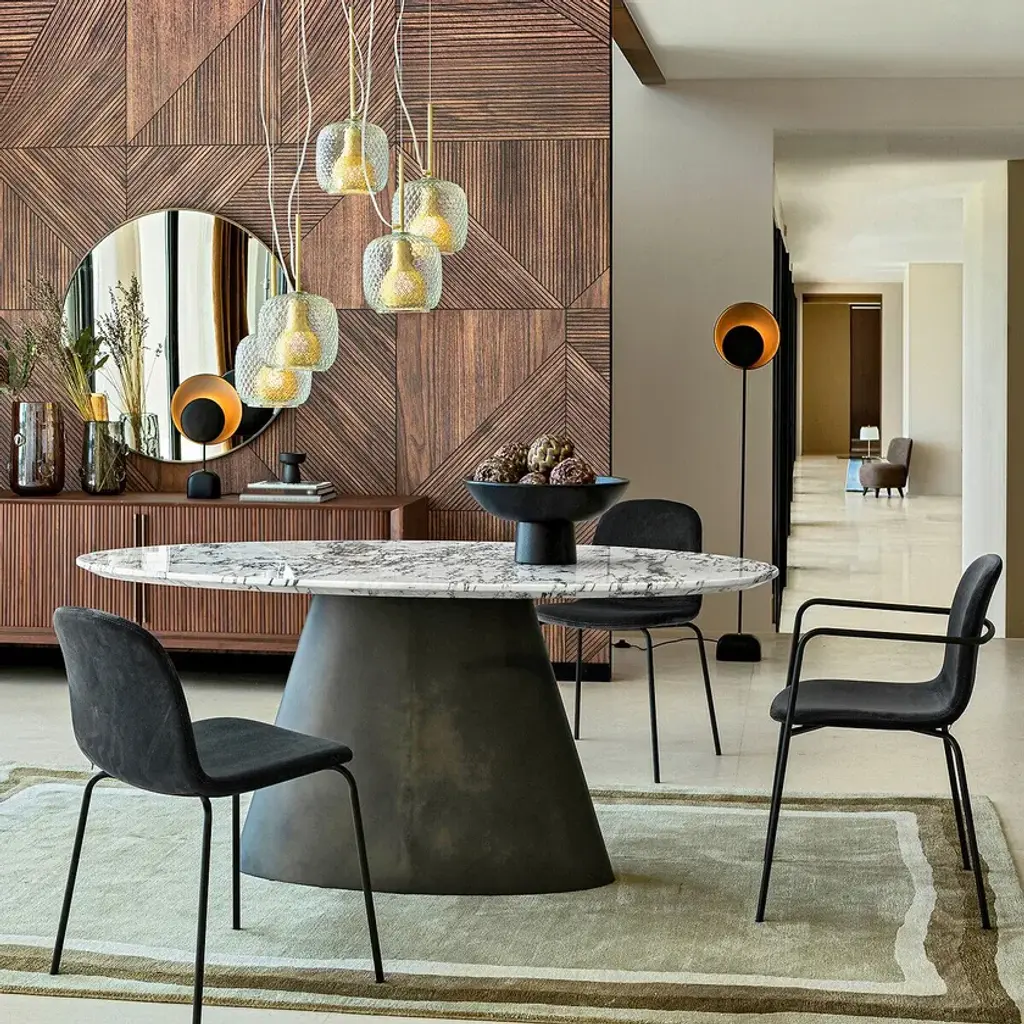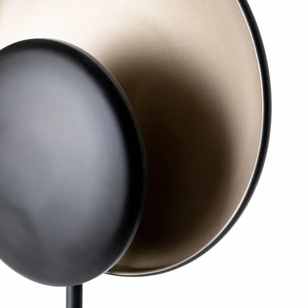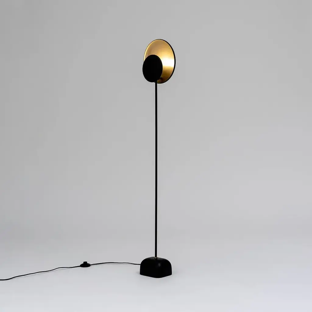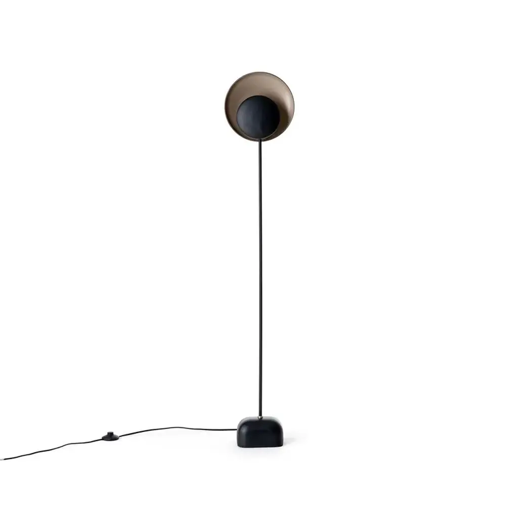 Caught between 2 reflectors as during an eclipse, the light diffused by the Naton floor lamp creates ambient lighting. Finish details: black and mocha metal circles.Made of black and mocha epoxy metaMatt black stained concrete baseE14 lamp holder 8W max, not suppliedPower cable covered in black fabric