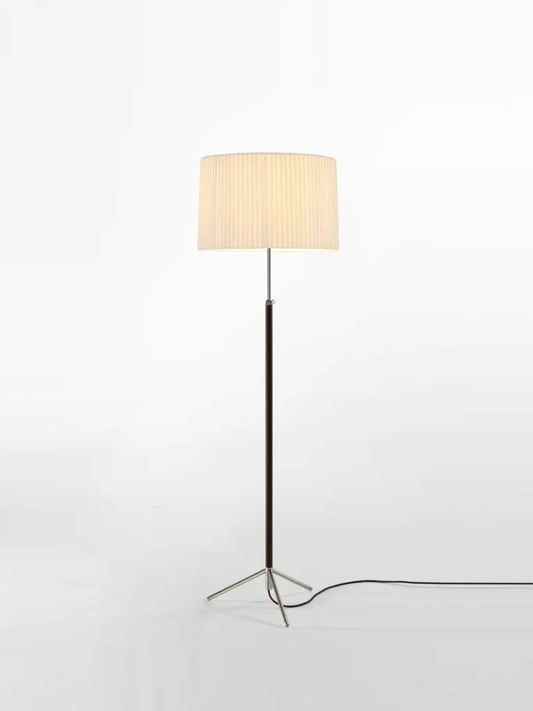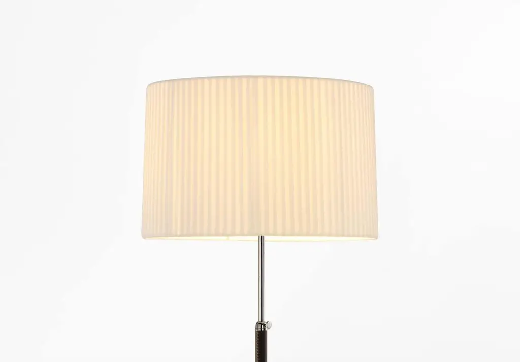 Natural and chrome Pie de Salón G2 floor lamp by Jaume SansDimensions: D 45 x H 120-160 cmMaterials: Metal, leather, ribbon.Available in chrome-plated or polished brass structure.Available in other shade colors and sizes.This slender synthesis of traditional lamps is a sparkle of timeless elegance created in a context of the avant-garde. The combination of materials with its symmetrical, leather-wrapped centre shaft, its choice of three shade materials and eight colour options make it a paradigm of industrial craftsmanship.Height adjustable lampshade.Dimmer included.Santa & Cole is a small, independent and global editor of design products, with its roots in Belloch (Barcelona, Spain). We have been editing since 1985, when the company was first founded. By editing we mean preparing a work for the public domain, we mean adapting an item for everyone’s use. What a book editor does with stories, we do with objects.More than eighty creators have contributed to a rich catalogue of furniture and lighting products originating in very different contexts, by renowned designers such as Antoni Arola, Miguel Milá, André Ricard and llmari Tapiovaara.Acute and attentive to quality and detail, Santa & Cole outsources all of its industrial production to an extensive network of suppliers, mainly in Spain, but also in other countries such as Japan, where the washi paper for our Tekiò lamp is made.Our mission is to build, safeguard and disseminate knowledge through design objects. Objects whose quality is recognisable at the touch of a hand, and that enrich people’s lives, whether at home or in shared environments. Our philosophy is more modern than futurist and we are more intrigued by silence than by stridency.Our focus is not the present market, but the future one; not Barcelona, but the world; not fashion, but history.All our lamps can be wired according to each country. If sold to the USA it will be wired for the USA for instance.
