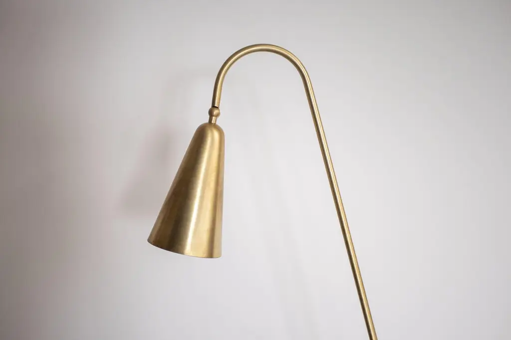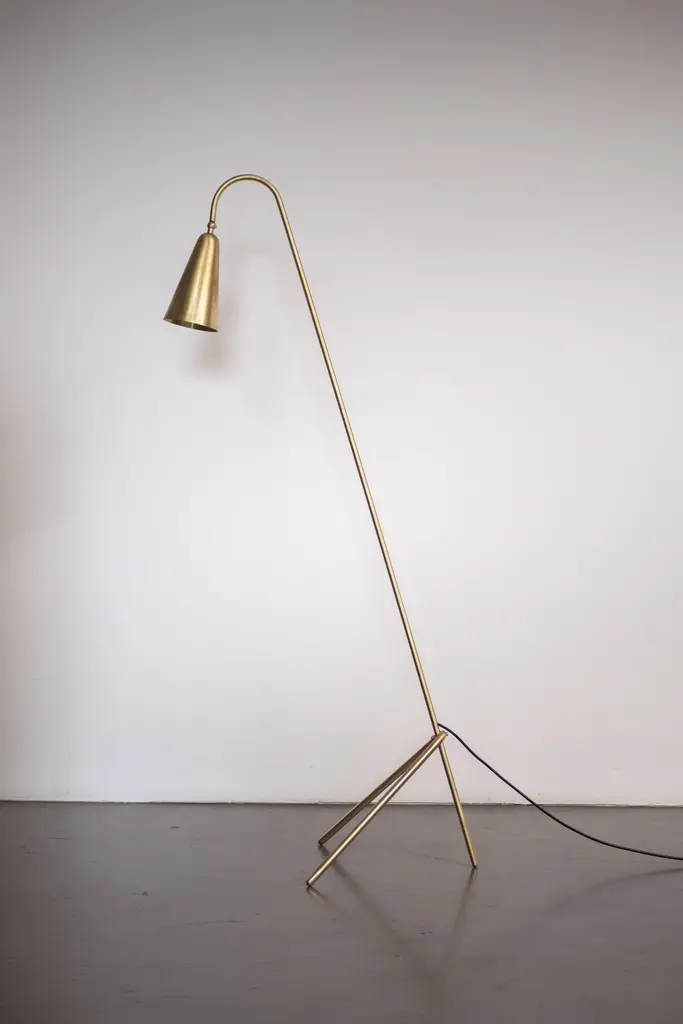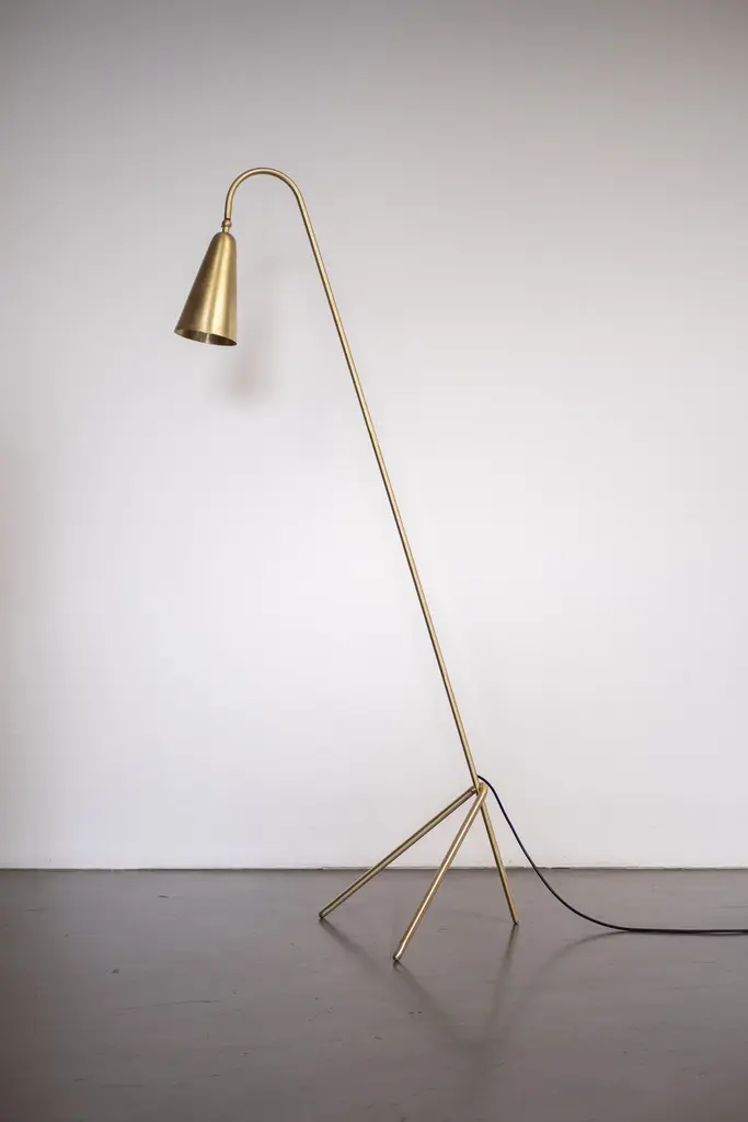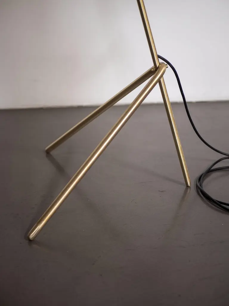 Handcrafted floor lamp model "Thinkerbell", made in brass; with its sober and elegant design, this piece perfectly fits into modern-contemporary context.The light source consist of one E-27 bulb.The lamp is 145cm high, its total depth is 55,9cm and its width is 41,4cm.Shown here in natural brass, Thinkerbell is also available in anthracites and burnished brass.Thinkerbell is provided with UL bulb and technology for US market.The lamp is wired with a black cordset.Proudly Made in Italy, without never forgetting the importance of craftsmanship.