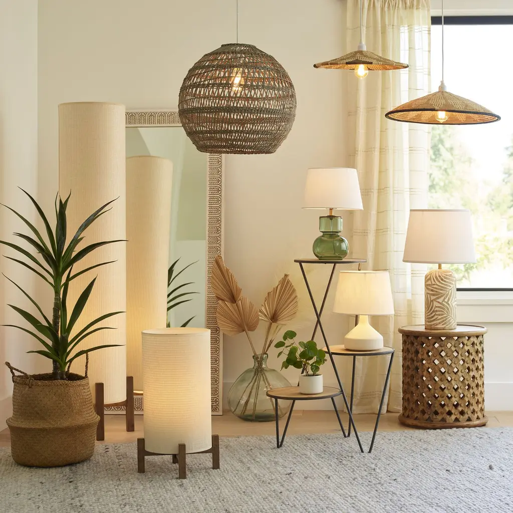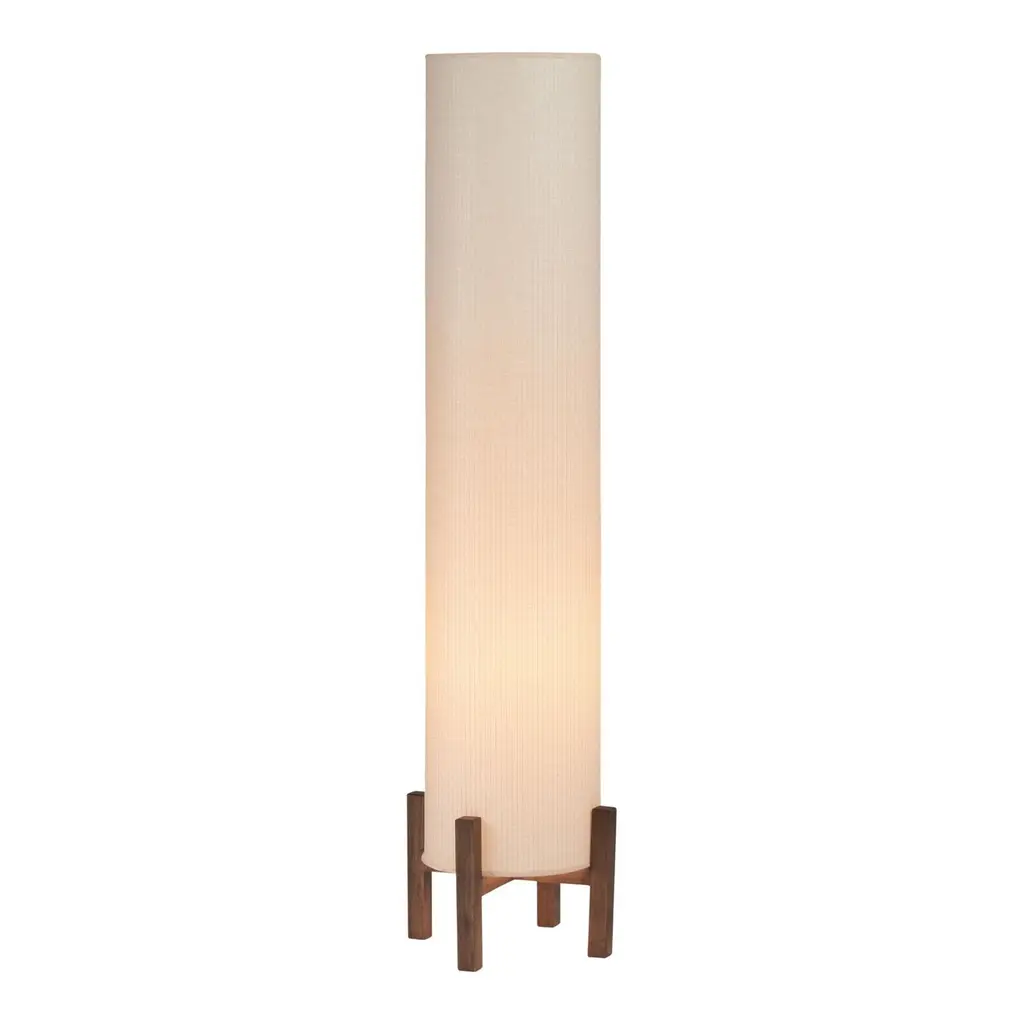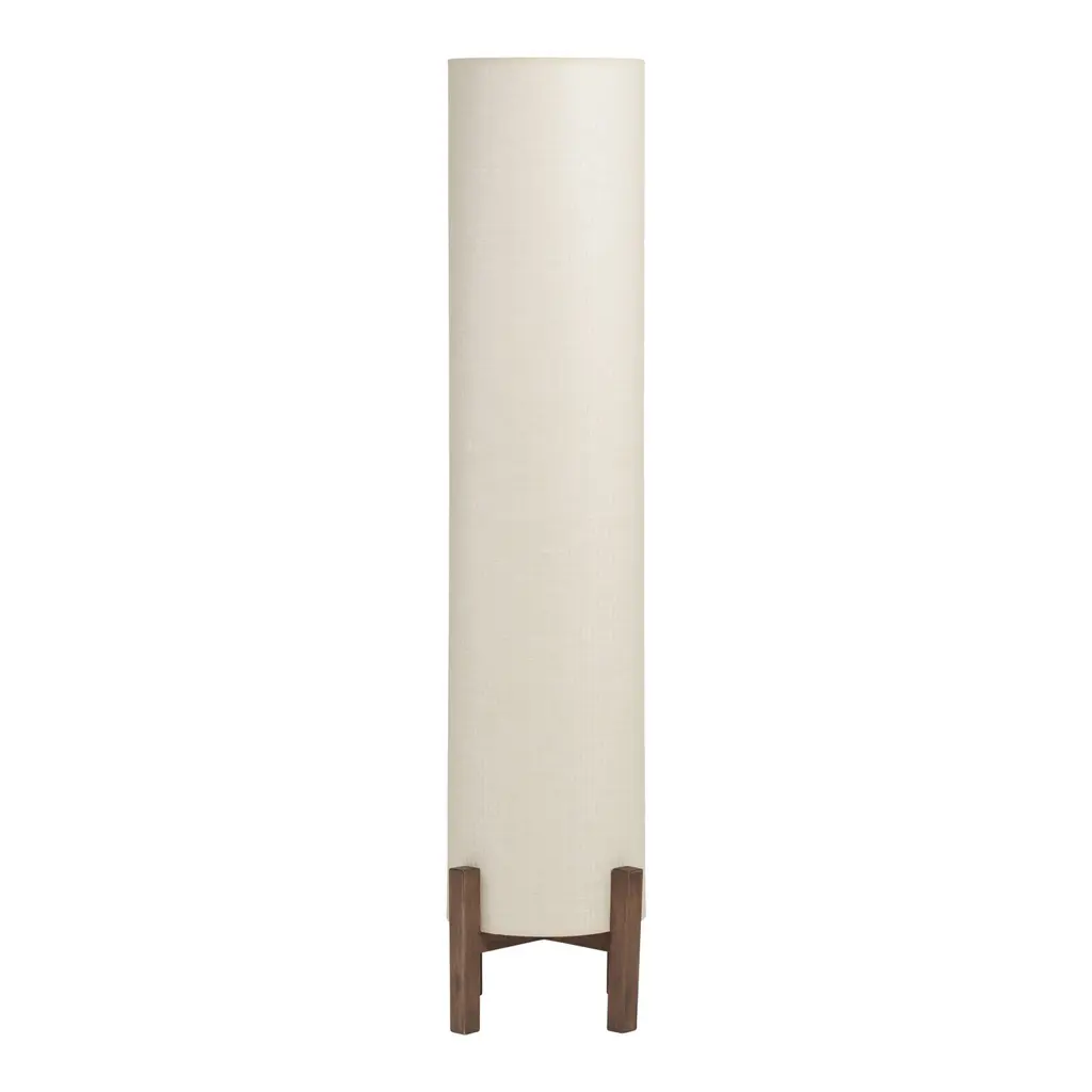Woven of paper rattan by Filipino artisans, our architectural 2-light floor lamp is firmly anchored by a brown wood stand. Cylindrical and minimalist, this natural-fiber pillar lamp illuminates your decor with its warm glowing light.