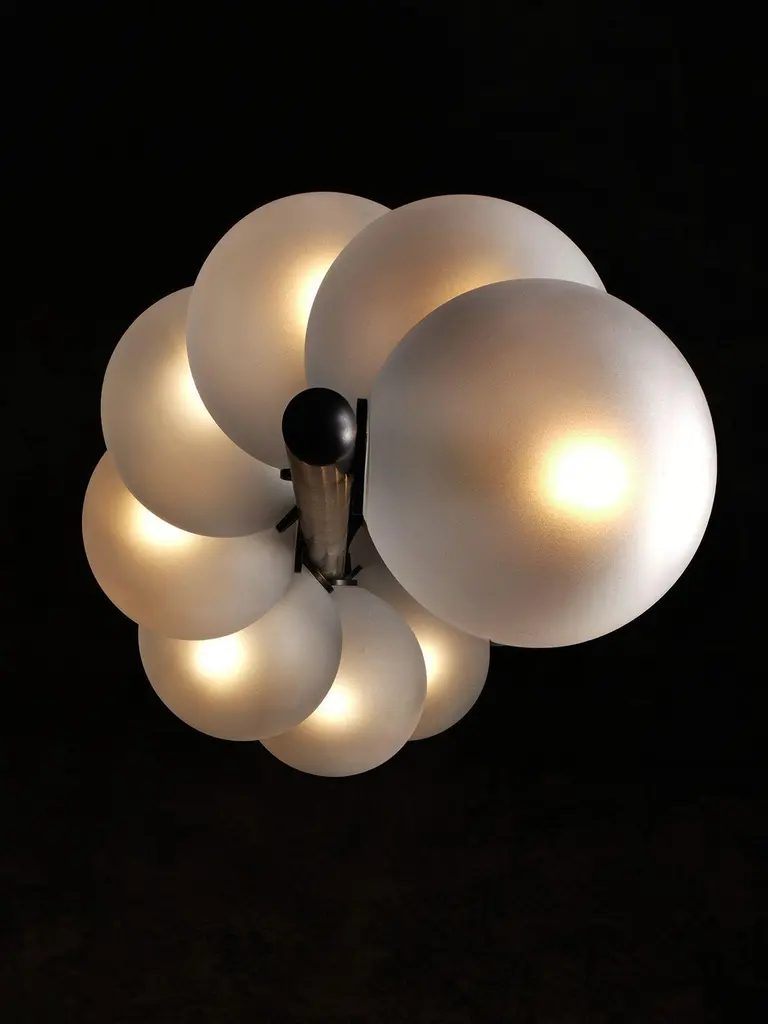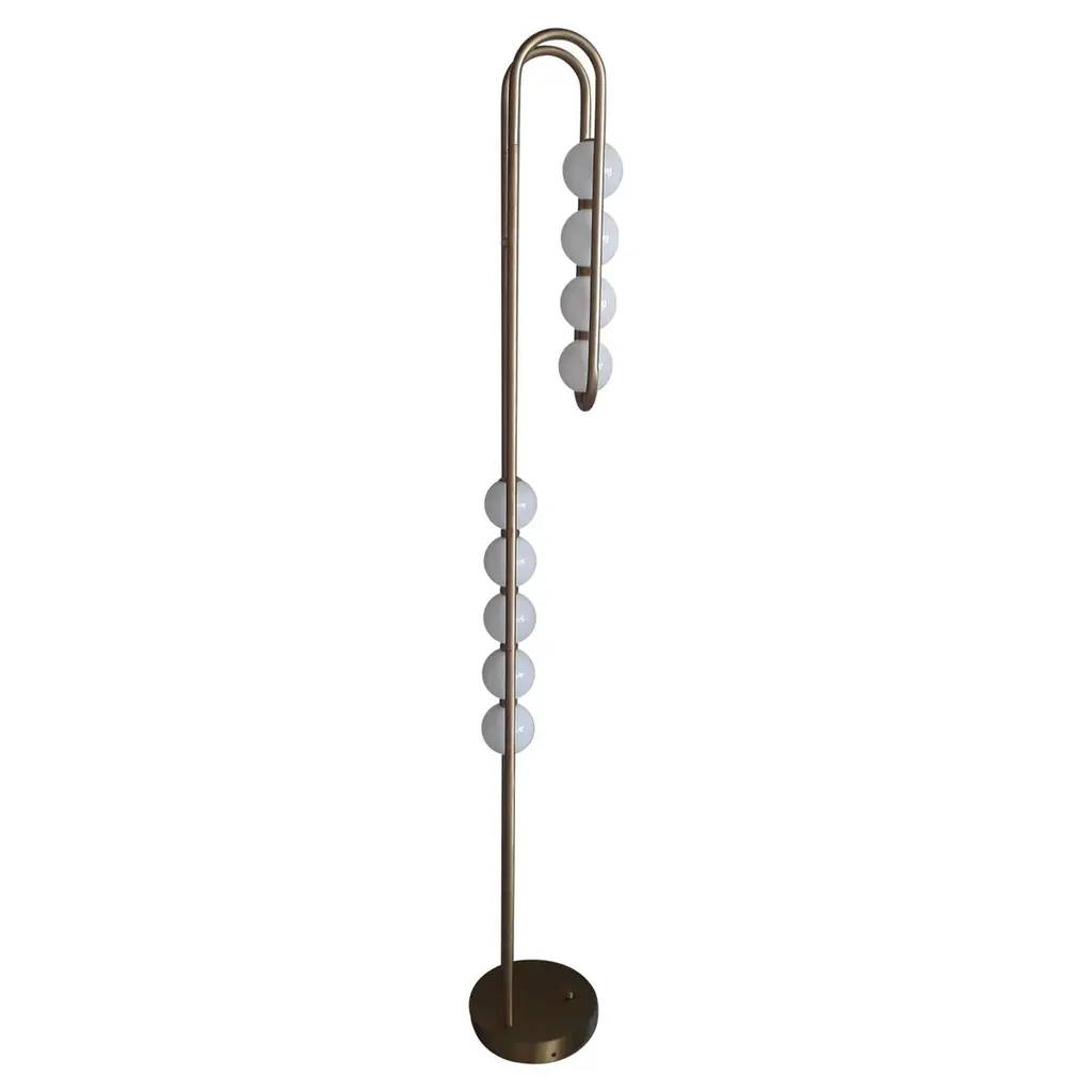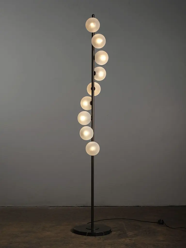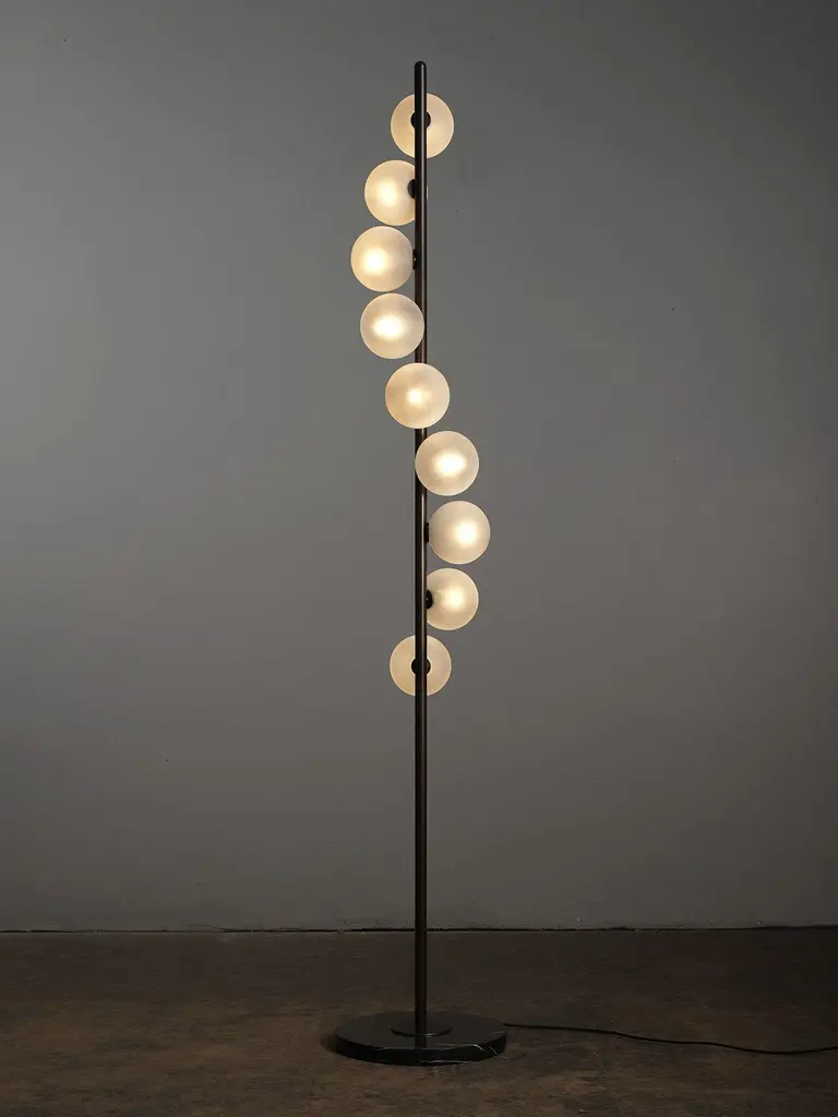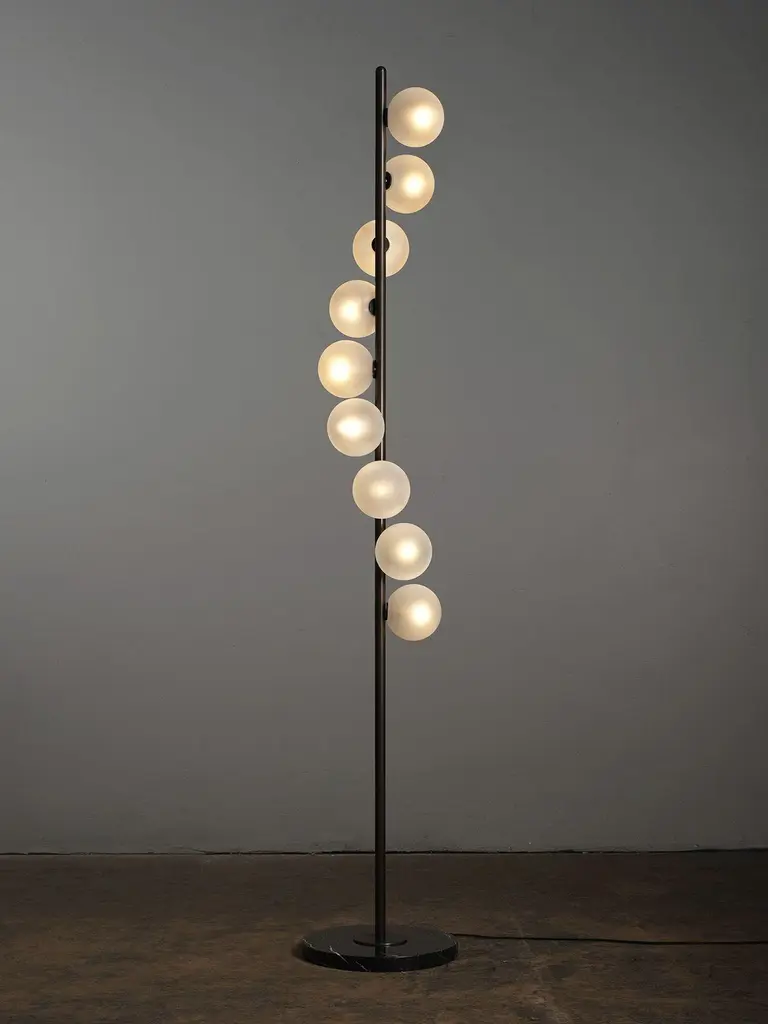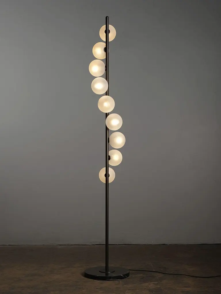 The Nautilus floor lamp by Blueprint Lighting is an elegant piece of functional sculpture that emits a stunning candlelit glow. Featuring satin glass globes spiraling downward, Nautilus is striking enough to be a focal point in a room, but compact enough to place in a forlorn corner that needs a little love! Gorgeous from any angle--even overhead.Fabricated in brass with stain opal blown glass globes. Shown in our hand-finished Oil-Rubbed Bronze, but may be made in any of our 6 in-house metal finishes or 36 in-house enamel colors (all shown in final images).Blown glass globes are 4" diameter and are threaded to screw easily around the socket.Dimensions as shown: 61.5"h x 11" diameter at the base. Shown at 61.5" tall, but height may be edited as needed for your project.Nautilus pairs well with our Harper or Bisou sconces.Fixture as shown has nine (9) G9 sockets (halogen-style socket with 2 pins). We recommend G9 LED bulbs in a T4 shape : 5w LED with 60 watt equivalent. Bulbs not included.All Blueprint Lighting products are UL-listed.