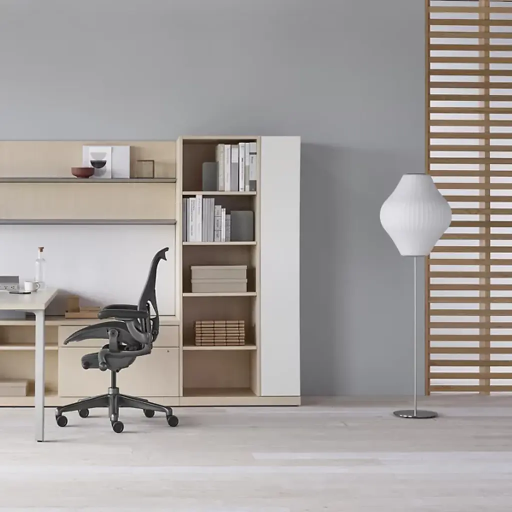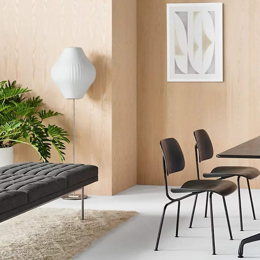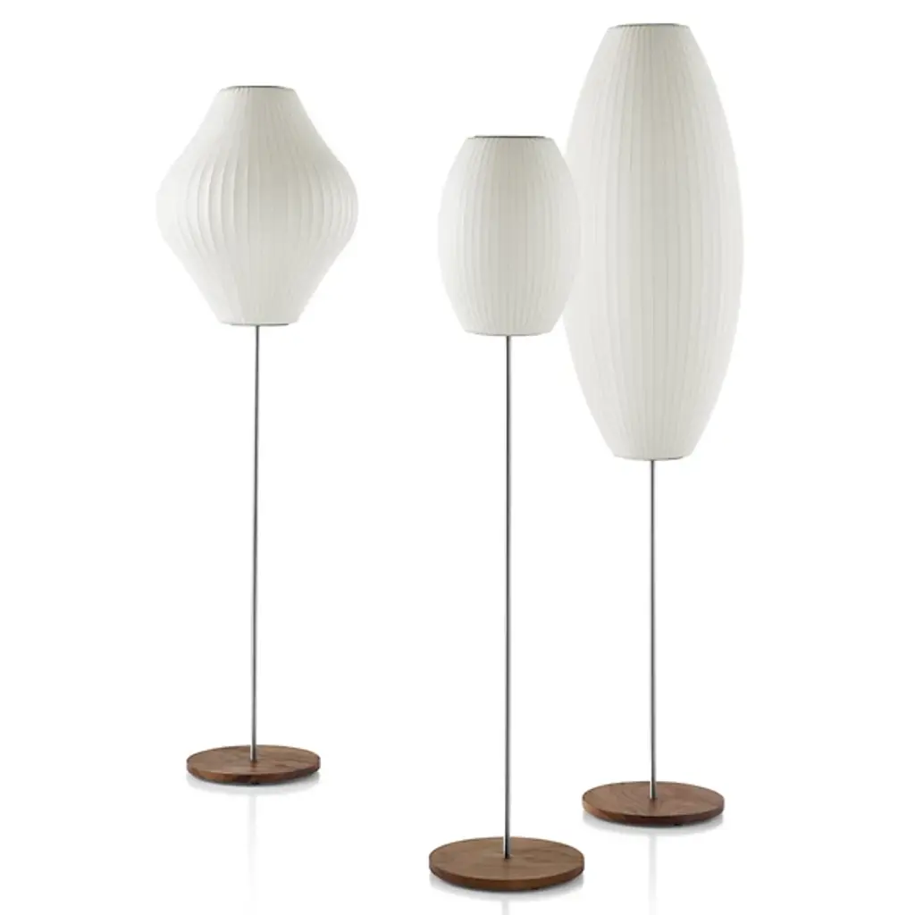 The Nelson Bubble Lamps by Herman Miller are instantly recognizable as important pieces of mid-century modern design, and can even be found in the permanent collection of the MoMA in New York. Introduced in 1952, the Nelson Pear Lotus Floor Lamp features the famed spray-coated plastic material that hugs a steel wire frame, and stands on a tall stem with an either Brushed Nickel or Walnut base. The result is a softly diffused light that is integral to the iconic nature of the design.