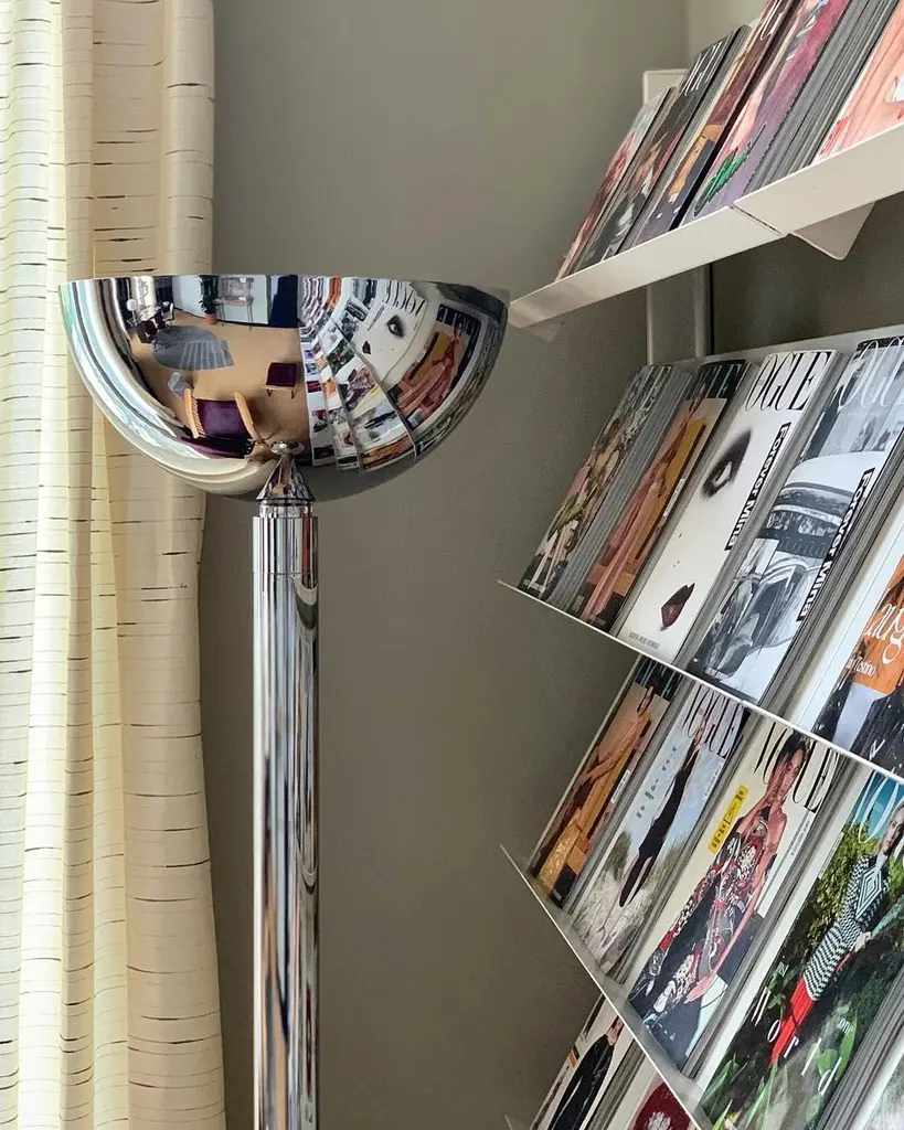 Floor lamp with chromed structure. Diffuser in opal white glass for the AM2C version and in chromed, black chromed or white metal for the AM2Z version. Uplight flood beam distribution, dimmer on the cable.Additional information:Material: MetalColor & Finish: ChromeDesign Year: 1969Bulb Quantity: 1Wattage: 100WVoltage: 120VBulb Type: E26, QT-32Lamping Type: Halogen/LEDLamp (s) Included: NoDimmable: YesDimmer Type: Dimmer on cable, dimmable according to bulbDimmer Included: YesRatings: UL ratedManufacturer Warranty: 1 yearCanopy/Backplate: NoLight function: DiffusedLocation: IndoorDimensions: Ø: 17.7", Height: 70.9"Weight: 35.3 lbsAvailable in other variant option: AM2C Chrome/Glass