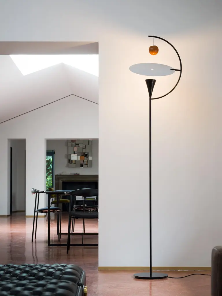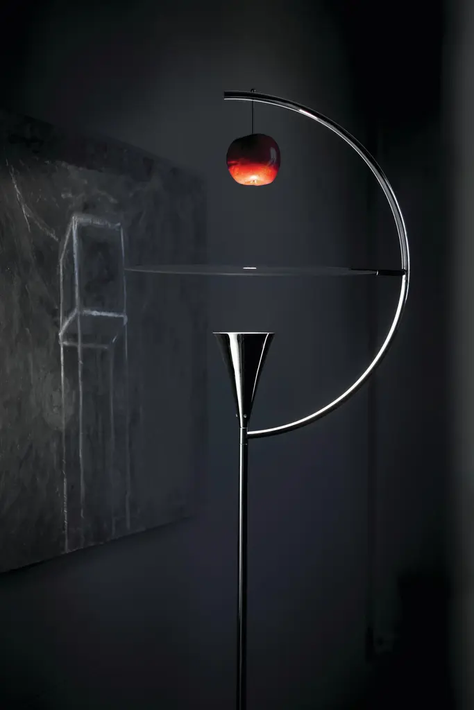 Floor LED lamp with structure in chrome metal or glossy black lacquered and white painted aluminum diffuser. The diffuser rotates and illuminates the natural element, in a mixture of direct and diffused light. A high performance LED source has been provided to reproduce the colors and nuances of the apple as faithfully as possible. Characterized by a playful reference to the anecdote of the apple that fell on Newton’s head making him guess the existence of the force of gravity. Pedal switch dimmingAdditional information:Material: Metal, AluminumColor & Finish: Black Painted/White ReflectorDesign Year: 2019Bulb Quantity: 1Wattage: 16WVoltage: 120VBulb Type: LED integratedLamping Type: LEDLamp (s) Included: YesLumens: 1150lmCRI: 95Color Temperature: 2700KDimmable: YesDimmer Type: Dimmable on cableDimmer Included: YesRatings: ETL ratedManufacturer Warranty: 1 yearLight function: DiffusedLocation: IndoorDimensions: Height: 79.9", Length: 17.9"Weight: 30.86 lbsAvailable in other color options: Chromed/White Reflector