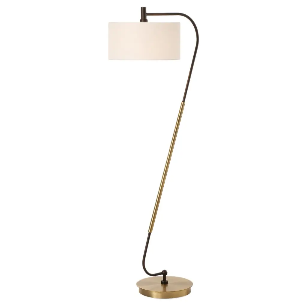 Illuminate your space with the Nerea Floor Lamp, a masterpiece of design and functionality. This arched floor lamp is meticulously crafted from steel, showcasing a harmonious blend of antique-inspired elegance and modern sophistication. Its graceful arc is complemented by a suspended round hardback shade, draped in luxurious white linen fabric, which casts a soft, inviting glow. The lamp's exquisite details and timeless appeal make it a perfect addition to any room, enhancing your decor with its refined presence.