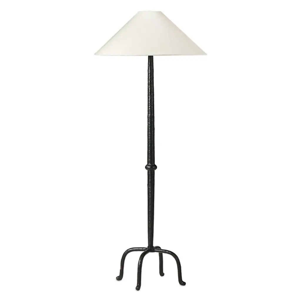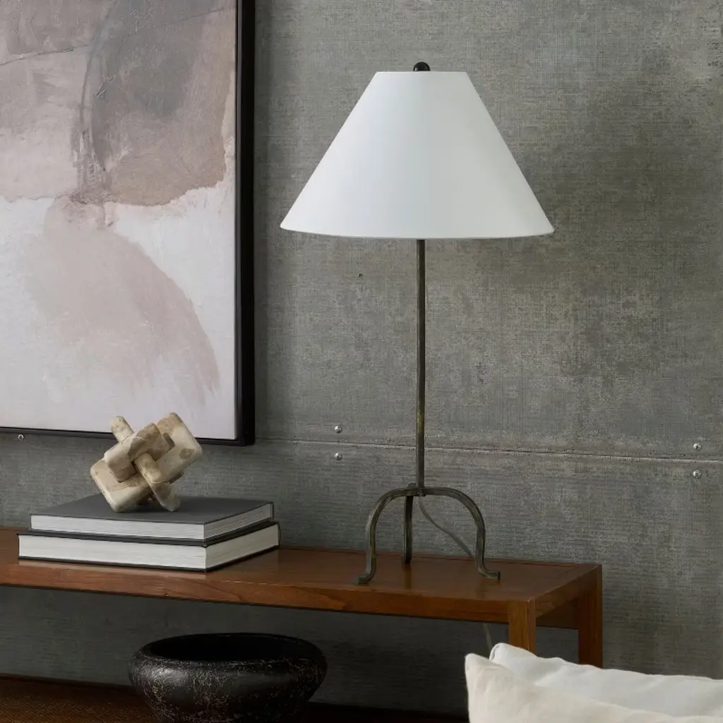 The Neville Floor Lamp from Four Hands features a candlestick-inspired base crafted from cast aluminum, blending durability with timeless design. Four sturdy legs provide both stability and a touch of character, enhancing its industrial charm. Topped with a tapered linen shade, this lamp achieves a sleek, refined finish that complements its contemporary aesthetic. Perfect for living spaces, bedrooms, or offices, it combines rugged materials with modern elegance, making it a standout addition to any room.