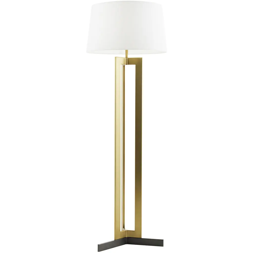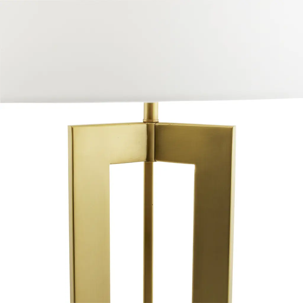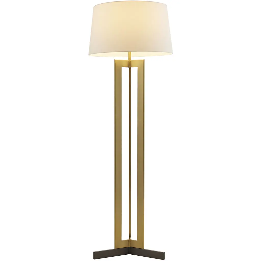 In the spirit of constructivist design, the Newman offers a bold framework of architectural interest. The steel construction features a two-tone finish of antique brass and English bronze for a complementary contrast. Topped with a tapered, off-white microfiber shade with an off-white cotton lining and an antique brass cylinder finial.