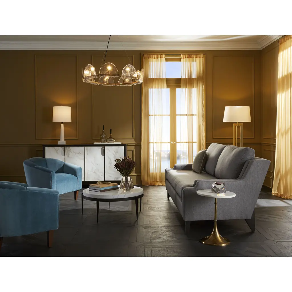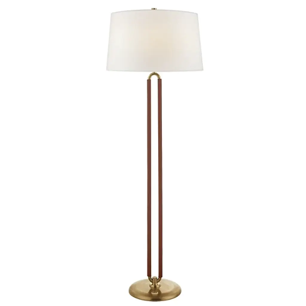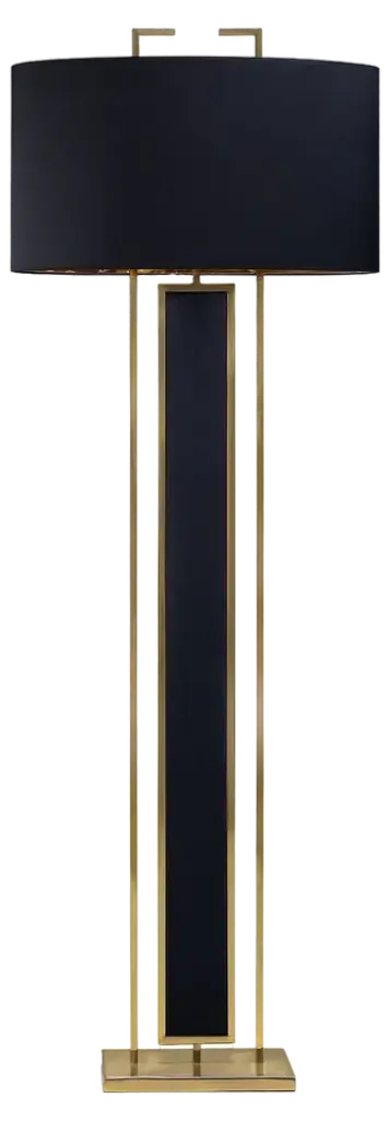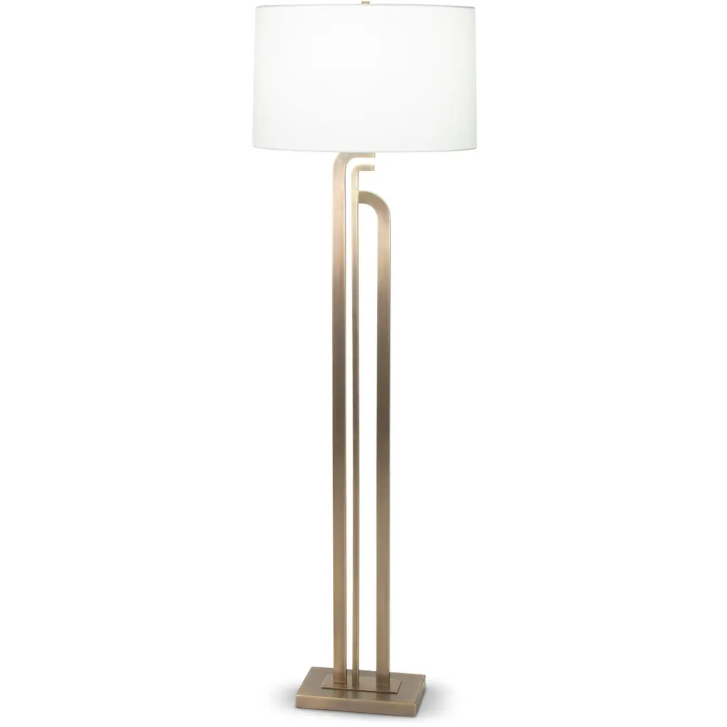 In the spirit of constructivist design, the Newman offers a bold framework of architectural interest. The steel construction features a two-tone finish of antique brass and English bronze for a complementary contrast. Topped with a tapered, off-white microfiber shade with an off-white cotton lining and an antique brass cylinder finial.