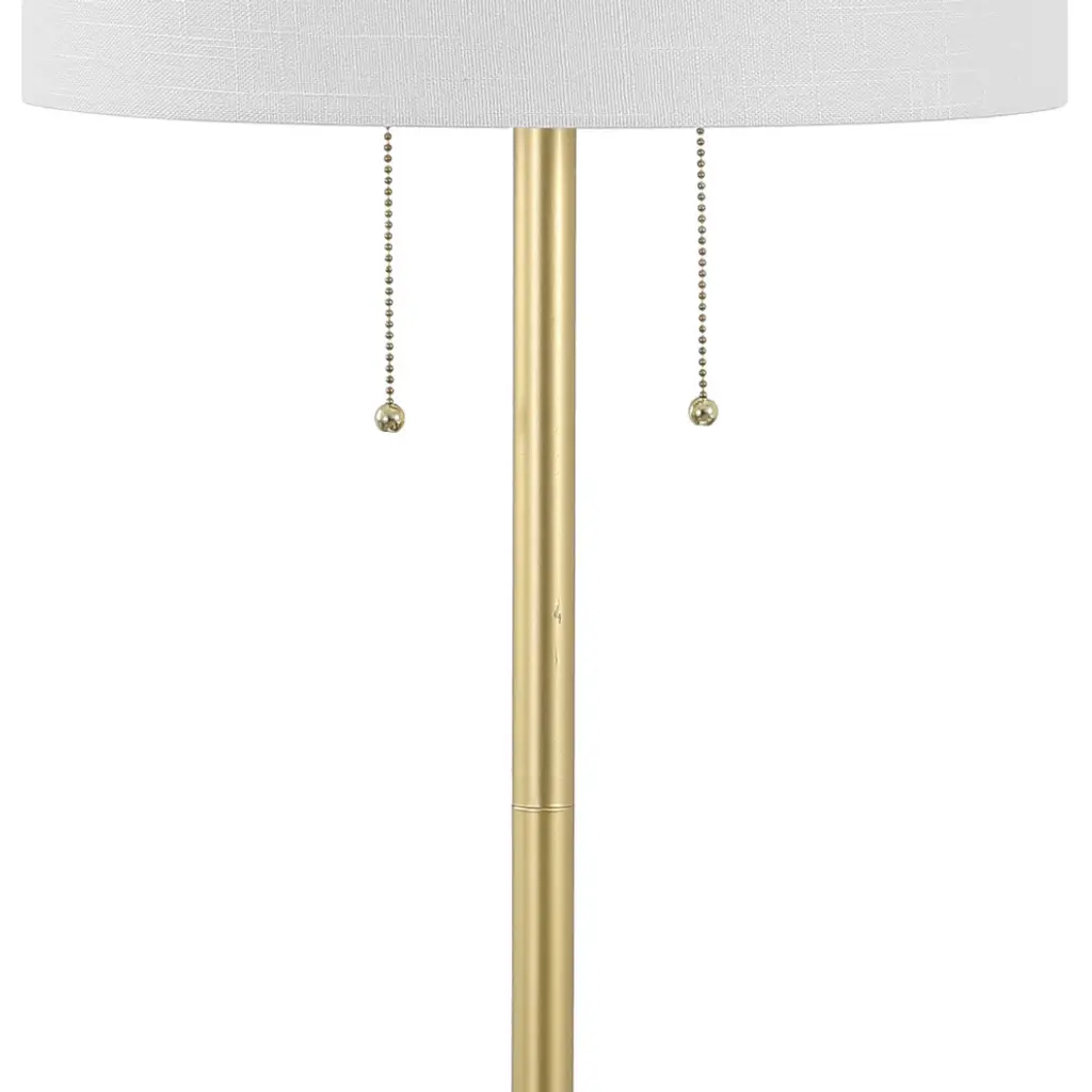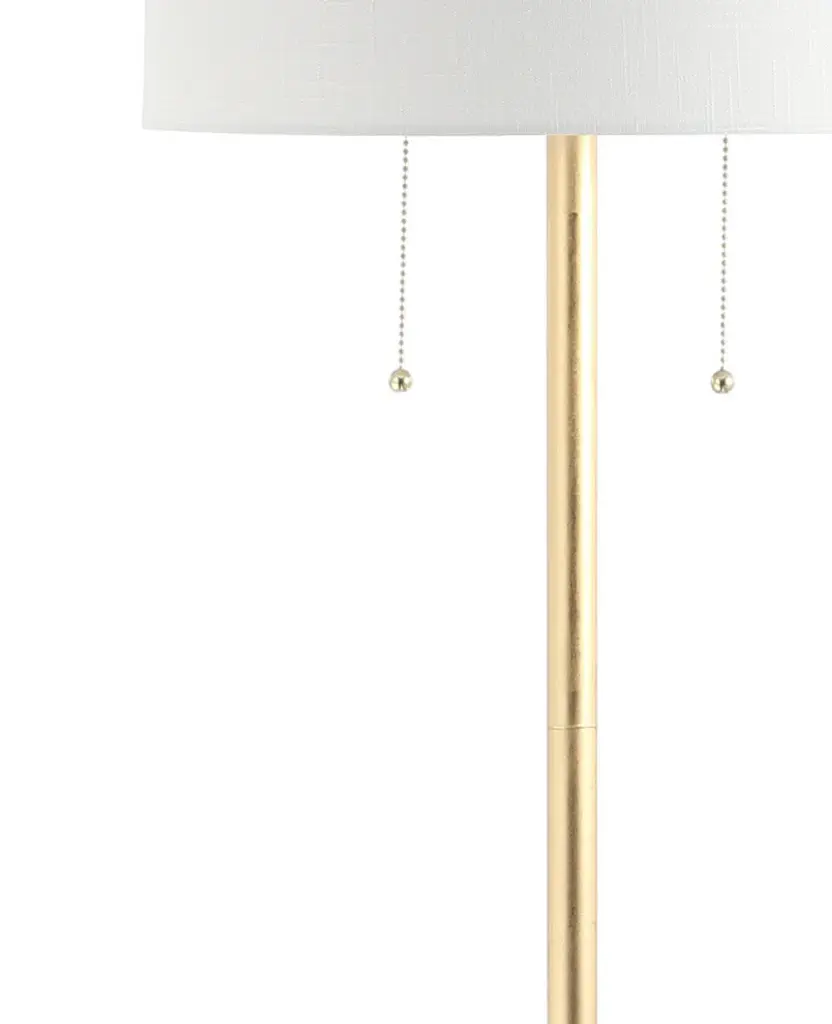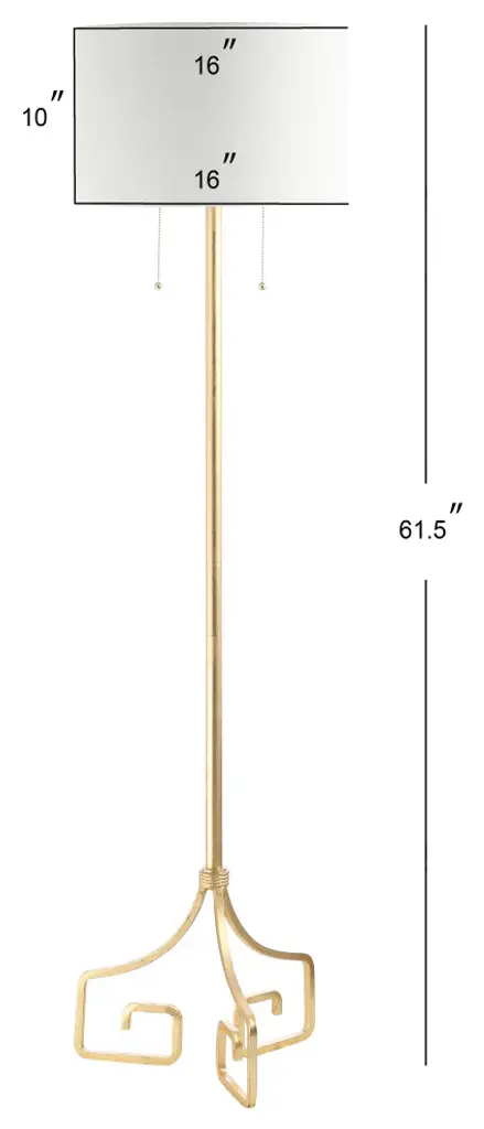 A timeless, classic piece suitable for any room, we love pairing this piece with both traditional and modern decor. Finished in stunning gold and paired with a classic linen drum shade. We love being able to put the silk-wrapped cord on display, too!Features:• Finished in gold, the metal body would suit any color palette• Beautiful to display or easy to conceal: the 72" cord is silk-wrapped• On-off pull chain on socket• Eco-friendly 9W LED bulb included• Takes two bulbs and compatible with any 9W LED or 60W TYPE "A" or 13W CFL• Color: Gold leaf with white shade• Body Material: Metal• Includes: One (1) lamp(s)• Assembly RequiredDimensions:• Lamp: 61.5 inches high x 16 inches wide x 16 inches deepAbout us:You see a lamp.We see a decorative work of art.A perfectly curved shade casts a dramatic shadow on a floor. A silk cord you never want to hide. LED lightbulbs: as easy on the environment as they are on the eyes. The JONATHAN Y Lighting collection considers every detail from impeccably sourced materials to designer styling. And our prices are so attractive, we''ve transformed a functional necessity into a fashion accessory.JONATHAN Y Lighting - a fashion revolution in home decor.