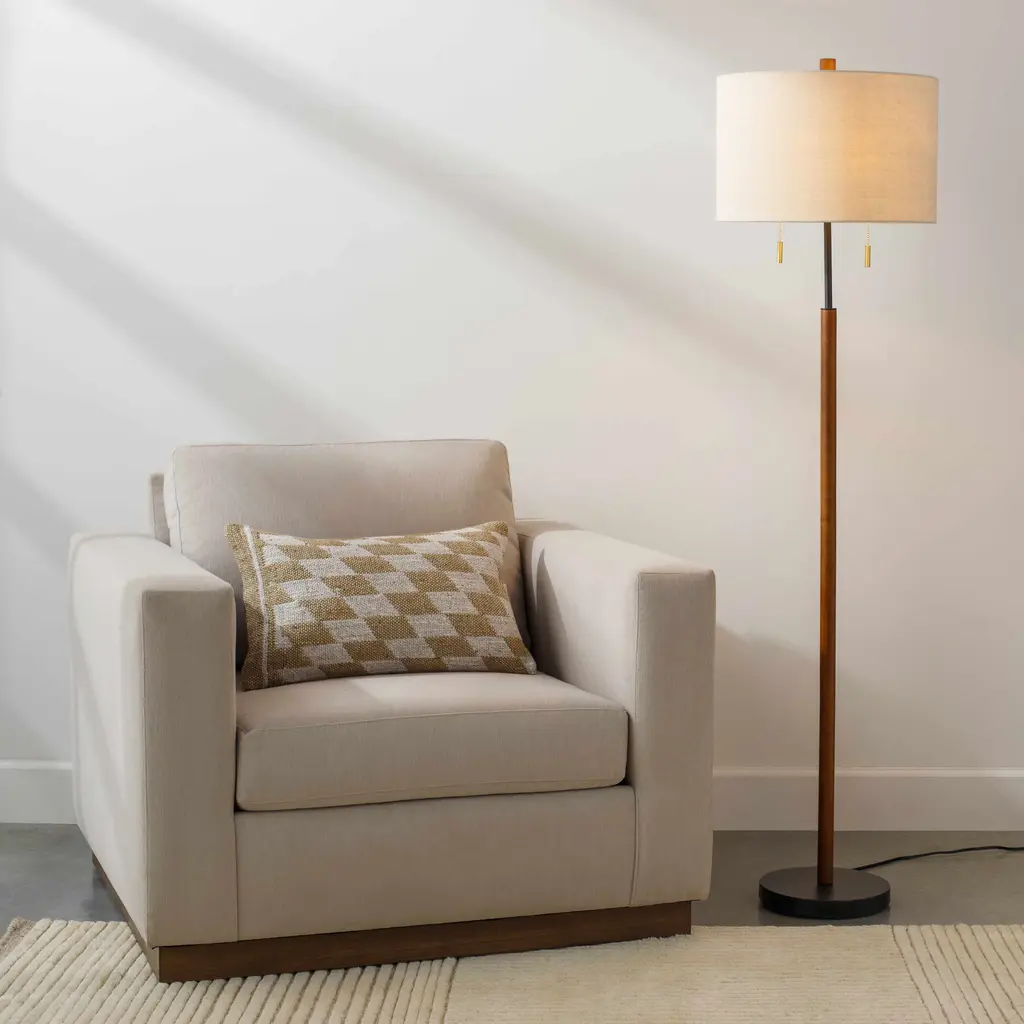 Collection: Ngomedzap Colors: Tan, Black, Beige, White Material: Body: Rubber Wood,Base: Iron,Shade (Outside): Linen,Shade (Inside): Polyester,Finial: Rubber Wood Styles: Contemporary Made In: China Lighting Type: Accent Floor Lighting Base: Iron Base Color: Black Shade Material: LinenPolyester Shade Color: WhiteBeige Cord Length: 8' Switch Type: Twin Pull Number of Bulbs: 2 Socket Type: E-26 Bulb Wattage: 60W
