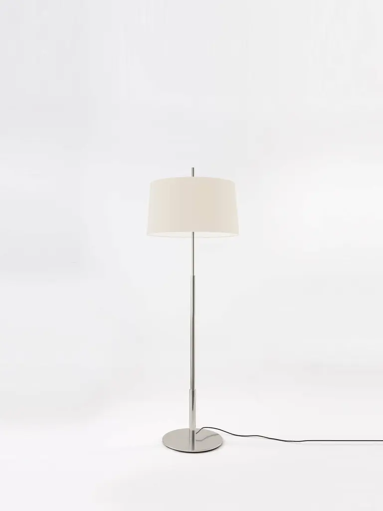 Nickel diana floor lamp by Federico Correa, Alfonso Milá, Miguel MiláDimensions: D 45 x H 146 cmMaterials: Metal, linen.Available in nickel or gold and in black or white shade.In keeping with the calling of its creators, the Diana lamp has a timeless quality. Its metal structure and linen shade are in perfect harmony. Designed to illuminate the Mayor of Barcelona's new offices in the run-up to the 1992 Olympics, its appearance evokes a balance between classic tradition and modernity wherever it is placed.Dimmer included.Santa & Cole is a small, independent and global editor of design products, with its roots in Belloch (Barcelona, Spain). We have been editing since 1985, when the company was first founded. By editing we mean preparing a work for the public domain, we mean adapting an item for everyone’s use. What a book editor does with stories, we do with objects.More than eighty creators have contributed to a rich catalogue of furniture and lighting products originating in very different contexts, by renowned designers such as Antoni Arola, Miguel Milá, André Ricard and llmari Tapiovaara.Acute and attentive to quality and detail, Santa & Cole outsources all of its industrial production to an extensive network of suppliers, mainly in Spain, but also in other countries such as Japan, where the washi paper for our Tekiò lamp is made.Our mission is to build, safeguard and disseminate knowledge through design objects. Objects whose quality is recognisable at the touch of a hand, and that enrich people’s lives, whether at home or in shared environments. Our philosophy is more modern than futurist and we are more intrigued by silence than by stridency.Our focus is not the present market, but the future one; not Barcelona, but the world; not fashion, but history.All our lamps can be wired according to each country. If sold to the USA it will be wired for the USA for instance.