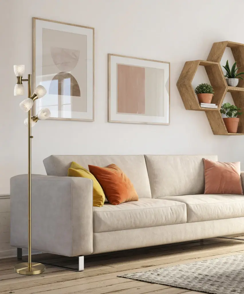 Brighten your space with the style and functionality of the Nina LED floor lamp. Crafted with an antique brass finish and featuring delicate glass texturing, this lamp complements Victorian or farmhouse décor. A 10" diameter round base supports a narrow matching stem. Extending from the stem at offset heights and directions are three dual textured milk glass shades, each with an hour-glass shaped accent piece in antique brass finish. The six included 3W replaceable LED bulbs throw a soft, warm white light and are compatible with full-range dimmers, allowing you to adjust the brightness as needed. For added versatility, the base of each lamp shade features an articulation point, allowing you to rotate and redirect the shades for a variety of looks and lighting options. Complete your décor with the coordinating Nina LED desk lamp and wall lamp.The 3.75" tall and 3.5"diameter glass light shades include delicate texturing for a Victorian feel.An articulation point allows you to rotate and redirect the light shades.The included LED light bulbs are compatible with full-range dimmers, allowing you to adjust the brightness to suit your needs.The included LED lights are rated with CRI of 80, color temperature of 3,000K, and brightness of 275 lumens for a soft, warm white glow.The Nina LED style is also available as a desk lamp and wall lamp.6 x 3W Replaceable & Dimmable G9 LED Bulbs Included