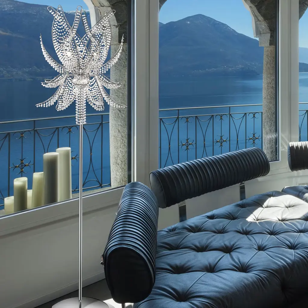 Embodying the ethereal beauty of the lotus flower, this floor lamp in transparent crystals floats with grace and delicacy, infusing every space with luminous allure. Crafted with a sleek metal frame in polished chrome, this lamp adds a touch of refinement to any setting, capturing attention with its enchanting presence. Also available with glass pearls and luxurious gold finishes, please contact the Concierge for further information.