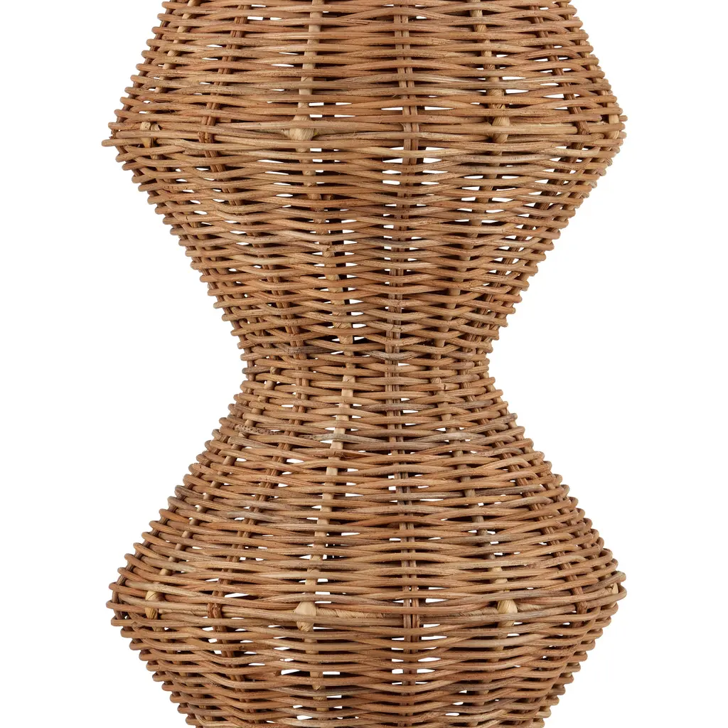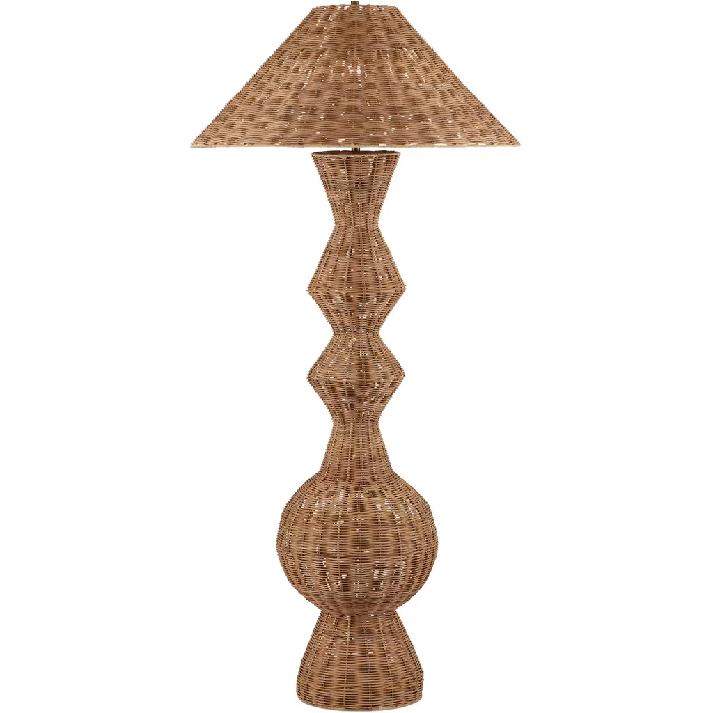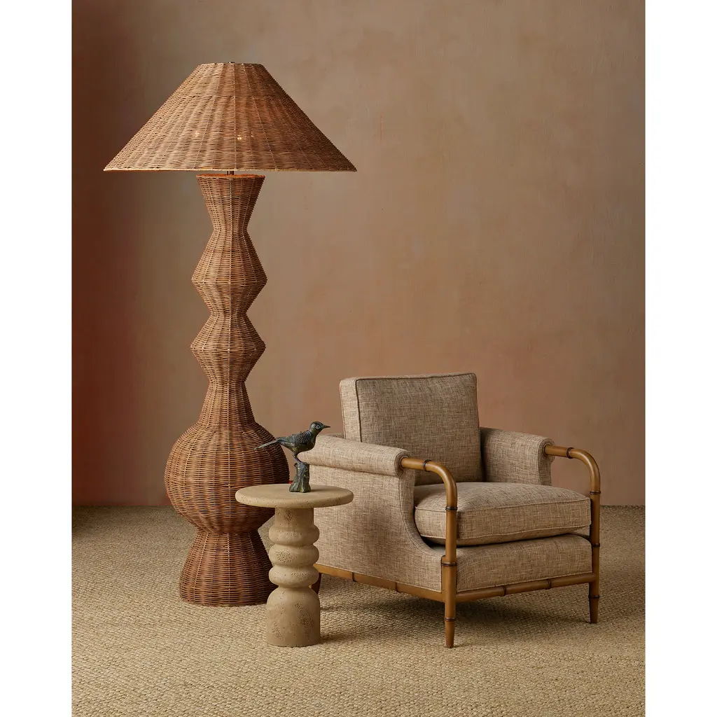 The Nirvana Grande Floor Lamp has an oversized geometric body crafted from stripped cane rattan, giving the natural material a soft, matte texture that enhances its organic appeal. The flared empire shade, made of thicker rattan, adds structure and visual balance to the design. Inspired by Asian aesthetics, this statement floor lamp houses three bulbs that provide a generous, warm glow. An inline foot switch offers easy, hands-free operation.