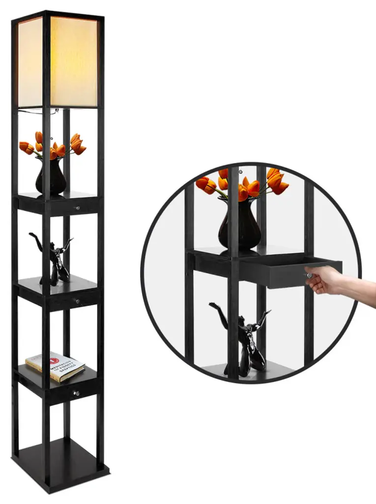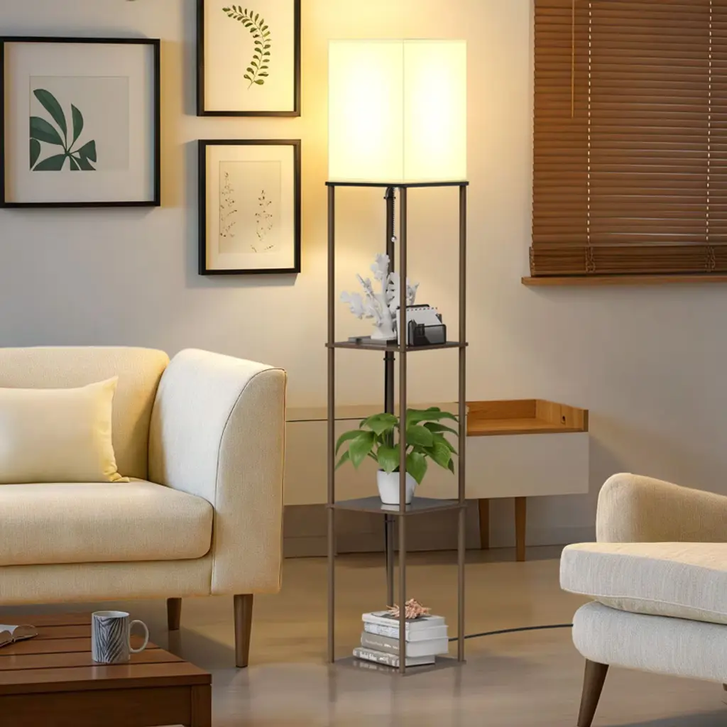 Metallic floor lamp with cotton lampshade. Switch on the lampholder. Features