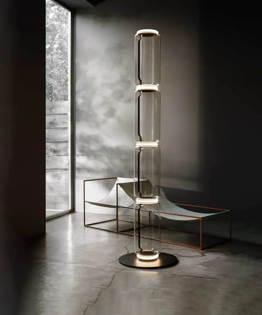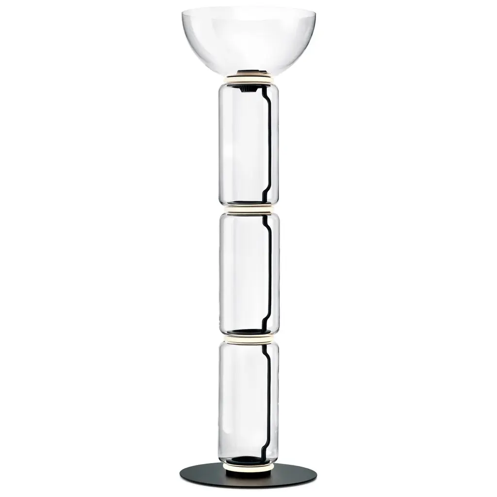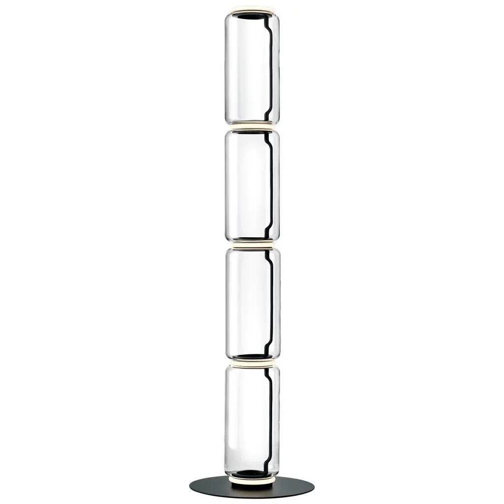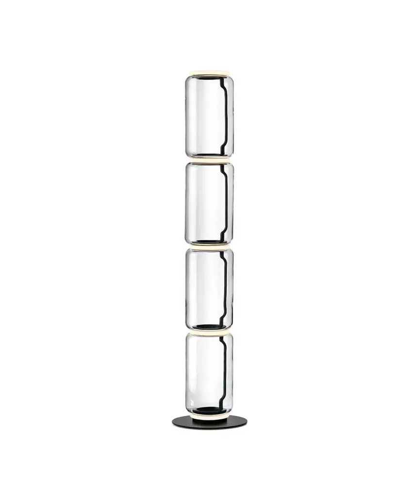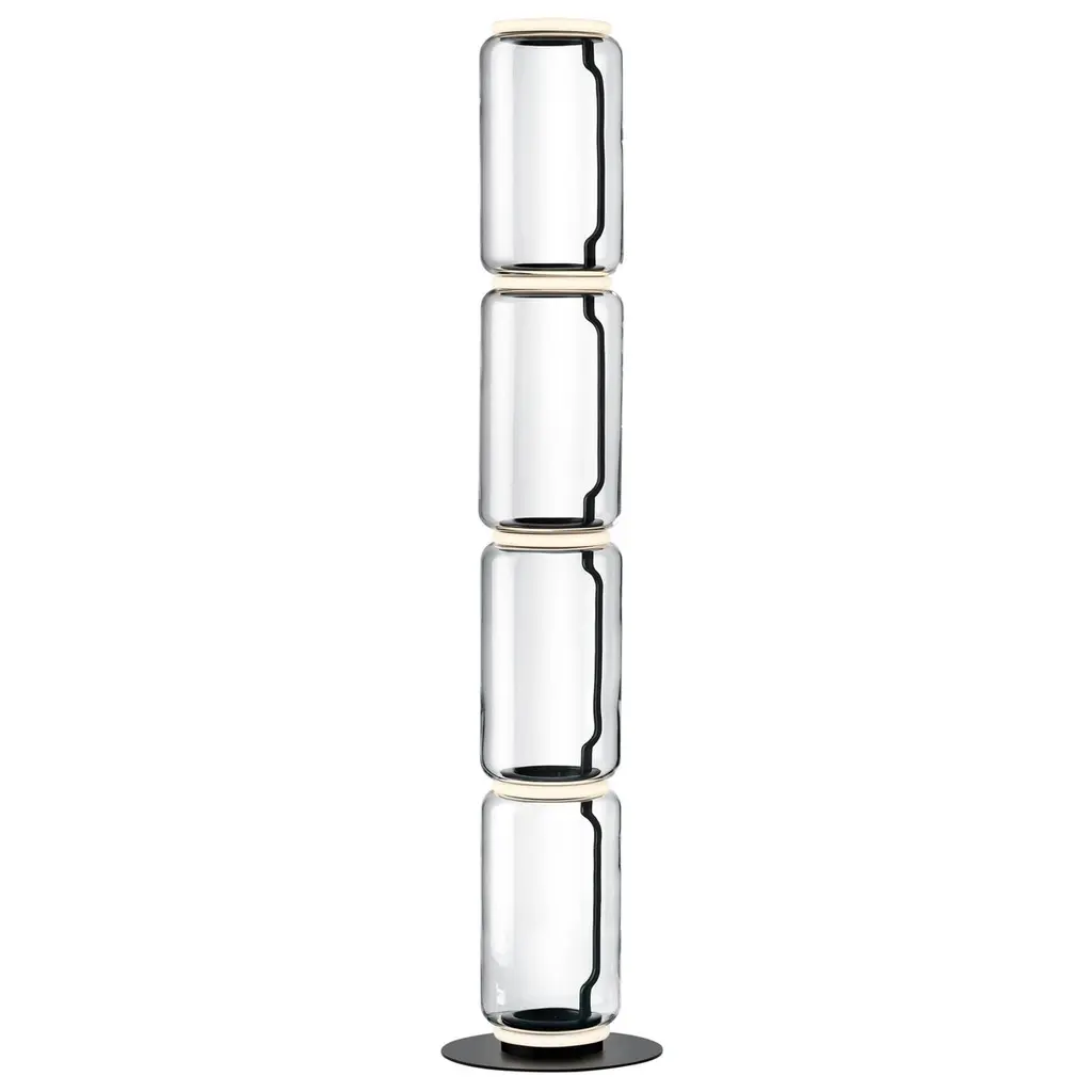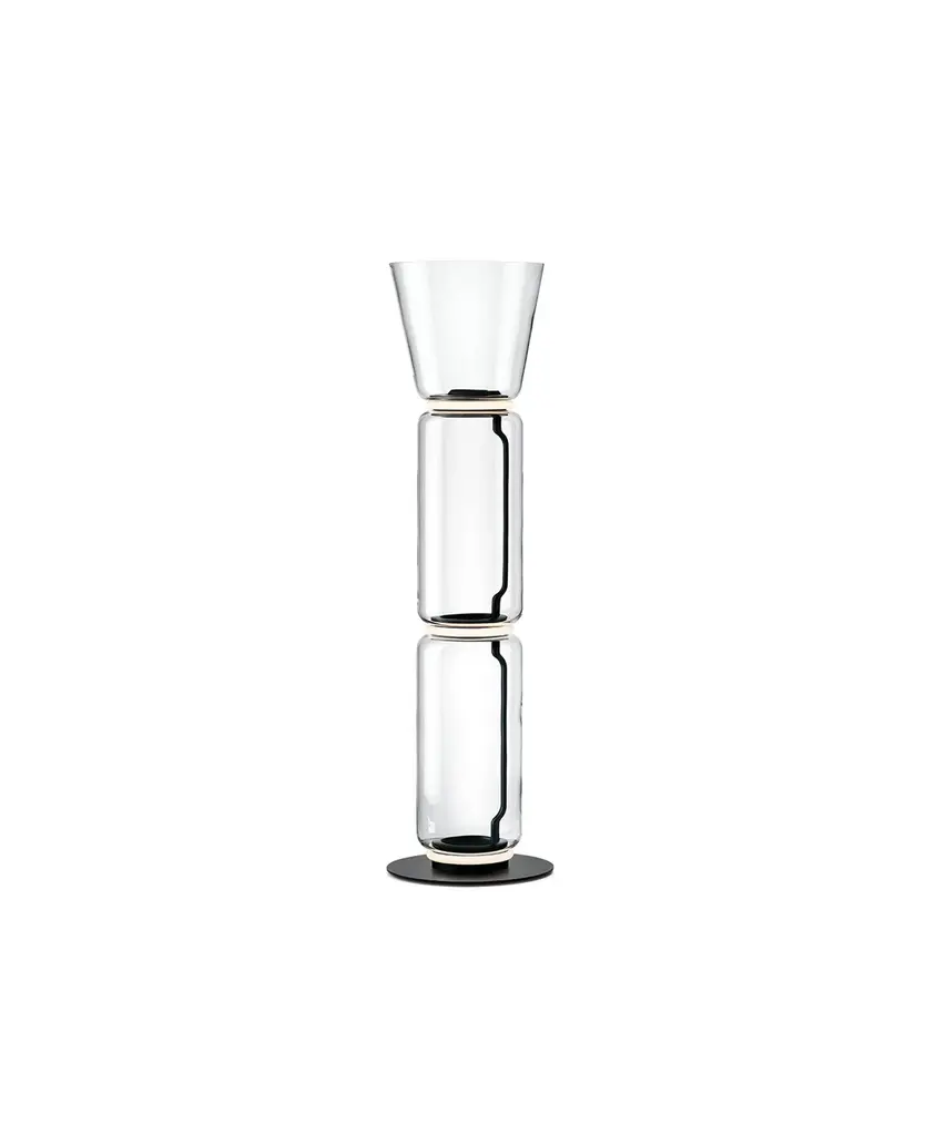 An innovative LED-based lighting system, created by renowned designer Konstantin Grcic for FLOS. The foundation of the the Noctambule series is a transparent hand-blown glass cylinder, surrounded on both top and bottom by discrete LED technology. These cylinders stack to form columns of light that illuminate at the intersection between each module. Configurable as a hanging or standing lamp, Noctambule features additional components that allow for numerous options. The cylinders are available in two heights (Low and High), and a bowl or cone-shaped head can also be added for more directional light. All fixtures are also dimmable (the floor lamp models equipped with a pedal-based dimmer switch). This authentic design is produced in Italy exclusively by Flos.