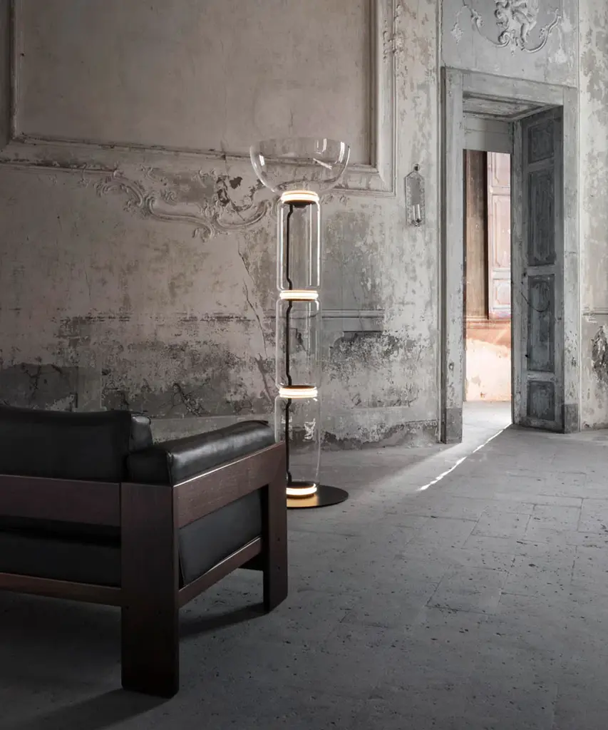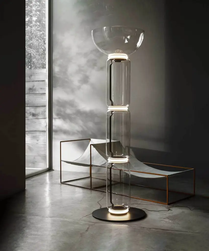 The brainchild of master designer Konstantin Grcic, Noctambule by FLOS is a futuristic lighting system that blends innovation, efficiency, and aesthetics. Its transparent hand-blown glass cylinder is surrounded by discrete LED technology on top and at the bottom, thus making the foundation of the lamp stylish and stunning. The user can attach additional components to the fixture in order to experiment with different styles of lighting. This helps create columns of light at varying heights that light up at the intersecting points between each module or unit. Noctambule LED dimmable floor lamp cylinders, cones, bowl top, and large base can be configured as a hanging lamp or a standing light, depending on the need and preferences. Its dimming capabilities can be set through the power supply unit within the ceiling rose, or via a pedal panel on the power cord. The modern lamp's cylindrical body is available at both low and high heights, while users can choose between the dome-shaped head or cone-shaped head for a more direct light source. Other NOCTAMBULE floor lamps options: NOCTAMBULE FLOOR LAMP WITH 1 - 4 LOW CYLINDERS & SMALL BASE NOCTAMBULE FLOOR WITH 1 - 3 HIGH CYLINDERS & SMALL BASE NOCTAMBULE FLOOR WITH CONE TOP & SMALL BASE Inspiration behind the design: Inspired by night owls, Noctambule by Konstantin Grcic features a transparent body that almost blends into a room when unlit, but makes its presence known when it illuminates at night. This authentic design is produced in Italy exclusively by Flos.