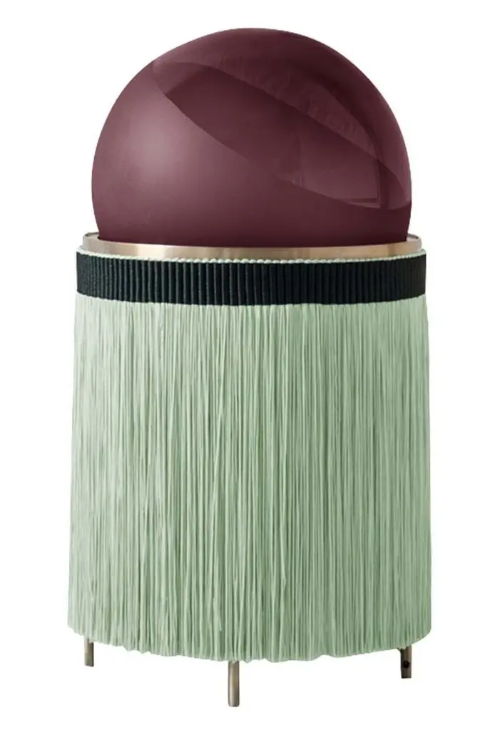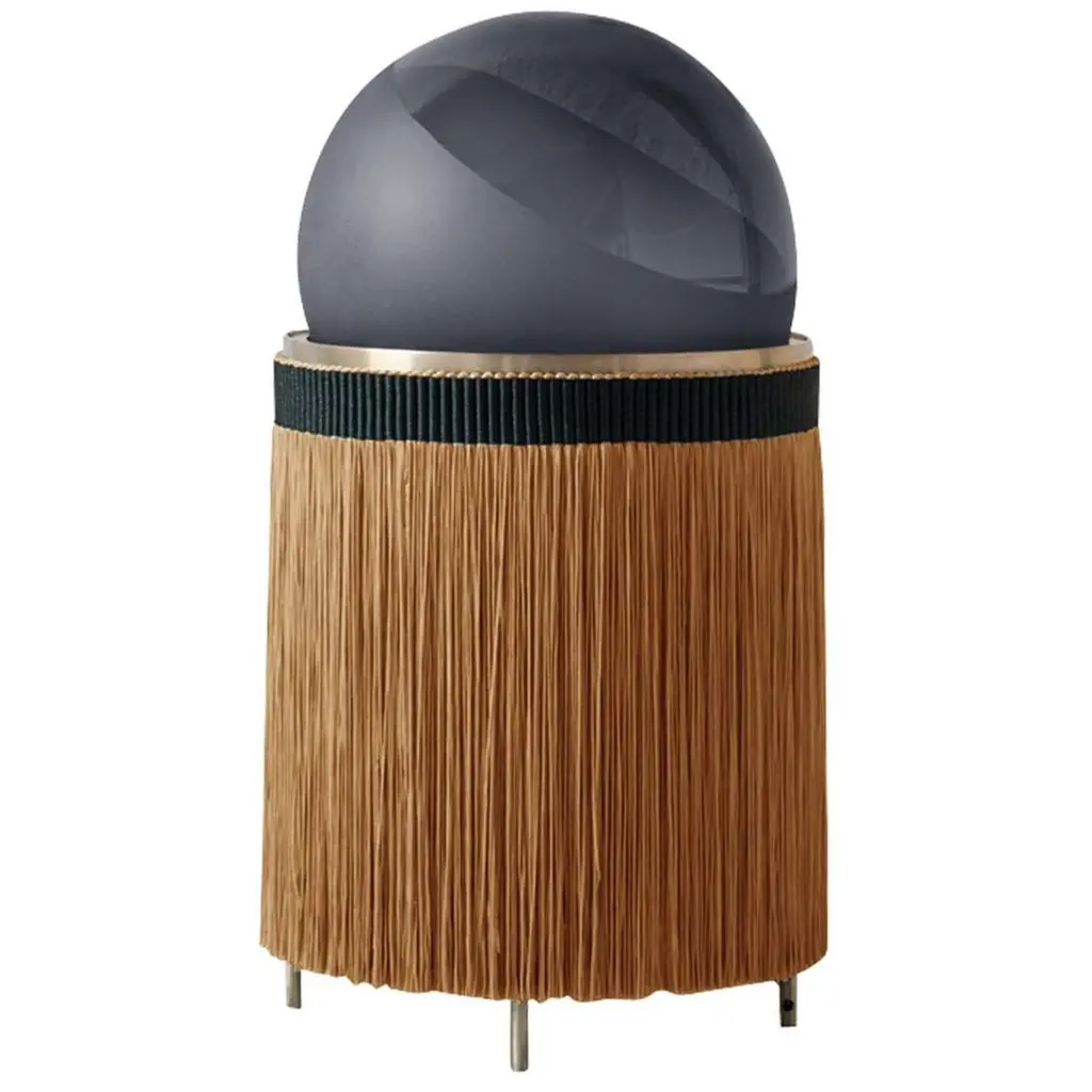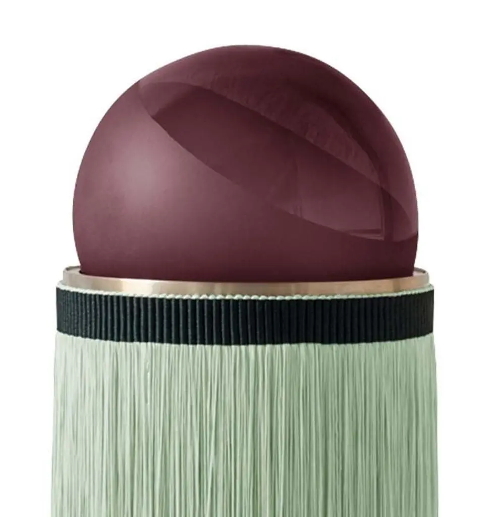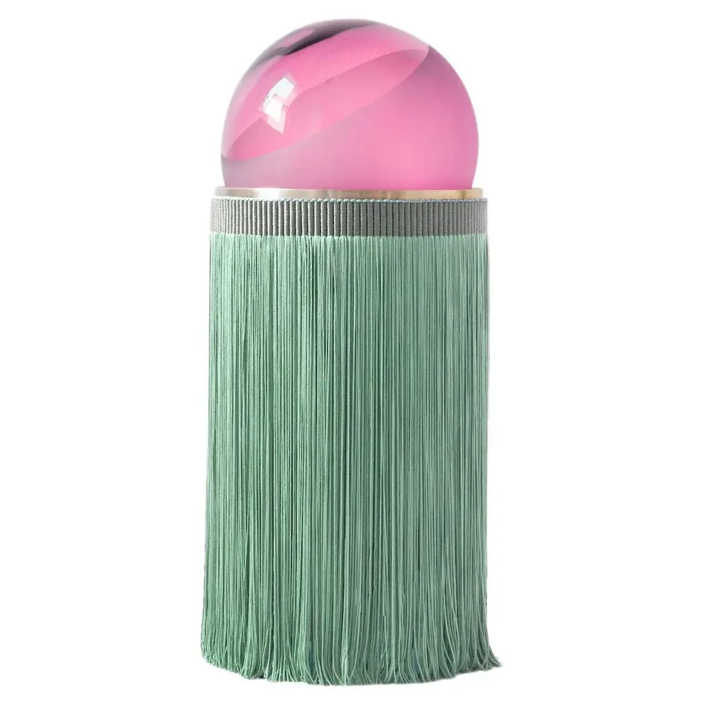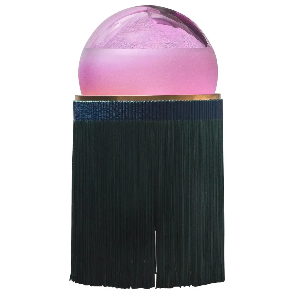 This floor lamp was designed by Sicilian-born designer duo Vi+M and is distinctive for its small size, a combination of striking textures, and exquisite materials. The base is in brushed brass and is covered with three layers of vivid green fabric for a dynamic look. The shade is a sphere crafted of mouth-blown Murano glass in a contrasting amethyst pink shade. This charming piece will enliven any modern decor. Other color combinations are available.
