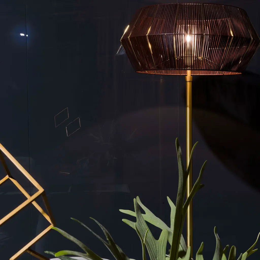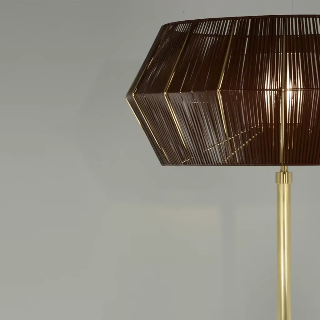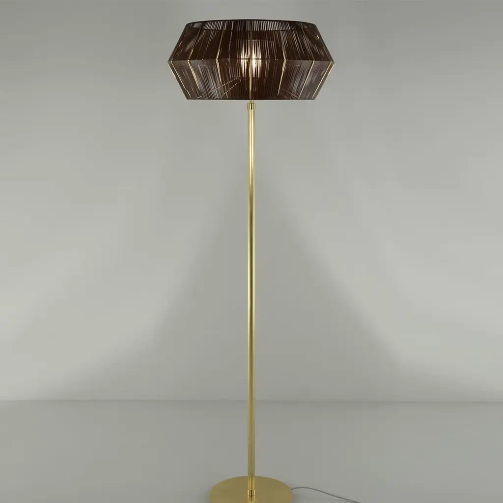The peculiarity that makes this collection unique is the lampshade and its particular shape: available in brown eco-leather and white string. A system of repeating proportions and modules, wisely assembled by the expert hands of the artisans. The collection consists of a large number of models developed horizontally and vertically. 1-light floor lamp. Bulb not supplied. Available in custom sizes and finishes. Metal and textile. Satin brass and brown eco leather.