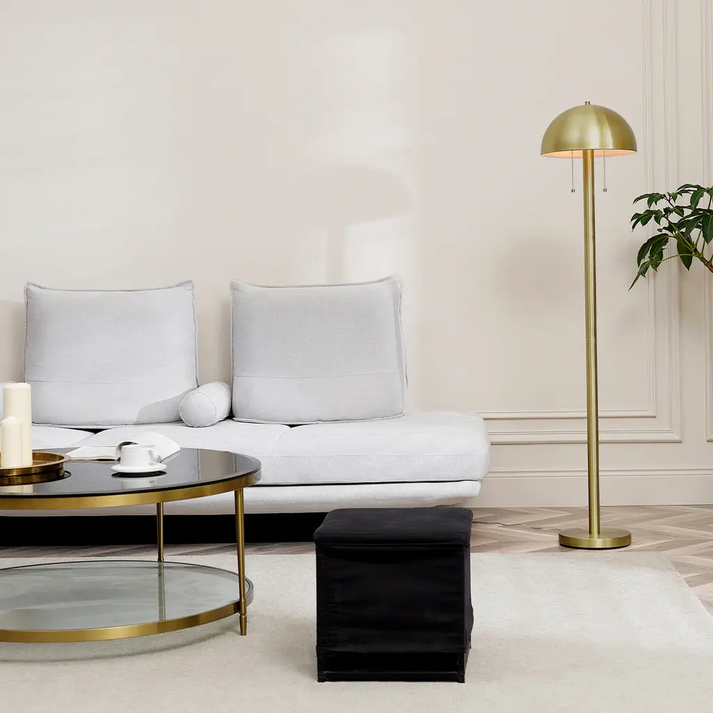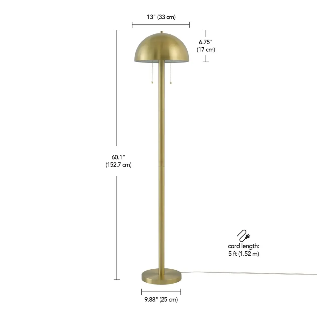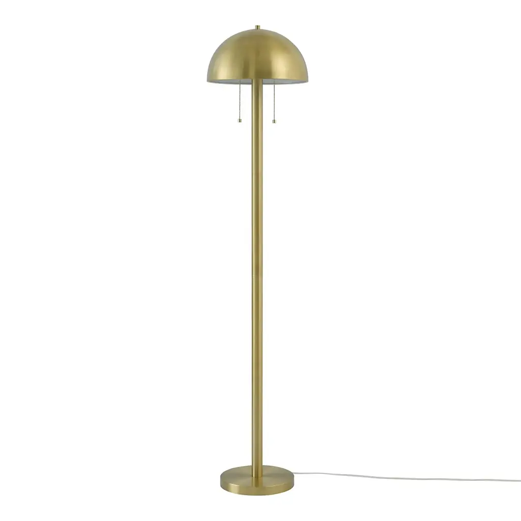With a stylish dome shade, two lights that can easily be turned on and off with a double pull chain and a stunning matte brass finish, the Novogratz x Globe Haydel 2-Light Floor Lamp is the perfect accent piece for your home. The brass, metal shade brings a flawless vintage style to any living room, bedroom or office for an instant glam appeal regardless of your current decor. For added convenience, the two-light feature is both functional and unique since you can turn on one bulb at a time to best suit your needs. This floor lamp also comes with a clear, five-foot cord so you can adjust the placement around your room with the benefit of minimizing the cord's appearance. The Novogratz and Globe Electric - stylish, decorative lighting made easy. Features