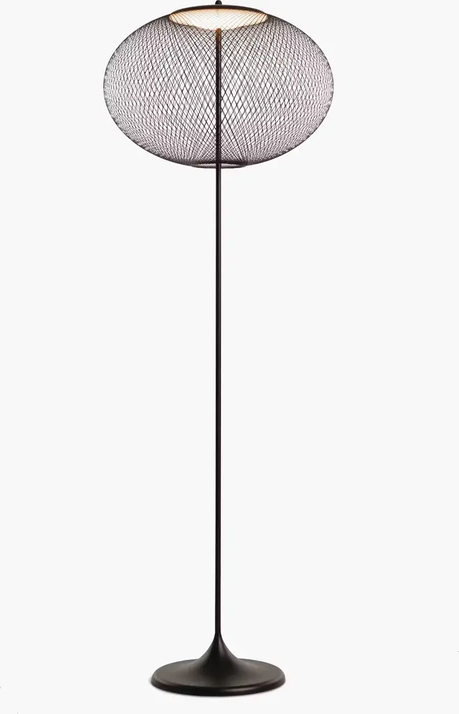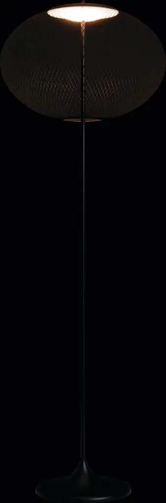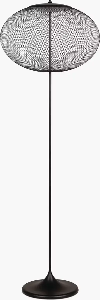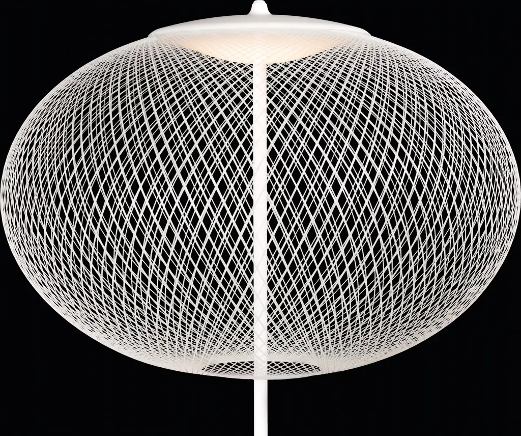 Industrial designer Bertjan Pot begins many of his works as material experiments - and the NR2 Floor Lamp (2019) is no exception. The ellipsoid shade is crafted of fiberglass with epoxy resin, featuring a latticed pattern that doesn't block one's view. The lamp's powder-coated steel stand is notable for its seamlessly integrated LED light, diffusing a luminous glow that's easy on the eyes. Its power cord is equipped with a dimmer. Bulb (included): LED. Made in the Netherlands.