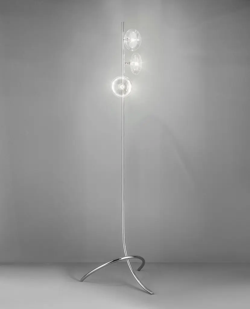 Modern Italian floor lamp with three clear glass shades mounted on chrome finish metal frame / Made in Italy by Fabio LtdDiameter: 20 inches / Height: 67 inches 3 lights / G9 type / max 25W eachOrder only / This item ships from ItalyOrder Reference #: FABIOLTD L180 CLEARThe listed price applies to chrome finish, matt gold finish available with upcharge of $300.