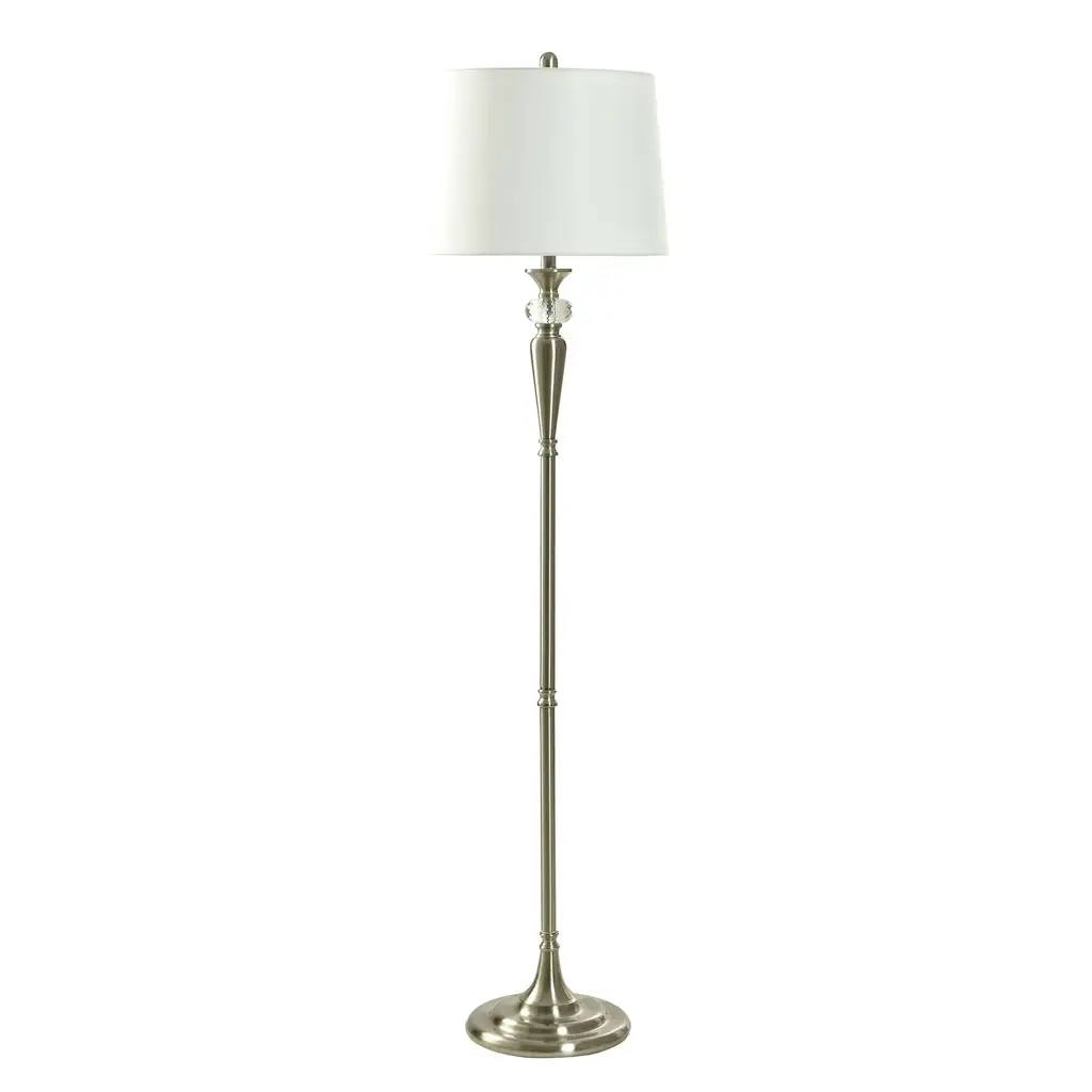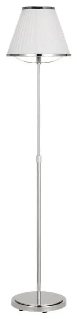 A slender and harmonious silhouette adorned with delicate detailing marks the design of this floor lamp, conceived to simultaneously provide illumination and adorn luxe classic-style homes. The brass structure flaunts a chrome finish whose reflective quality is emphasized by the glow from the single E27 LED source (rated power of 100W). A classic, pleated fabric shade completes the design.
