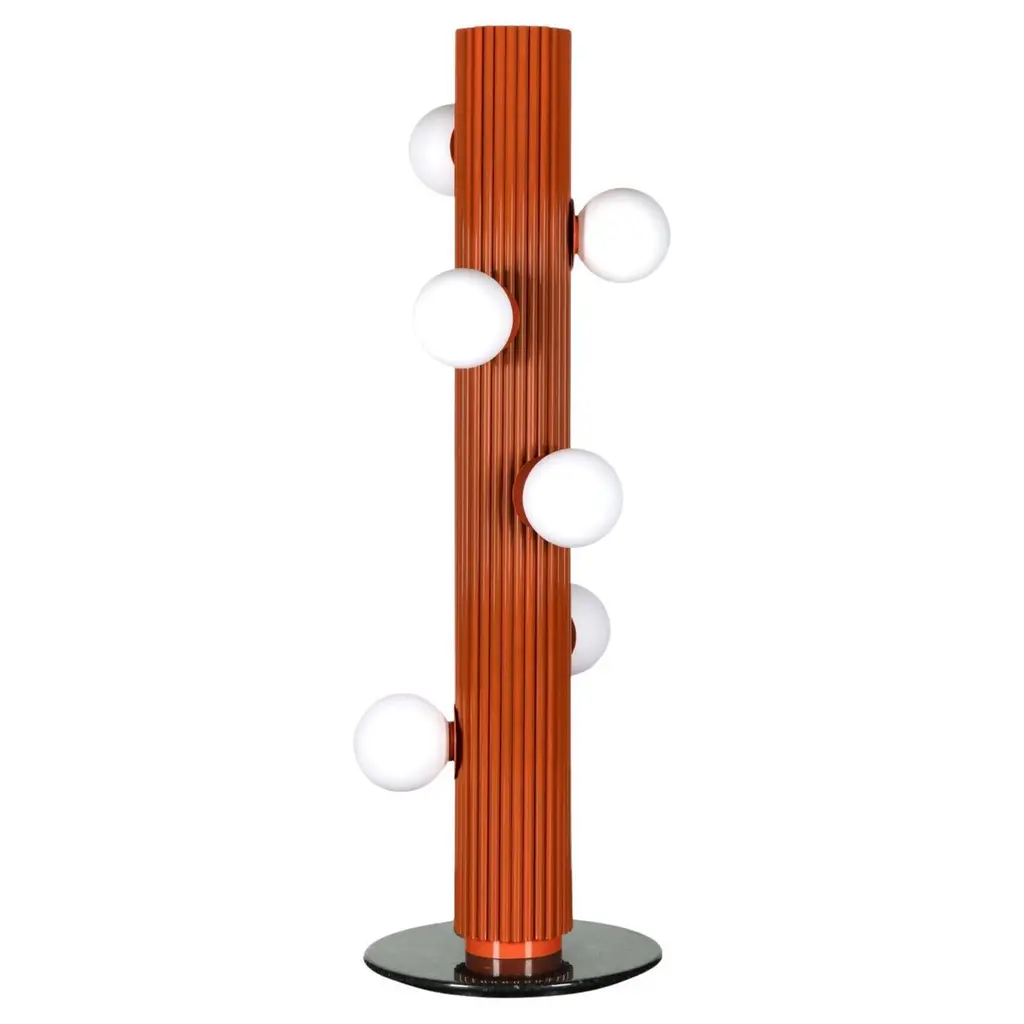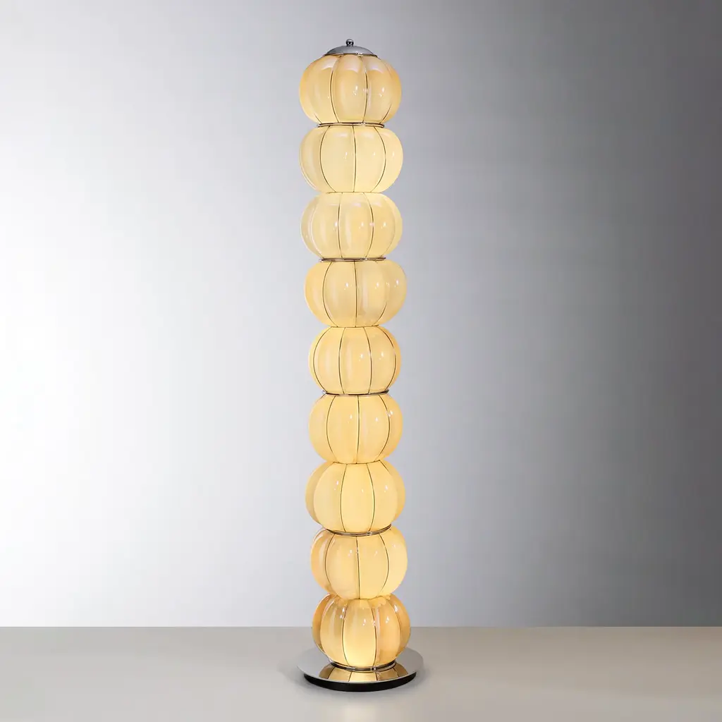 A column of piled clouds fashioned from mouth-blown, amber-hued Murano glass distinguishes the sculptural allure of this floor lamp, also available in a black-and-white version to fit in truly glamorous settings. Sitting atop a glistening, round base, the composite ensemble of diffusers sports a bulging texture, resulting from a mouth-blowing step within the stainless steel cages that embrace every shade. Due to handcrafting, slight changes in metal's finish may occur.