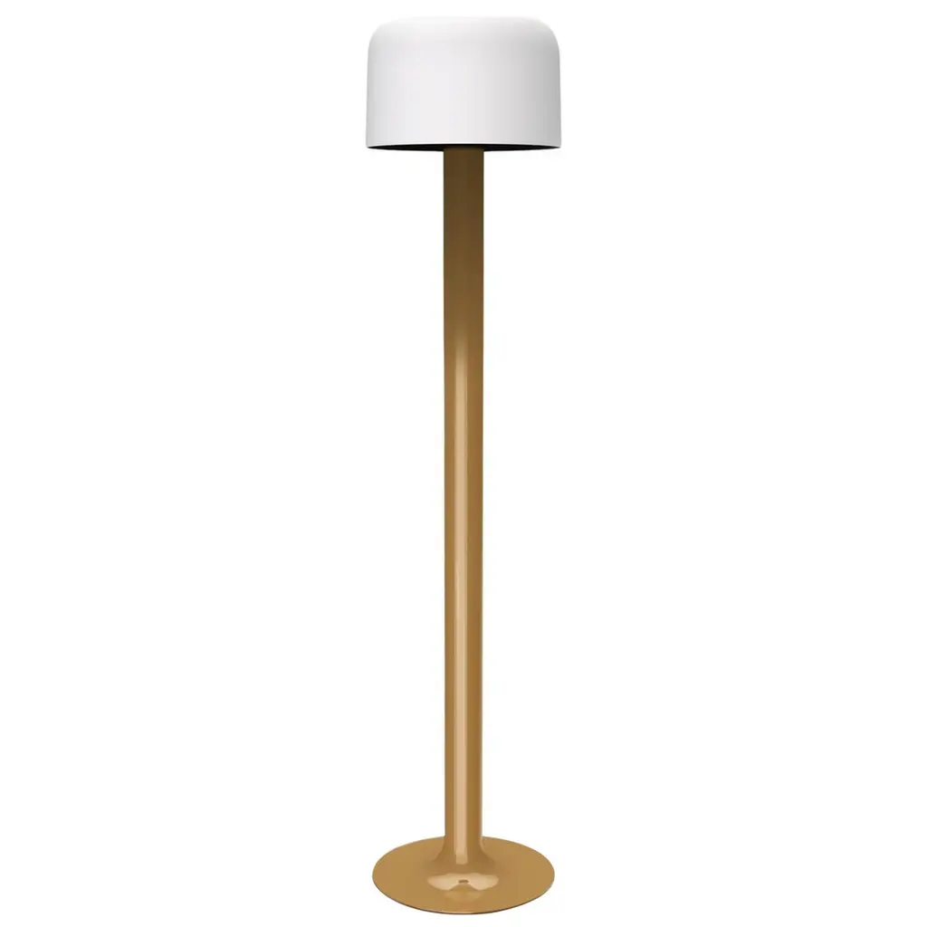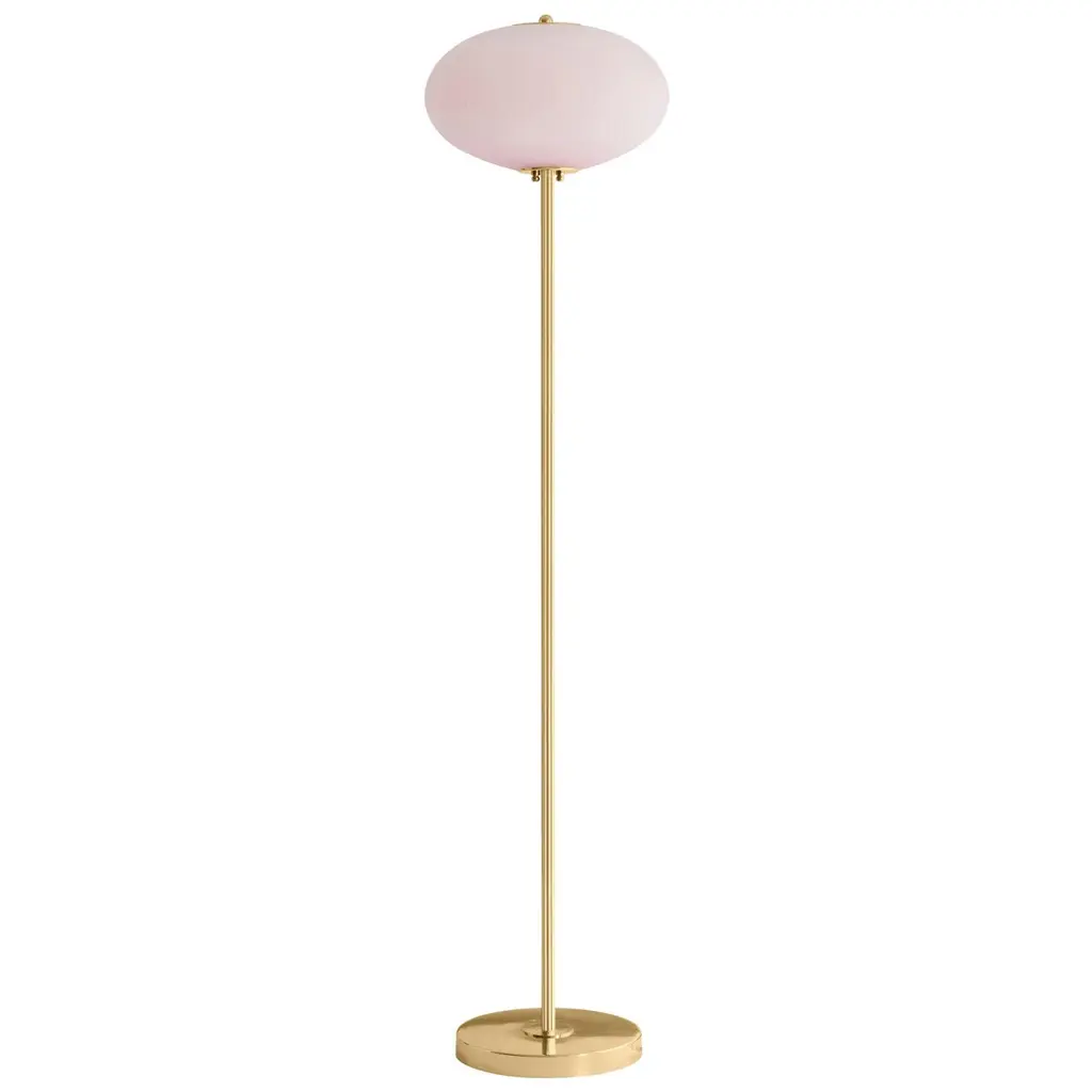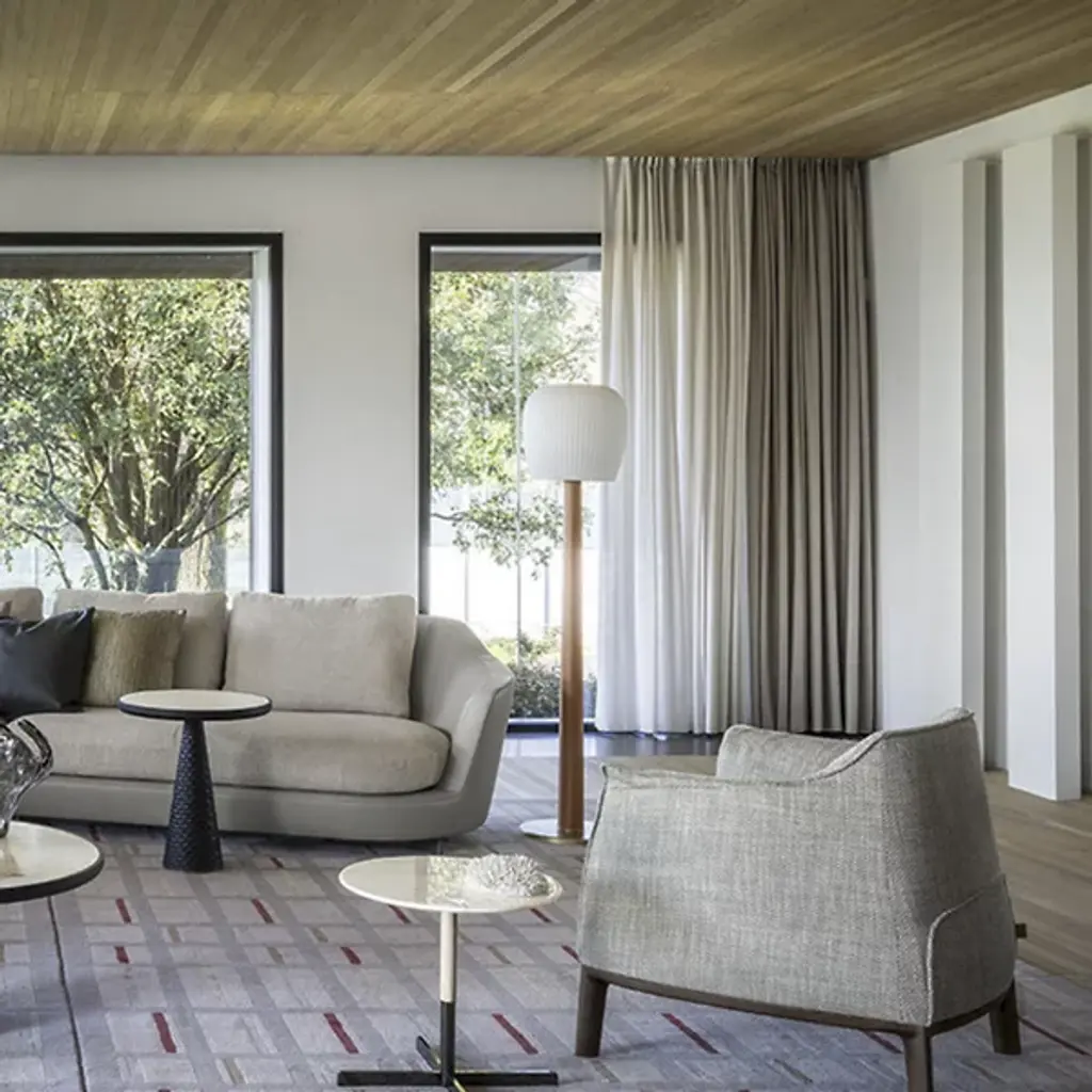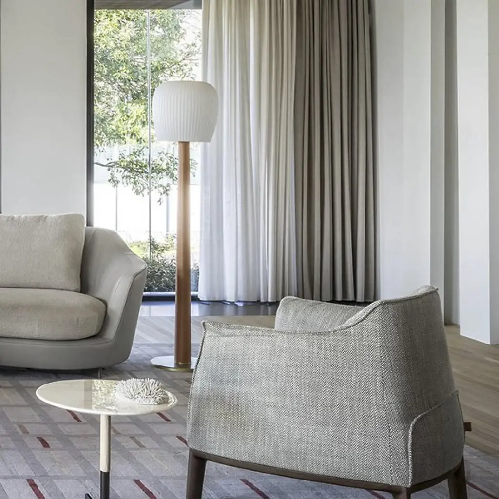 The slender Nymph Floor Lamp from Poltrona Frau employs the grace and gentle presence of the namesakes from Greek mythology. Designed by Sebastian Herkner to pair simple materials with a balanced form. It uses a conical base wrapped in leather with precise stitching, lending a tactile, grounded presence. Above, a mouth-blown frosted glass shade with vertical pleats curves down, diffusing light into a warm radiance. The shade seems to hover lightly when lit, offering an inviting, ambient glow with a textured surface.