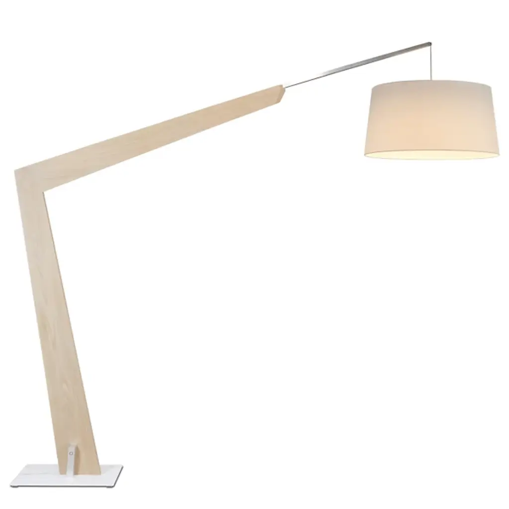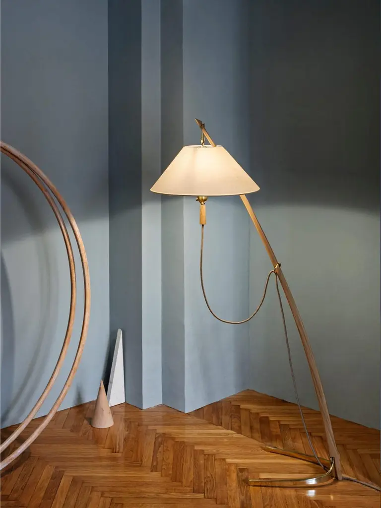 Contemporary edition of J.T. Kalmar's iconic and high end made 'Dornstab' design from 1947 in solid oak with polished brass base and a silk fabric lamp shade.All new. Made at original manufacturer Kalmar Werkstätten Austria. The solid wooden curved upright is equipped with three brass 'thorns', from which the lamp shade hangs and can be easily be moved. When moving the shade, you change the light function: positioned low, the lamp provides reading light and when the shade is positioned higher, the lamp offers wonderful diffused indirect light.A beautiful design with a special functionality of exceptional quality.Made by order. Delivery time usually 4-5 weeks. Sometimes even sooner. Lamps can be ordered with US plug for direct use within the US or Canada. Please confirm your desired plug with your order. Also available in other wood options. Please see our other listings for alternative options for this Dornstab lamp and our other lighting by Kalmar.