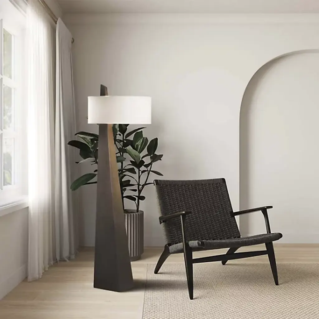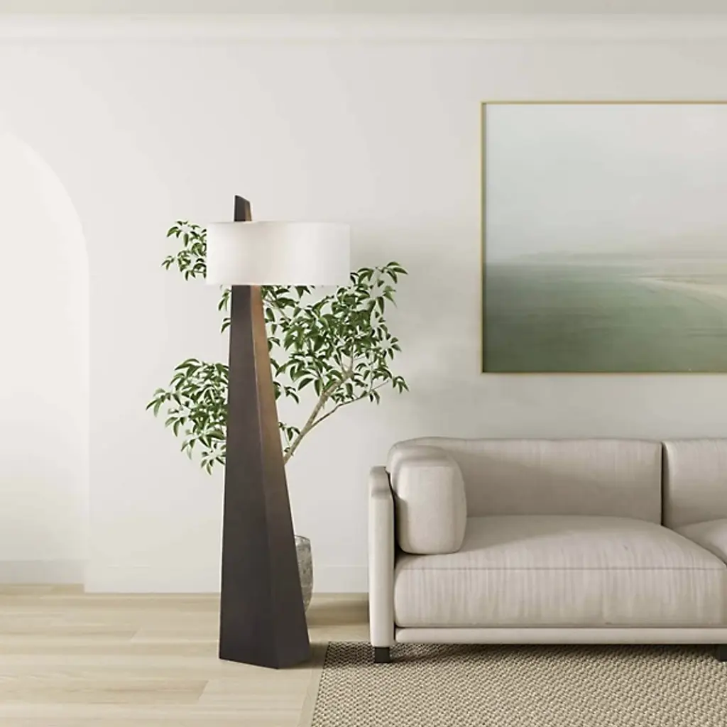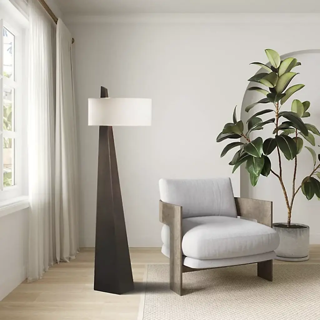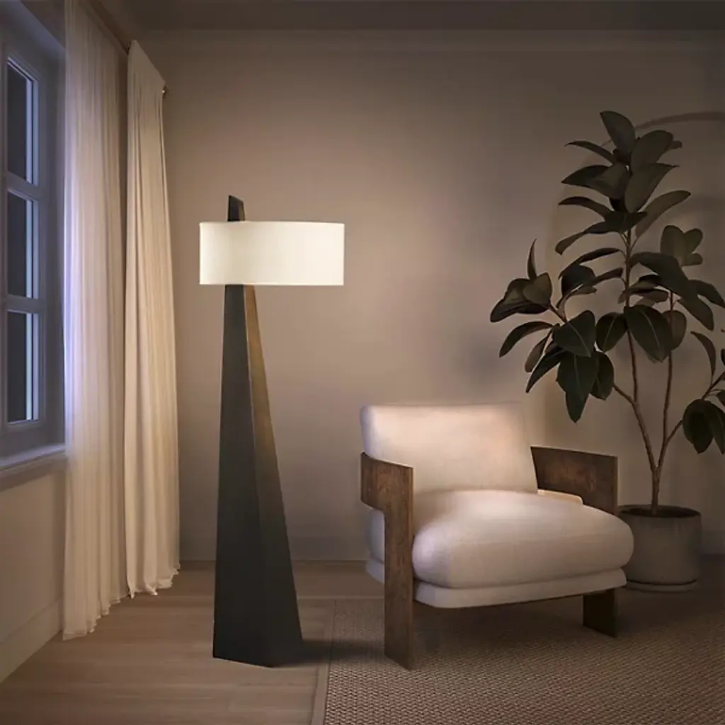 Striking like a chiseled stone pillar. Let the Obelisk Floor Lamp from Nova of California serve as the elegant, anchoring visual in your modern space. The piece stands up with a bold silhouette, underlined by its dynamic angles and robust proportions. Made from MDF, the obelisk-inspired body presents itself with a slick surface from top to bottom. The round shade on top surprises as it appears to float in the air. Made from linen, the shade complements the sharp structure with a soft touch. Light mellowing through the shade enhances the splendid silhouette and creates a radiant aura.