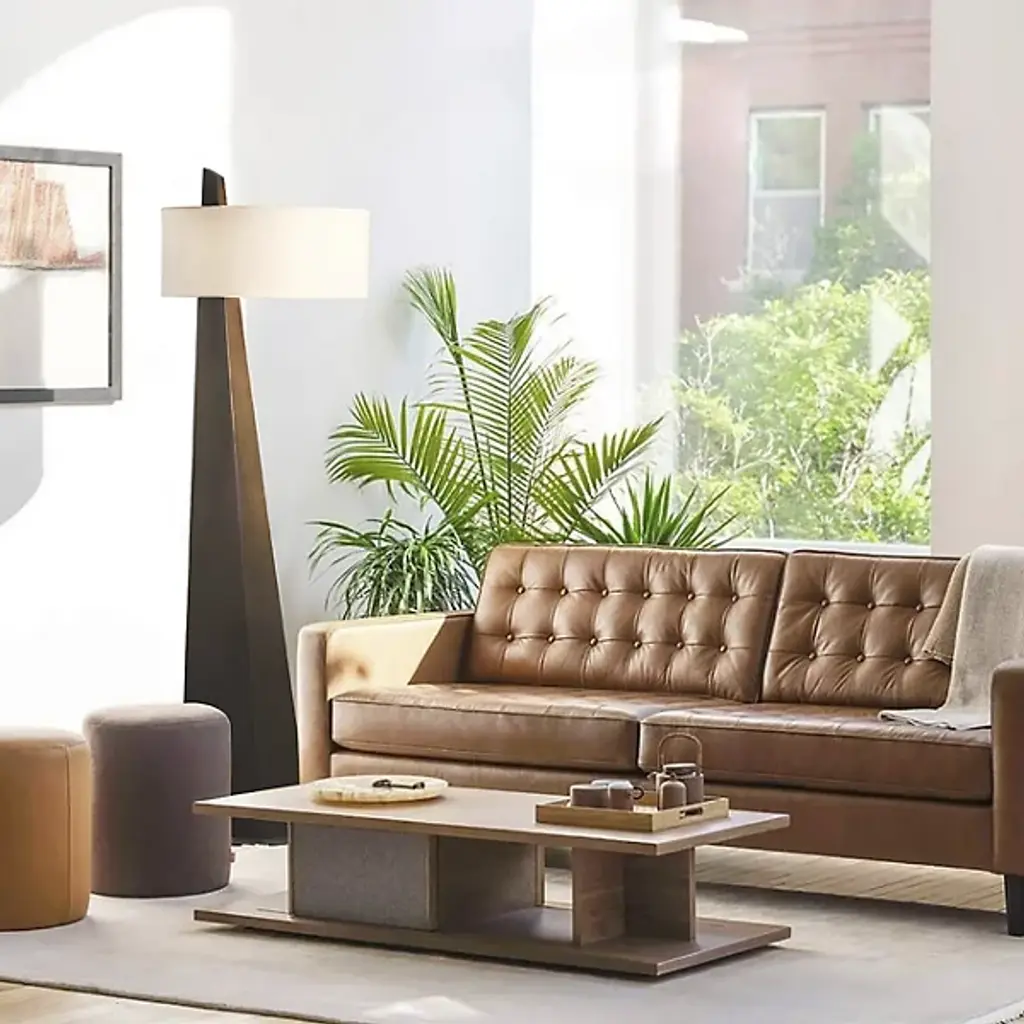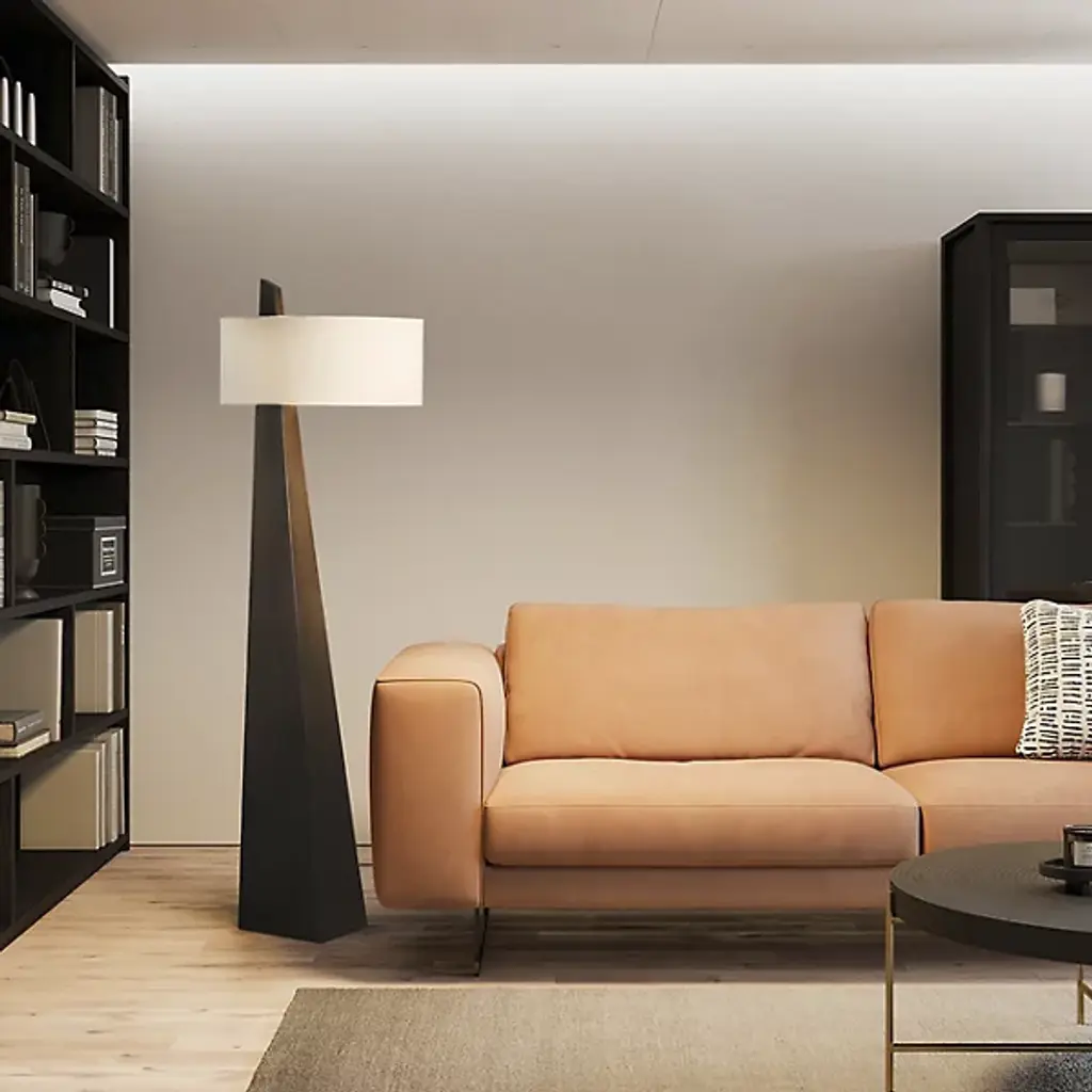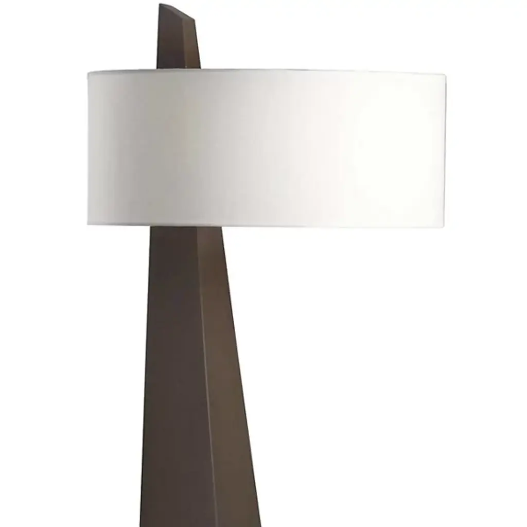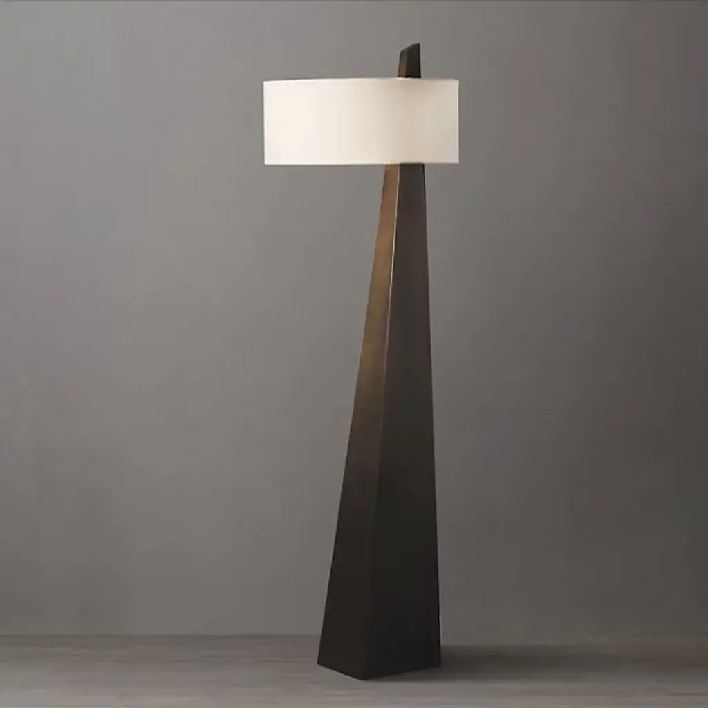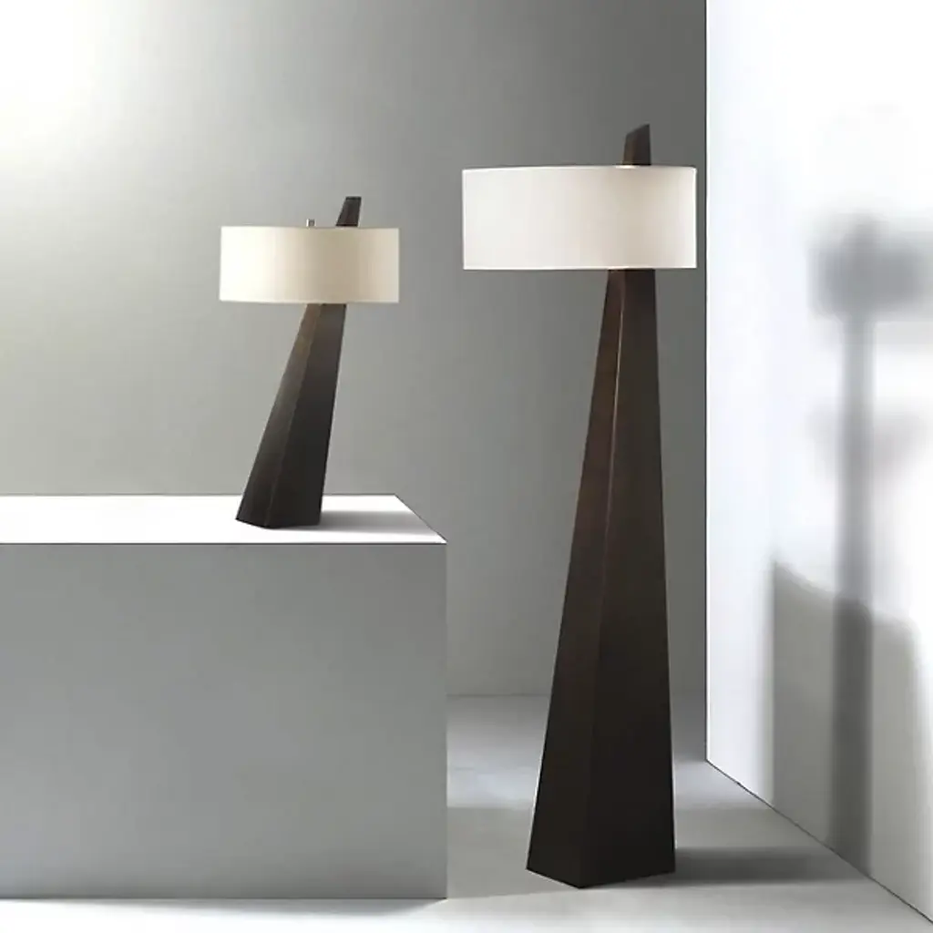 Striking like a chiseled stone pillar. Let the Obelisk Floor Lamp from Nova of California serve as the elegant, anchoring visual in your modern space. The piece stands up with a bold silhouette, underlined by its dynamic angles and robust proportions. Made from MDF, the obelisk-inspired body presents itself with a slick surface from top to bottom. The round shade on top surprises as it appears to float in the air. Made from linen, the shade complements the sharp structure with a soft touch. Light mellowing through the shade enhances the splendid silhouette and creates a radiant aura.