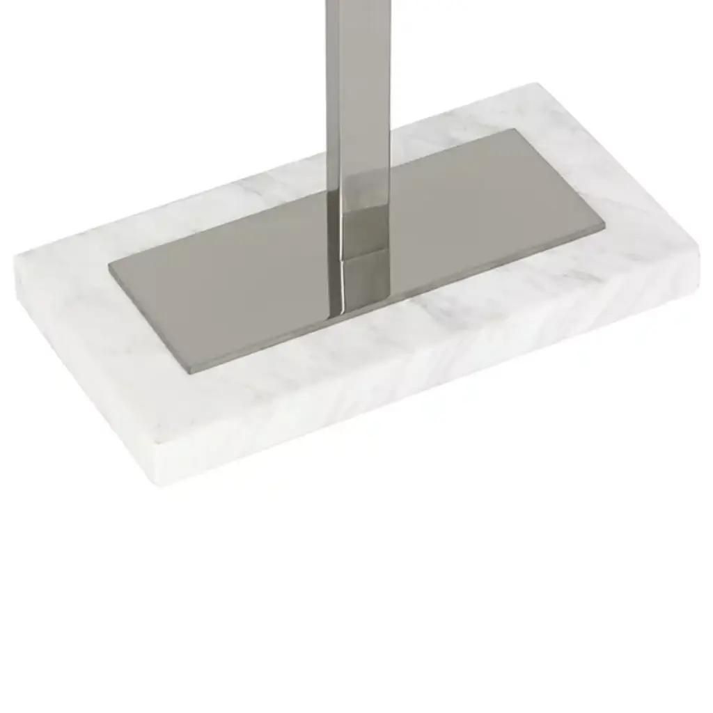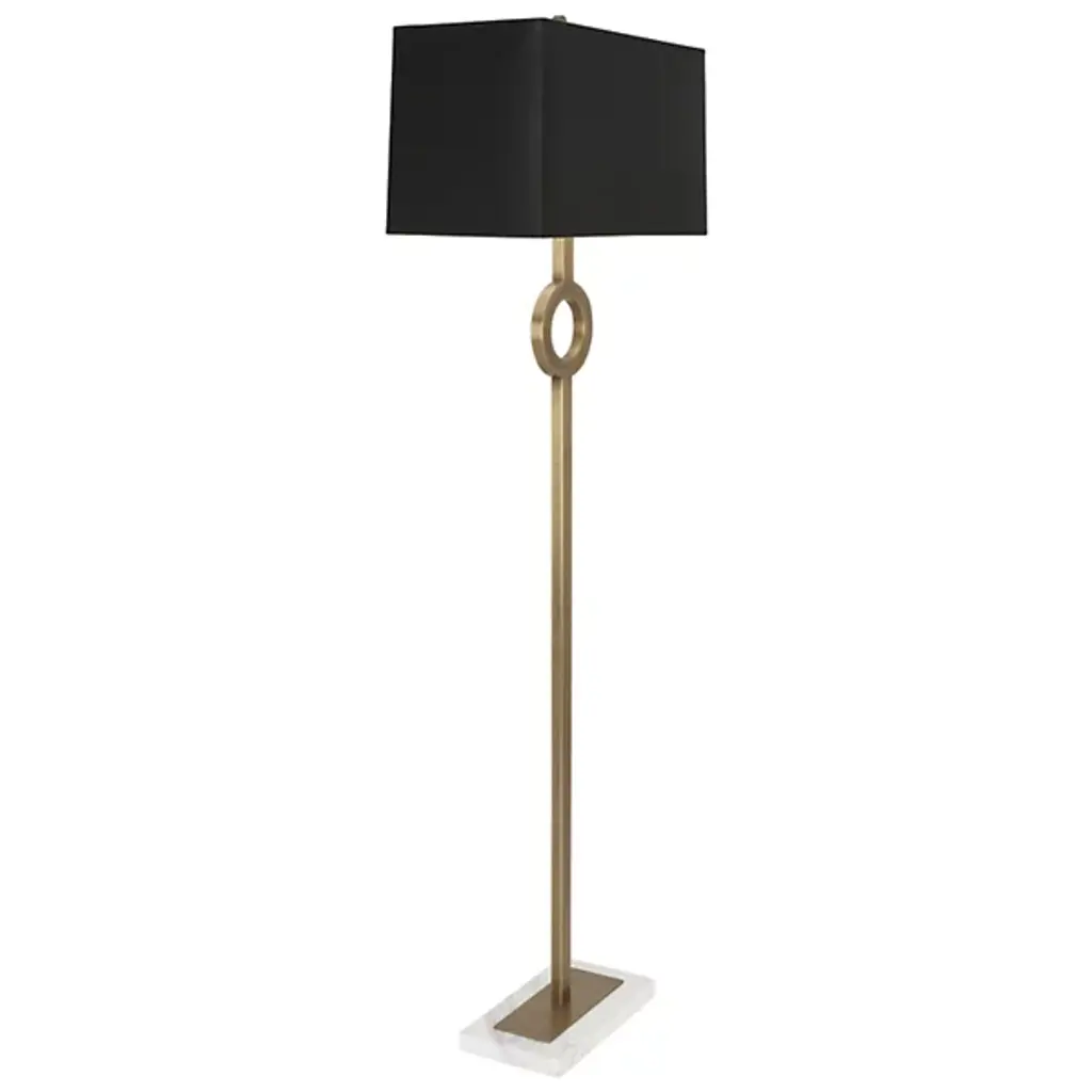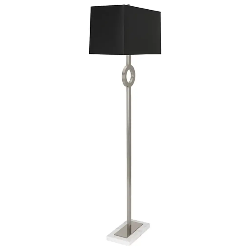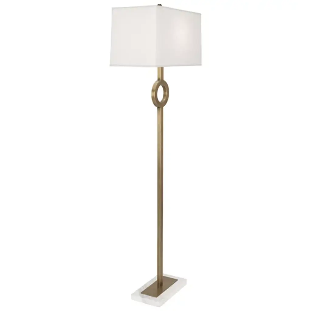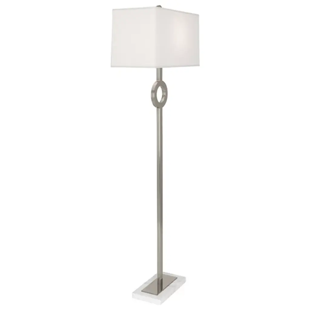 Reward your taste for the dramatic with the handsome silhouetting of the Oculus Floor Lamp from Robert Abbey. It stands tall in a sleek metal column and hypnotizes you in a circular oculus motif at the top. A marble base elevates the piece like a timeless pedestal; its swirling veins bring an artisanal quality to the clean colors of the column and shade. Its rectangular drum shade sweeps overhead, ushering light out in a bountiful glow.