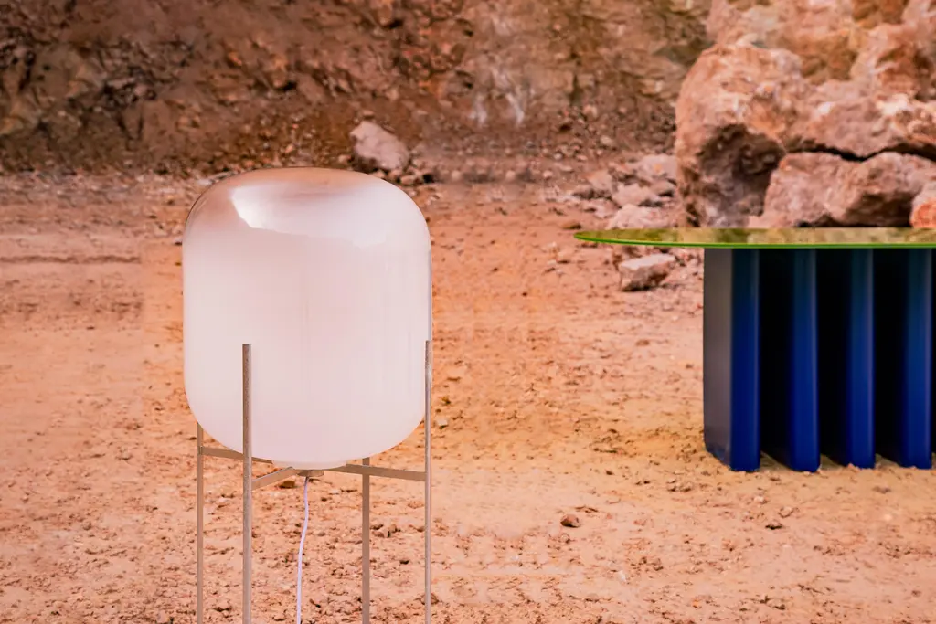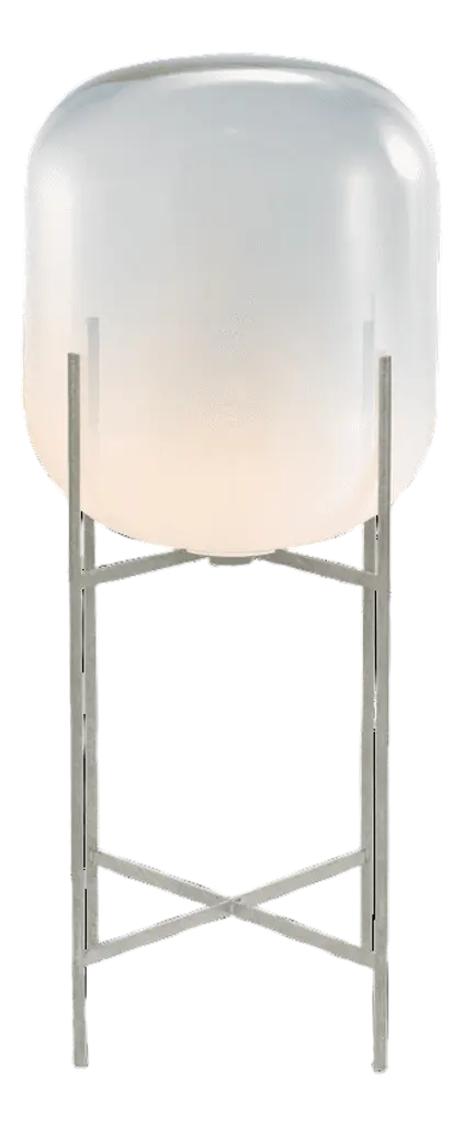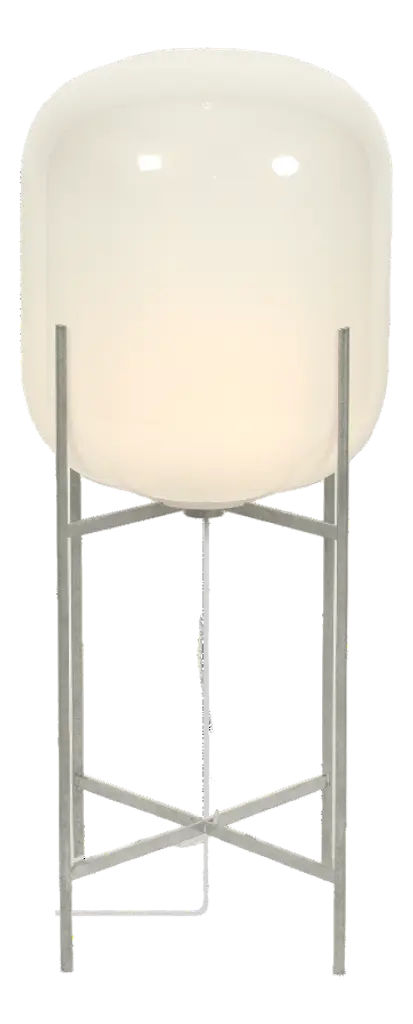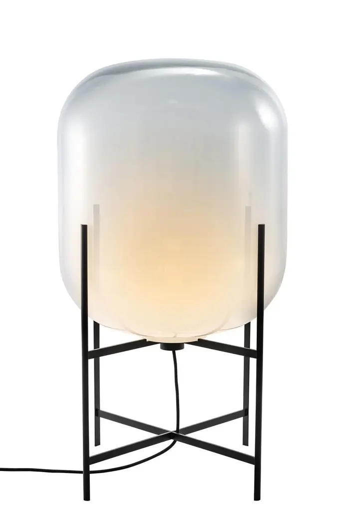 Designed by up-and-coming German designer Sebastian Herkner, Oda Medium is a floor lamp made from a handblown tinted glass barrel balancing on a simple and elegant metal structure. Made to resemble a reservoir of light, the design is inspired by the amazing pictures of water towers shot by German photographers Bernd and Hilla Becher. Please note that every piece is unique. Small bubbles and streaks, as well as minor variations in color and size, are characteristic of handmade glass. Labeled by Maker, European Plug (up to 250V).