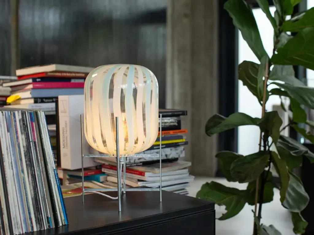 Oda Stripes is a Blown glass floor lamp.Already almost a classic, the new oda variant from Sebastian Herkner appears in stripes, based on the old glass blower’s Filigrana technique. By the filigree interplay of colors and glass, Oda Stripes radiates in different shades of everything but grey.Each piece is created from handblown, coloured glass and steel. Available in 4 variants.Small: LED filament, E14, 1 W, 105 lm, 2500 K warm white, 220–240 V, 50/60 Hz, 30 000 h, A++Dimensions bulb (mm): Ø 39 × 103 HMedium, inbetween, big: LED filament, E27, 4 W, 260 lm, 2100 K warm white, 220–240 V, 50/60 Hz, 30 000 h, A+Dimensions bulb (mm): Ø 64 × 146 HOda is big. Oda is a reservoir of light. Oda is a huge floor lamp for the living room - next to your sofa or armchair. Sebastian Herkner’s aim was to create a repository or a balloon full of light. The design is inspired by the amazing pictures of water towers shot by German photographers Bernd and Hilla Becher. A hand-blown, tinted glass barrel balances on a simple and elegant metal structure. The glass is available in four colors: opaque, grey, amber or aubergine.