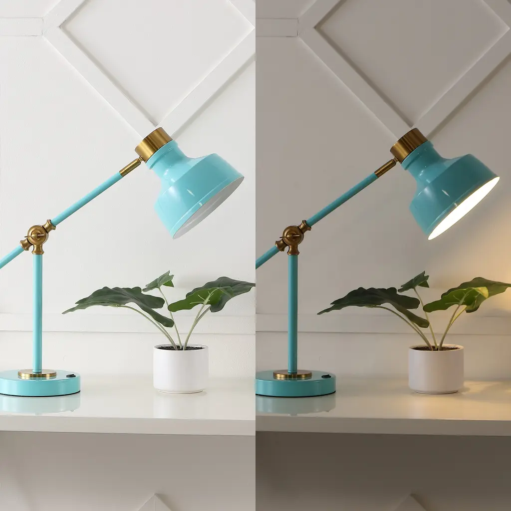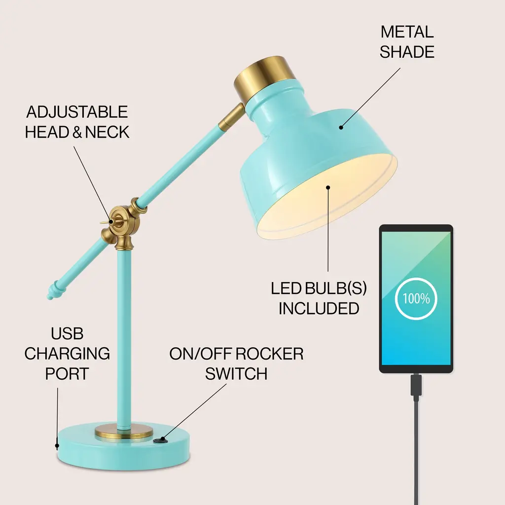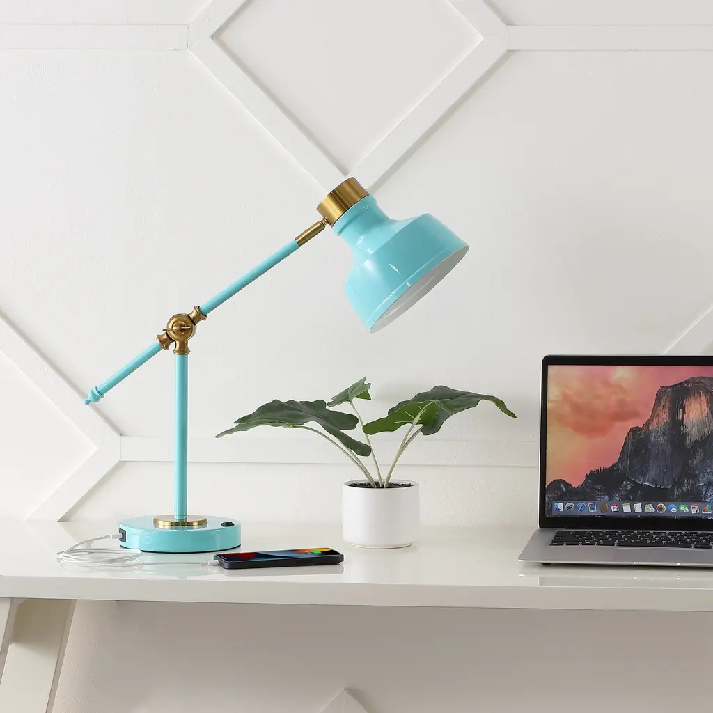 Odile 18.5" Classic Farmhouse Adjustable Cantilever Led Task Lamp With Usb Charging Port, By Jonathan Y - Cyan/brass Gold