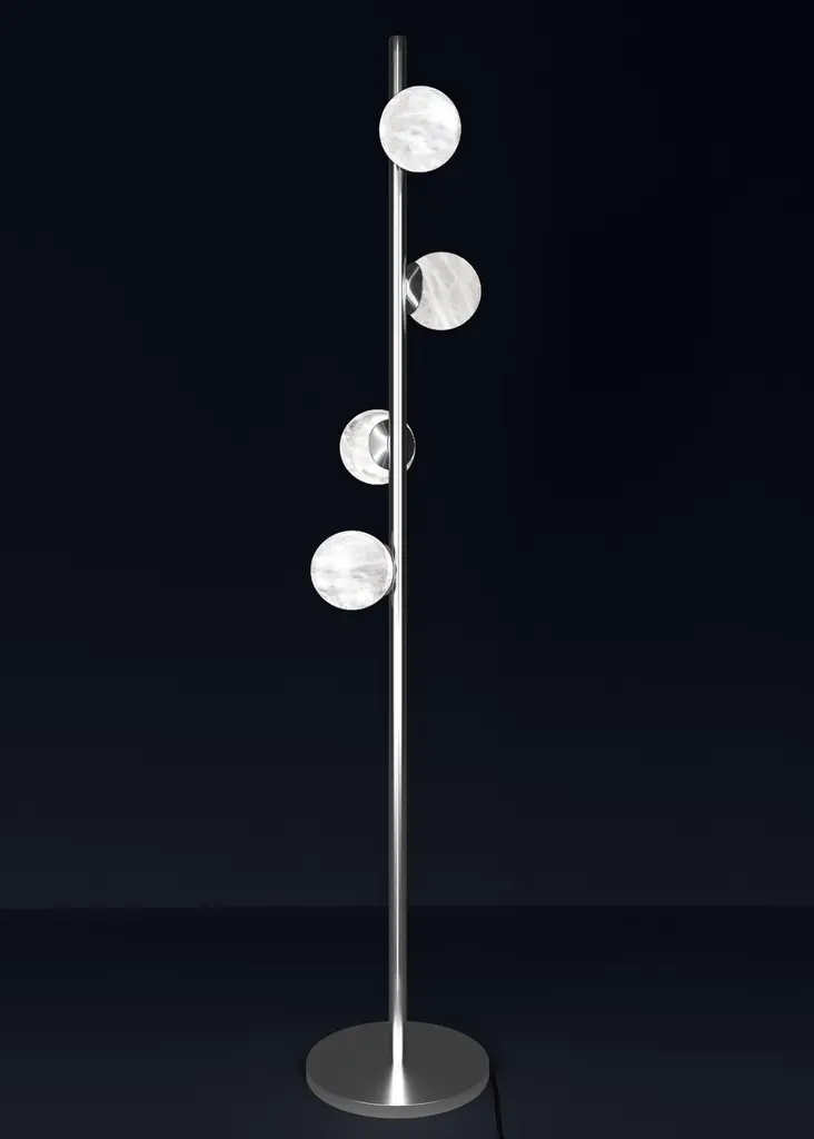 Ofione Shiny Silver Metal Floor Lamp by Alabastro ItalianoDimensions: D 50 x W 50 x H 170 cm.Materials: White alabaster and metal.Available in different finishes: Shiny Silver, Bronze, Brushed Brass, Matte Black, Ruggine of Florence, Brushed Burnished, Shiny Gold, Brushed Black, Freedom Green, Shiny Black and Copper. Please contact us.All our lamps can be wired according to each country. If sold to the USA it will be wired for the USA for instance.Ofione was the first king of the Titans and the heavens, his figure is nevertheless shrouded in mystery and little is known of his history. His grandeur was always associated with that of his wife Eurinome, and his life was characterized by this indissoluble bond. Likewise, this series is made up of horizontal and vertical lines that gently intertwine with precious alabaster spheres.After years of experience in the family business, which specializes in design and lighting, Riccardo and Alberto Ongarato found the brand Alabastro Italiano.Each project is conceived and designed to give a strong sign of recognizability and uniqueness. The use of precious materials such as alabaster, brass, leather and blown glass, worked by the skilful hands of our craftsmen, are combined to create “timeless” objects.From the depths of the earth to the light of the sun. ALABASTRO ITALIANO care about these extremes and transcends them in a creative dynamic that emphasizes simplicity and clean-cut lines.The company has created an entirely new project MADE IN ITALY, revolutionizing the previously existing collections into eternal and evergreen lighting elements. By designing clean-cut and original lines, built-in with the latest technology and continuously innovating, ALABASTRO ITALIANO has never lost sight of its goal: perfection. The result of this work is an extraordinary collection of alabaster lightings.Alabaster needs human hands to come to life. The charm of these stone objects comes from their uniqueness, from the fact that they come from the hand of those who has left a mark and a memory with their work, each grain makes each piece unique.Alabaster needs human hands to come to life. The charm of these stone objects comes from their uniqueness, from the fact that they come from the hand of those who has left a mark and a memory with their work, each grain makes each piece unique.Alabaster is a Material that leaves little traces of magic all around it. It is difficult to identify the exact point where the Material ends and its reflection begins. It is impossible to understand how far the light sinks in its soft transparency. It changes according to the positions in which it is placed, depending on the point of view. Alabaster is a compact and rare stone that lays down very precise laws requires a familiarity that only Italian craftsmen possess.Alabastro Italiano collaborates with each client to create a unique project. Starting from the advice for better architectural lighting, it brings its know-how, materials, design and creative inspiration to interior architects and interior designers.
