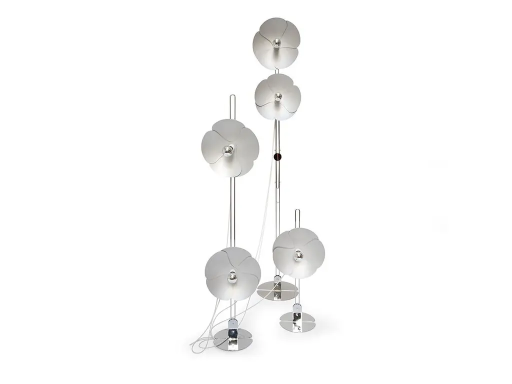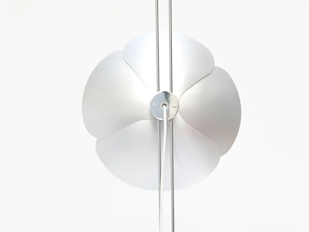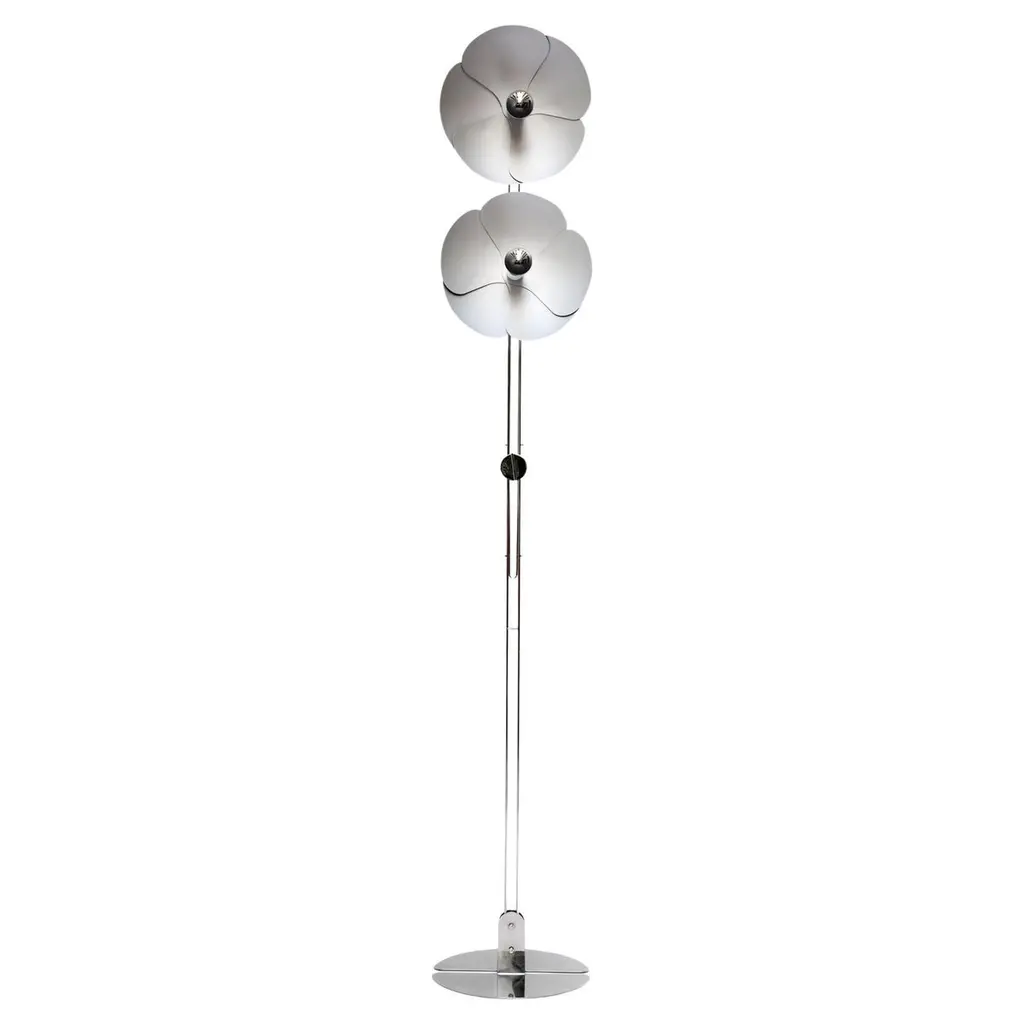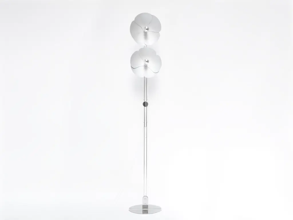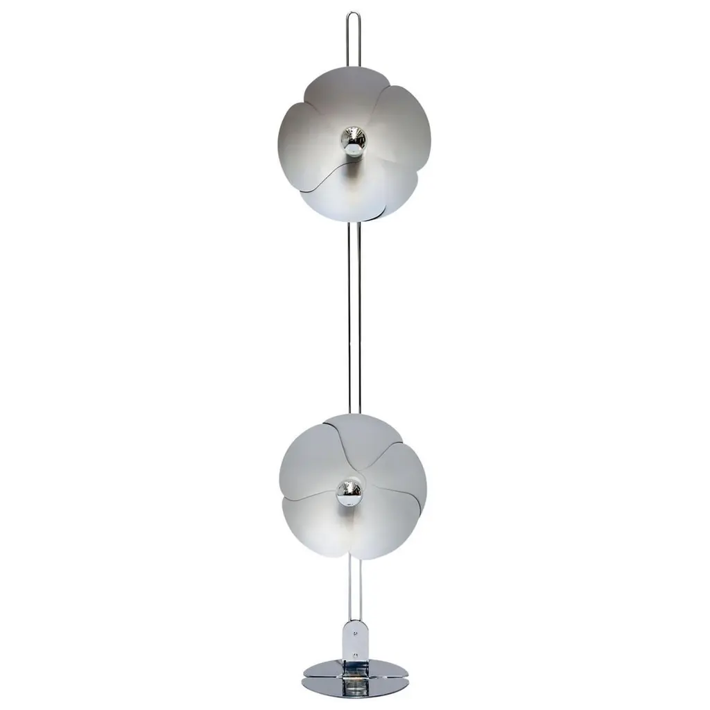 In 1967, Olivier Mourgue invented a flower shaped lighting device, made of aluminum petals fixed on two chromed metal wires, for sconces, ceiling lights and standing lamps.He used this silver caped bulb, which was new at the time, and produced very high quality reflected lighting.Third flower optional addition (sold with 2 flowers)Numbered editionUL CertifiedDelivered with authentication certificateMade in France. Measures: 225 cm.