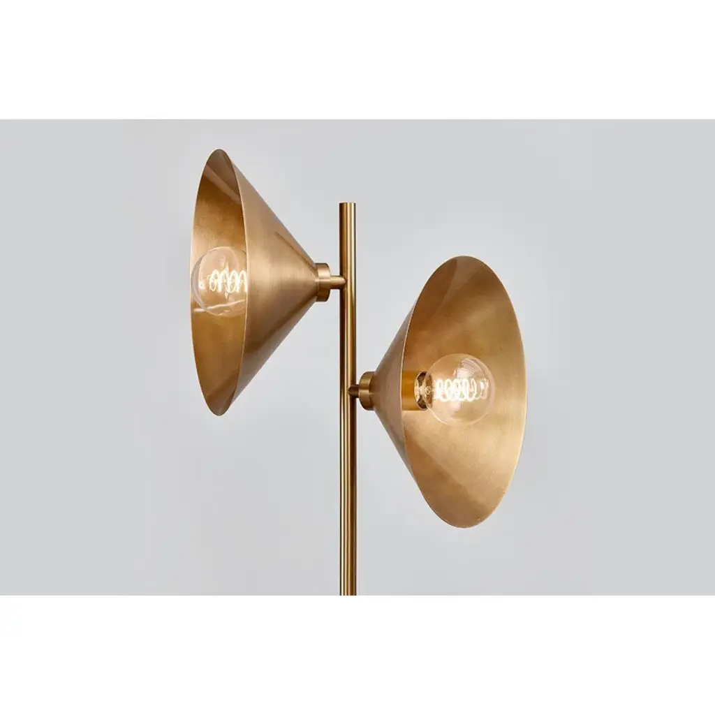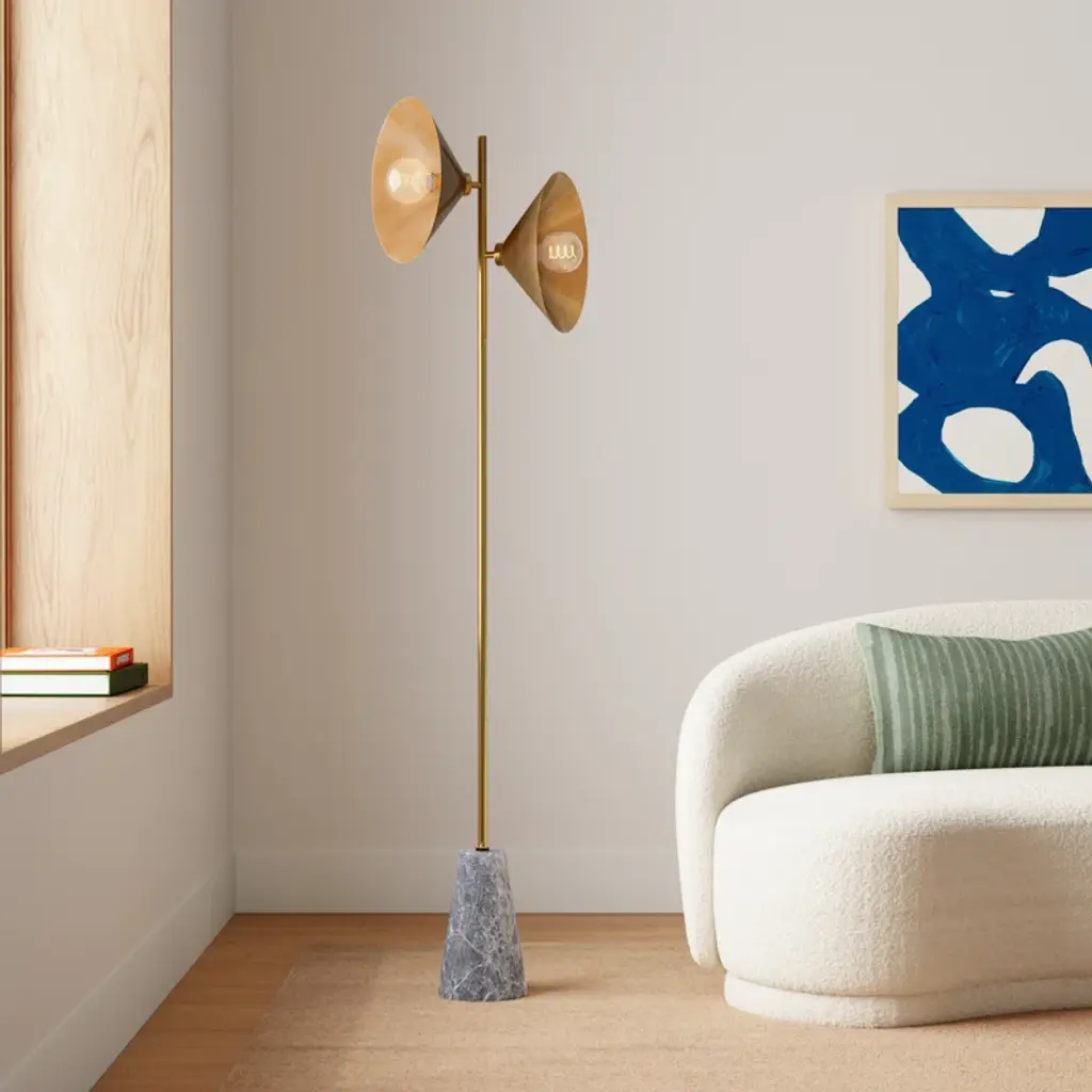 Omalley draws inspiration from mid-century design and finished in warm Patina Brass. A Honed Grey Emperador Marble base adds a chic touch to the fixture. Wherever it is placed, Omalley casts a wide spectrum of illumination, making an immediate impression.