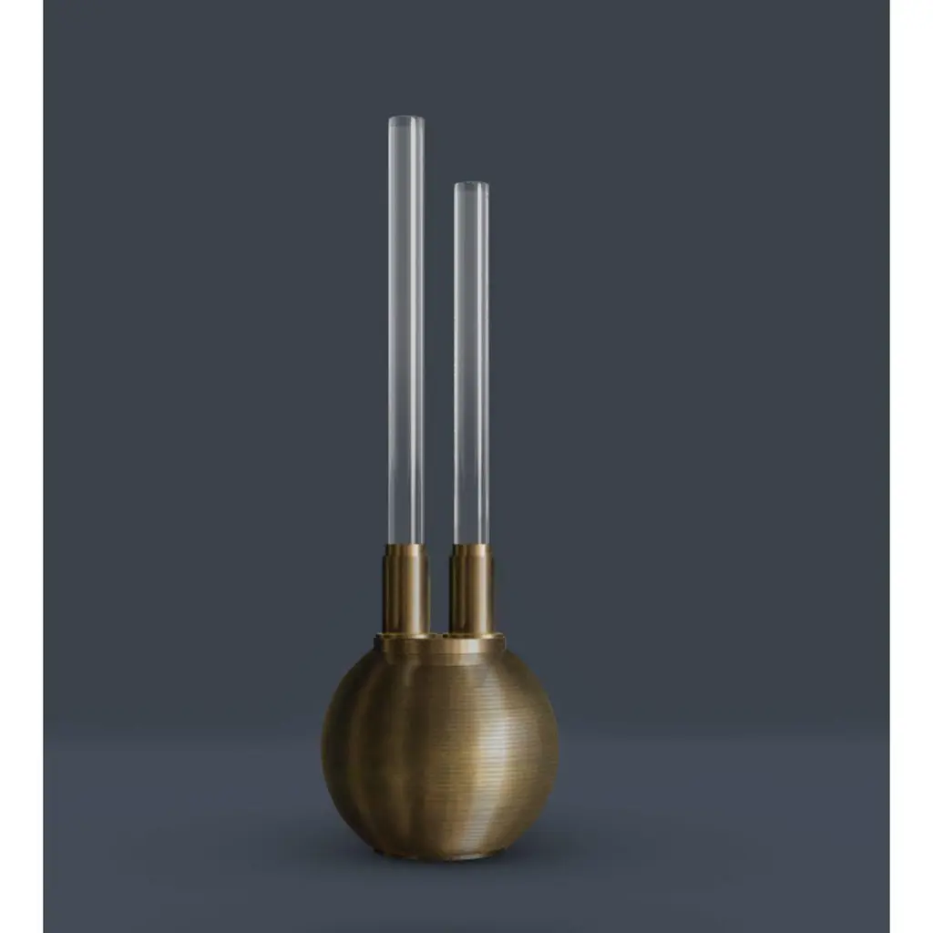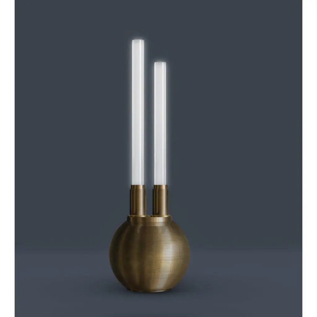 Omicron Sculptural Raw Brass and Frozen Glass Floor Lamp by Jan GarncarekDimensions: 40 x 127 cmMaterial: Raw brass, frozen glassHandcrafted by Jan Garncarek.Signed Information: weight: 15 kg / 33 lbvoltage: 120V, 240Vlamping: 2 X 1 2 W dimmable LED modulelumens: 800 Imkcolortemperature: 2700 Kled driver: onboardtightness class: IP 21certificates: CE approved, RoHSThe Omicron floor lamp evokes the balance of two forms: globe and glass tubes. Omicron lamp is made out of raw brass and frozen glass. Light is passing through a delicate glass vertical form. Brass globe is a solid base for this object. Hand crafted. Signed with a certificate.Jan Garncarek is an important contemporary designer, graduated from the Academy of Fine Arts in Warsaw. He gained extra qualifications at Politecnico di Milano. He has acquired professional experience in the design society. He took part in projects such as: design of visual information for the Museum of the history of Polish Jews, interior design project of the Polish cultural Institute in Tel Aviv, space arrangement of the Presidential Palace of Poland, interior design project of the Polish Embassy in Berlin and Skopje, Modernization of the Malachowski's Square in Warsaw. His process of designing is the state of researching, discovering and being curious of the world, making insightful observations and drawing sensible conclusions.All our lamps can be wired according to each country. If sold to the USA it will be wired for the USA for instance.
