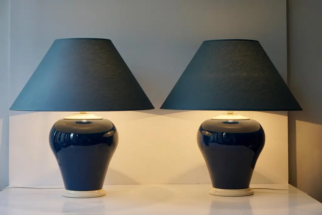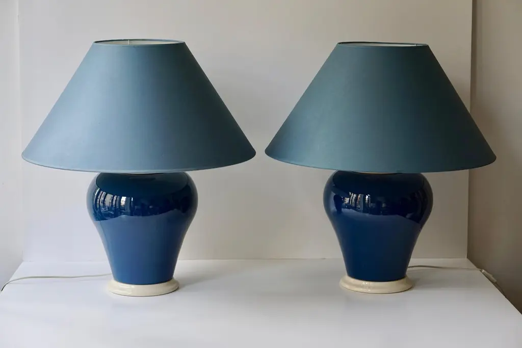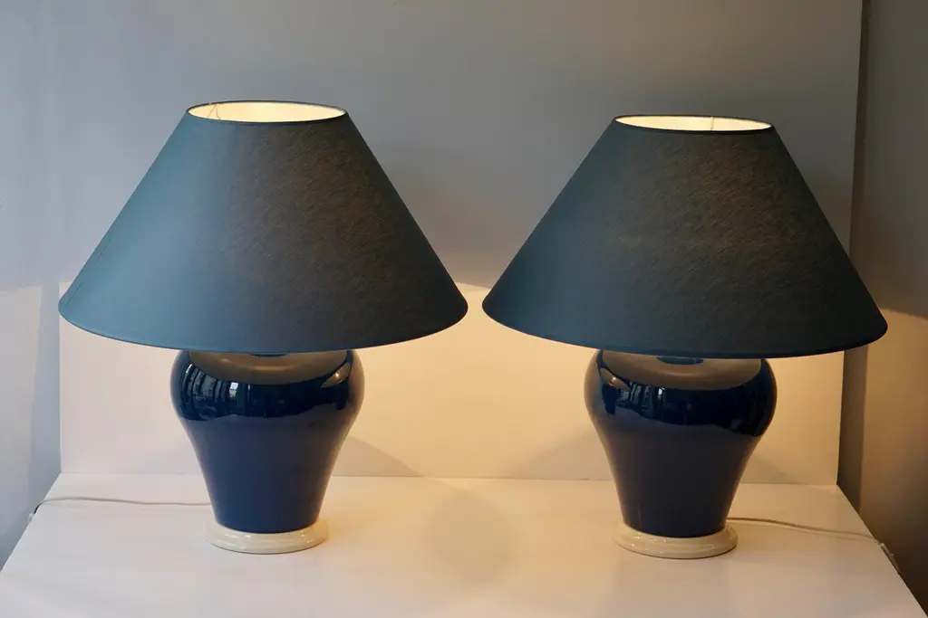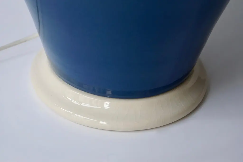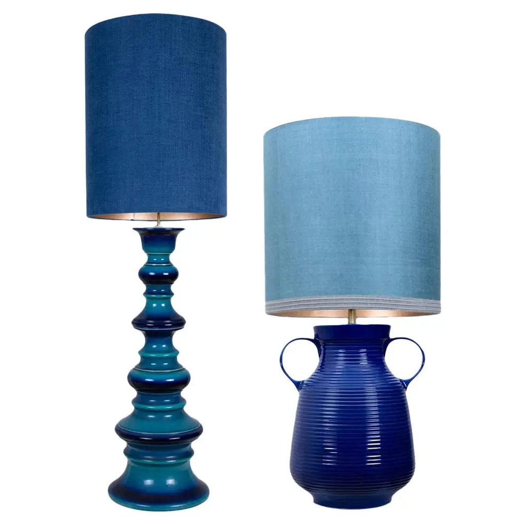 Two Italian ceramic table or floor lamps in white and blue.Measures: Diameter base 30 cm. Diameter shade 65 cm.Height base without socket 36 cm and with socket 42 cm.Total height with shade 70 cm.