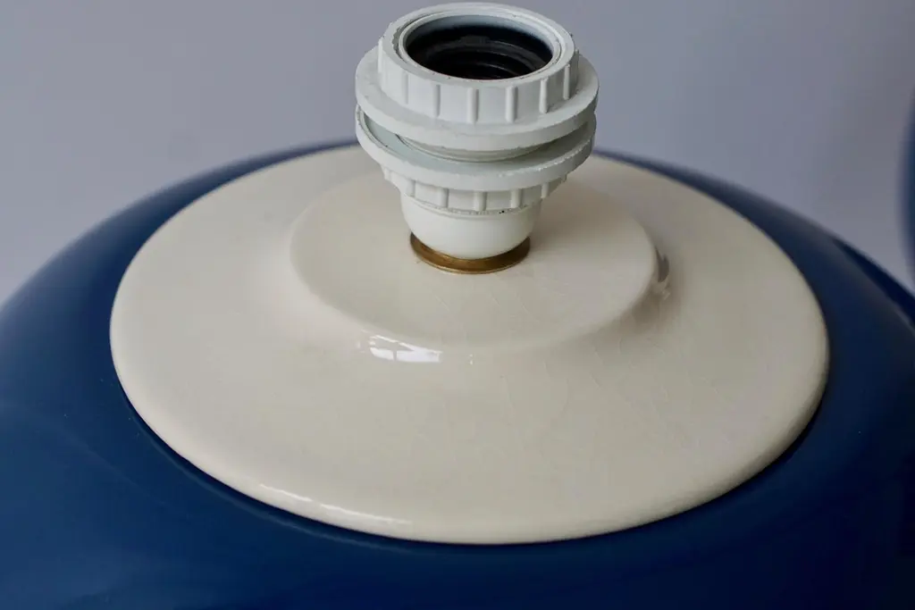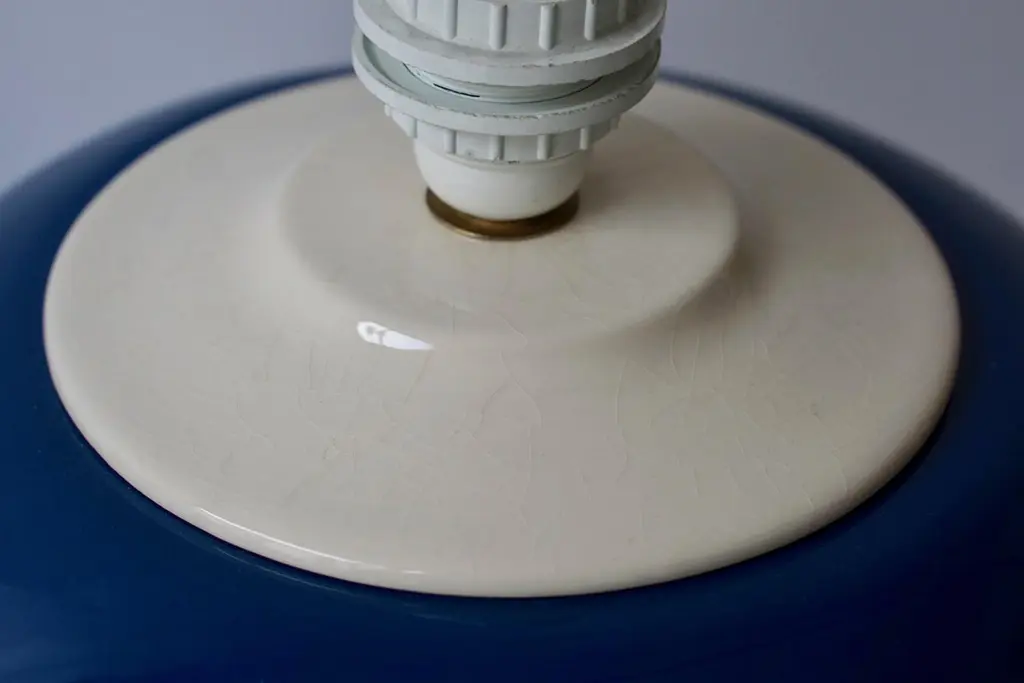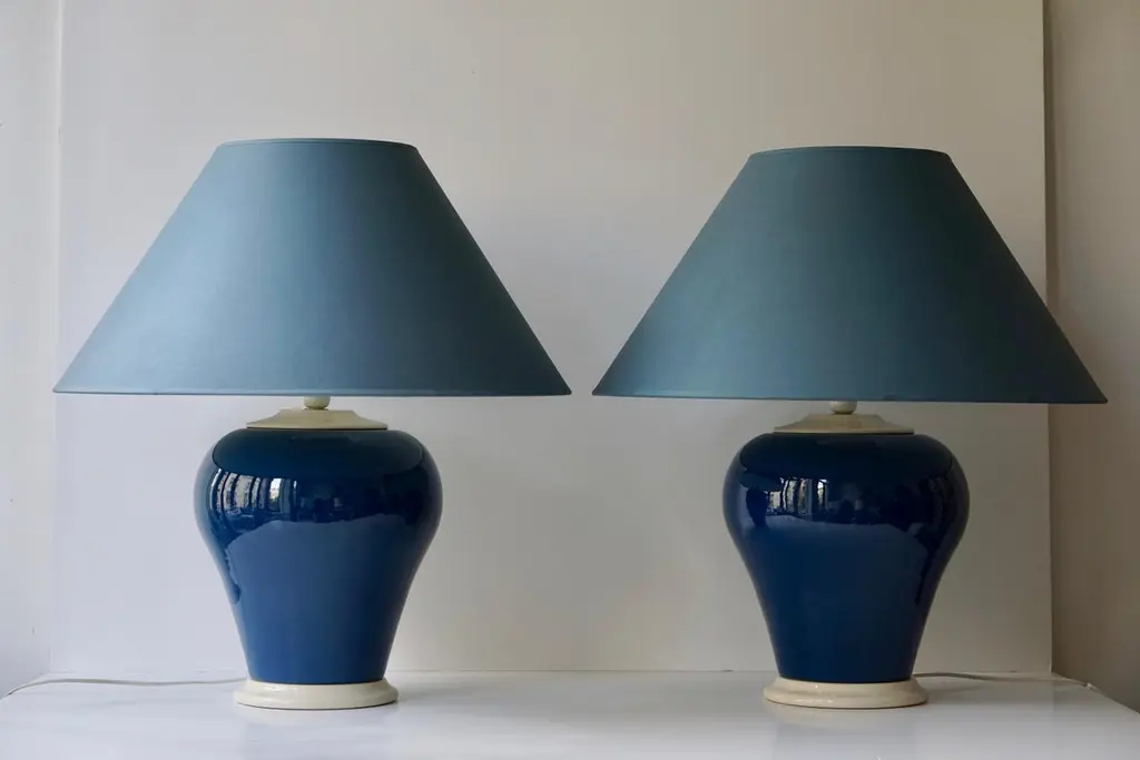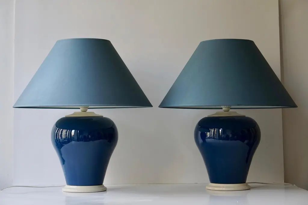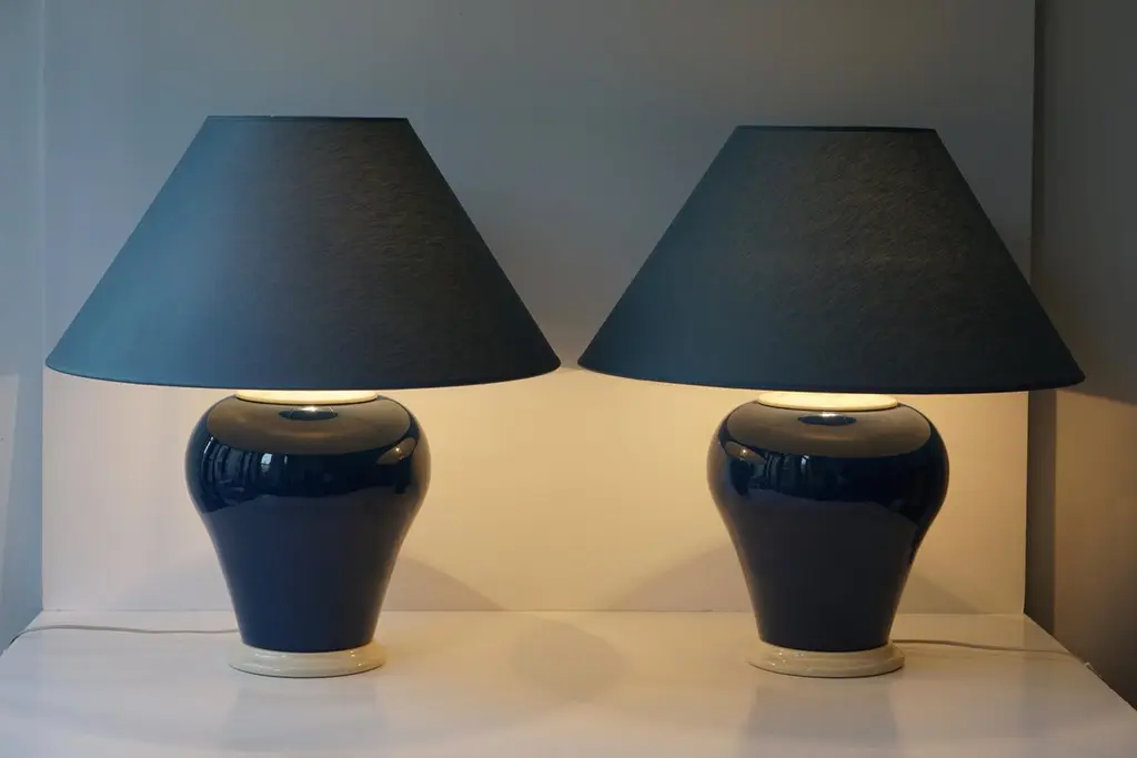 Two Italian ceramic table or floor lamps in white and blue.Measures: Diameter base 30 cm. Diameter shade 65 cm.Height base without socket 36 cm and with socket 42 cm.Total height with shade 70 cm.